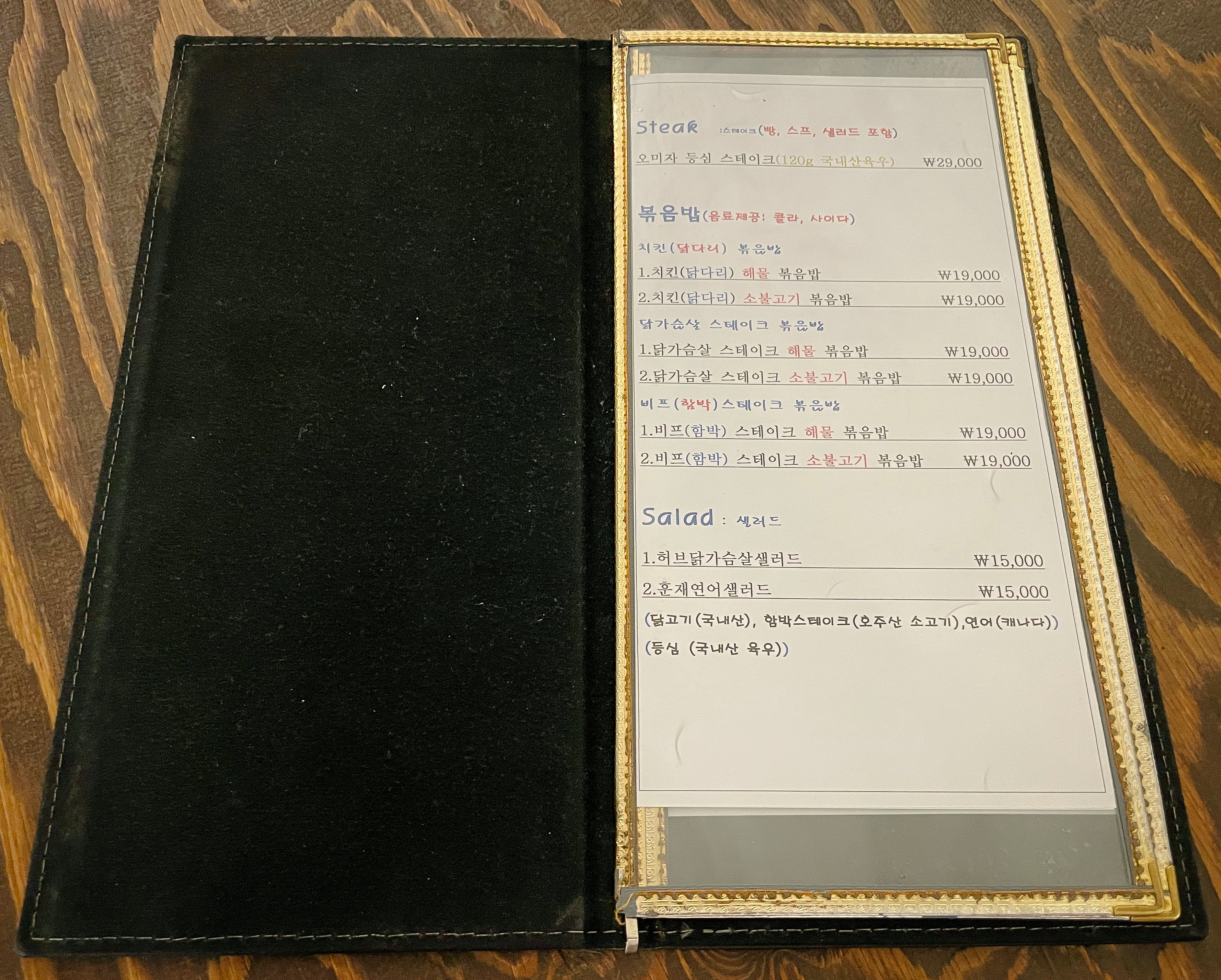 우선 안내받은 자리로 가서 메뉴를 살펴보았습니다. 오미자등심스테이크, 치킨해물볶음밥, 치킨소불고기볶음밥, 닭가슴살스테이크해물볶음밥, 닭가슴살스테이크소불고기볶음밥, 비프스테이크해물볶음밥, 비프스테이크소불고기볶음밥, 허브닭가슴살샐러드, 훈제연어샐러드 그밖에 카페 음료들과 와인, 맥주, 빵 등을 판매하고 있었습니다. 저는 사장님 추천 메뉴인 비프스테이크해물볶음밥을 주문했습니다.