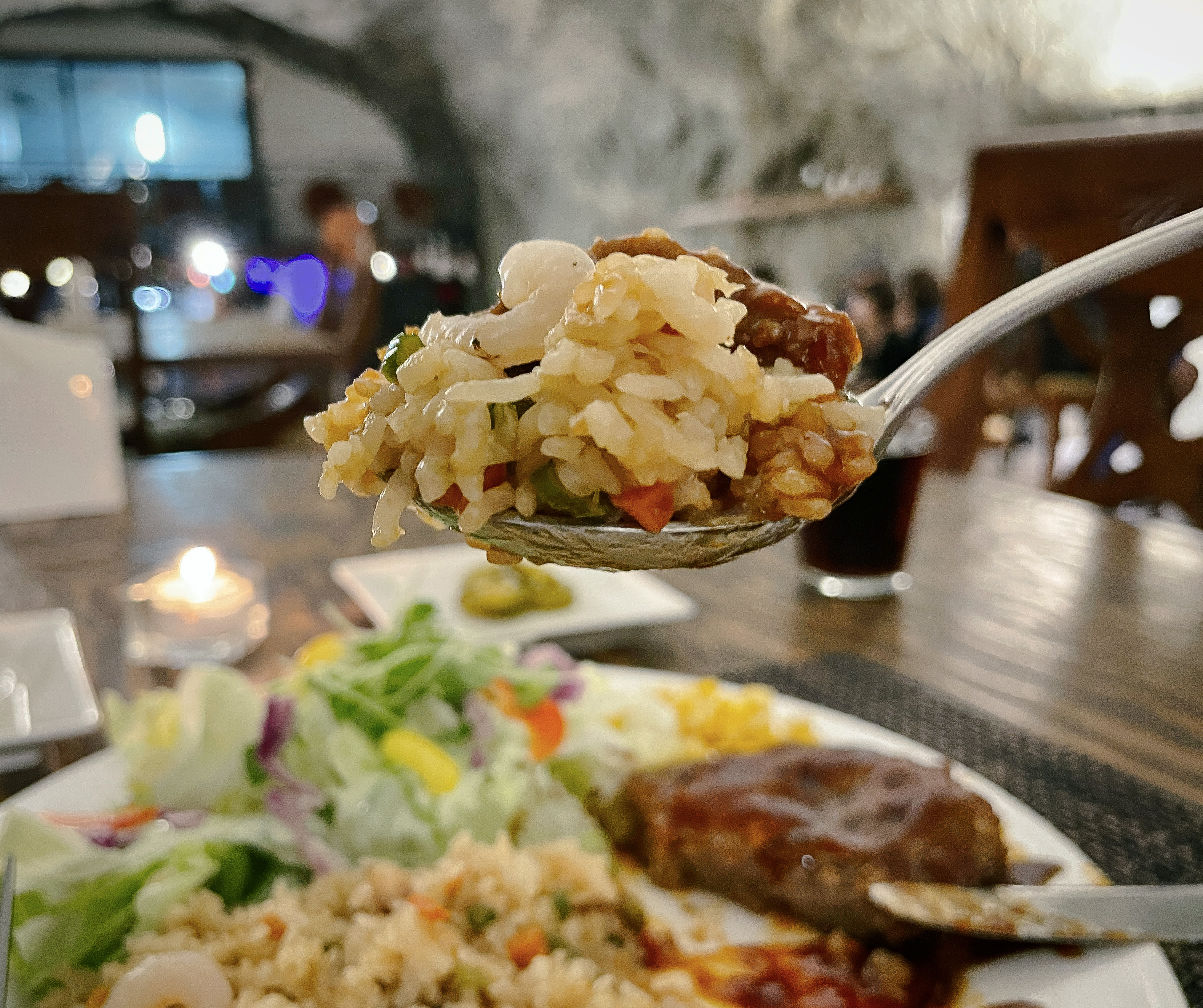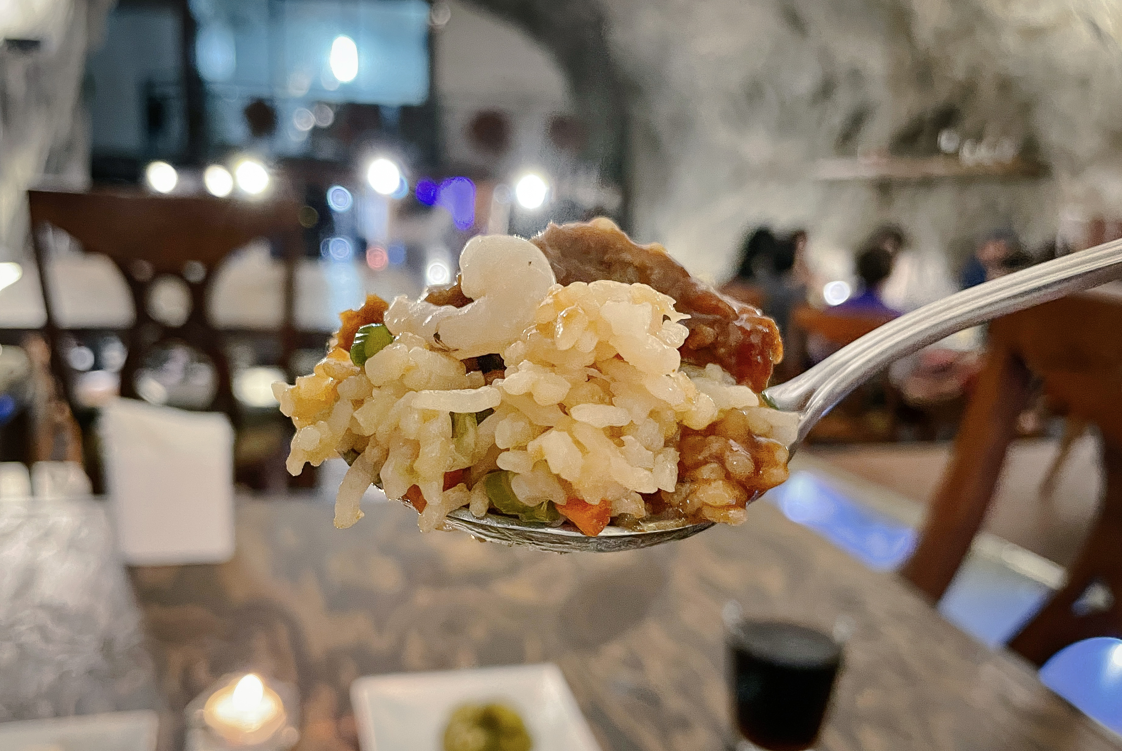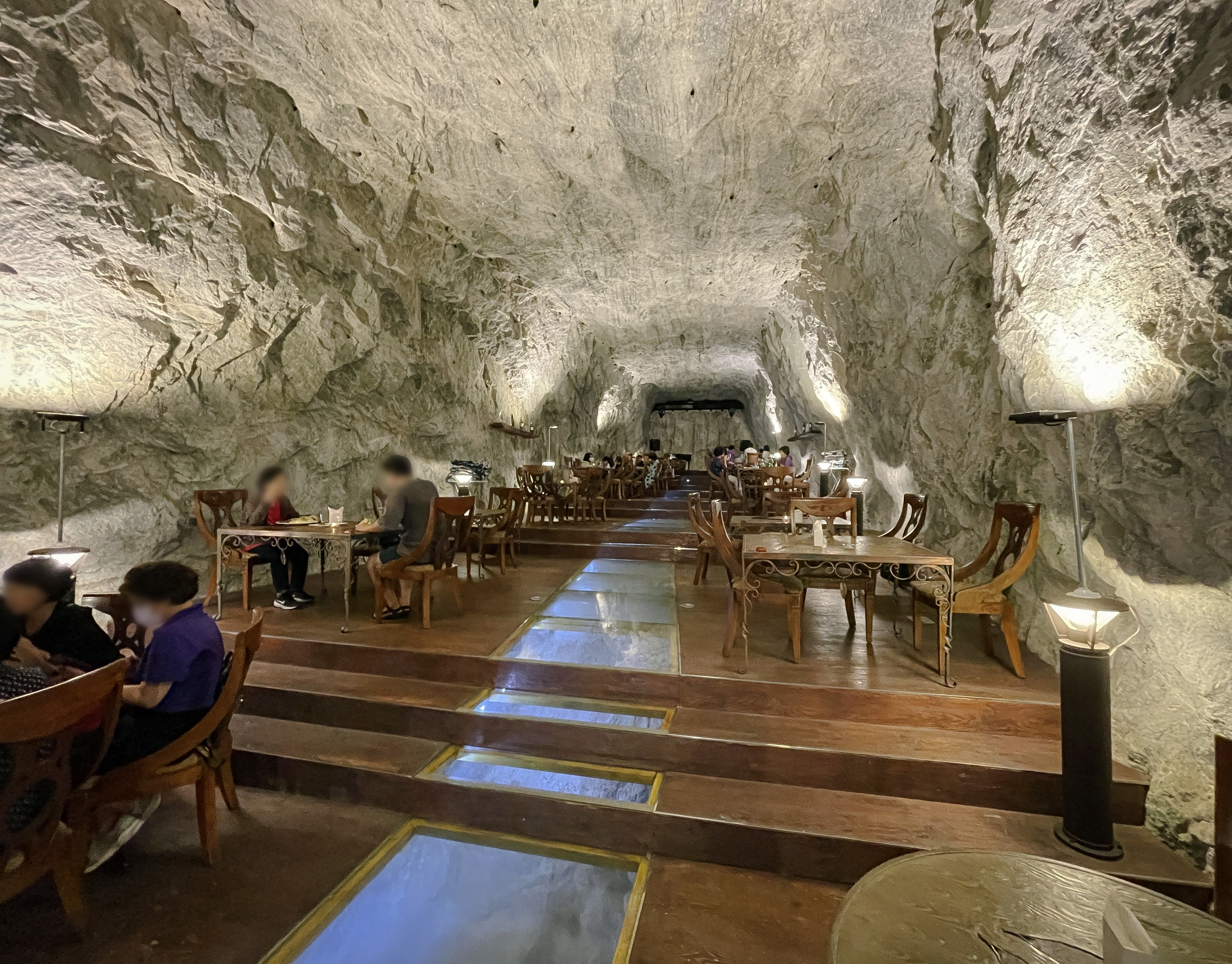 이 공간은 동굴 속에 은은한 조명들과 크고 널찍한 테이블에 나무로 층계를 만들어두어 고급스러운 레스토랑 느낌이 났습니다. 가장 높은 곳에는 간단한 공연을 할 수 있는 무대도 마련되어 있었는데, 이곳 스피커를 통해 나오는 음악은 동굴의 특이한 구조에 의해 공간을 울리고 있었습니다.