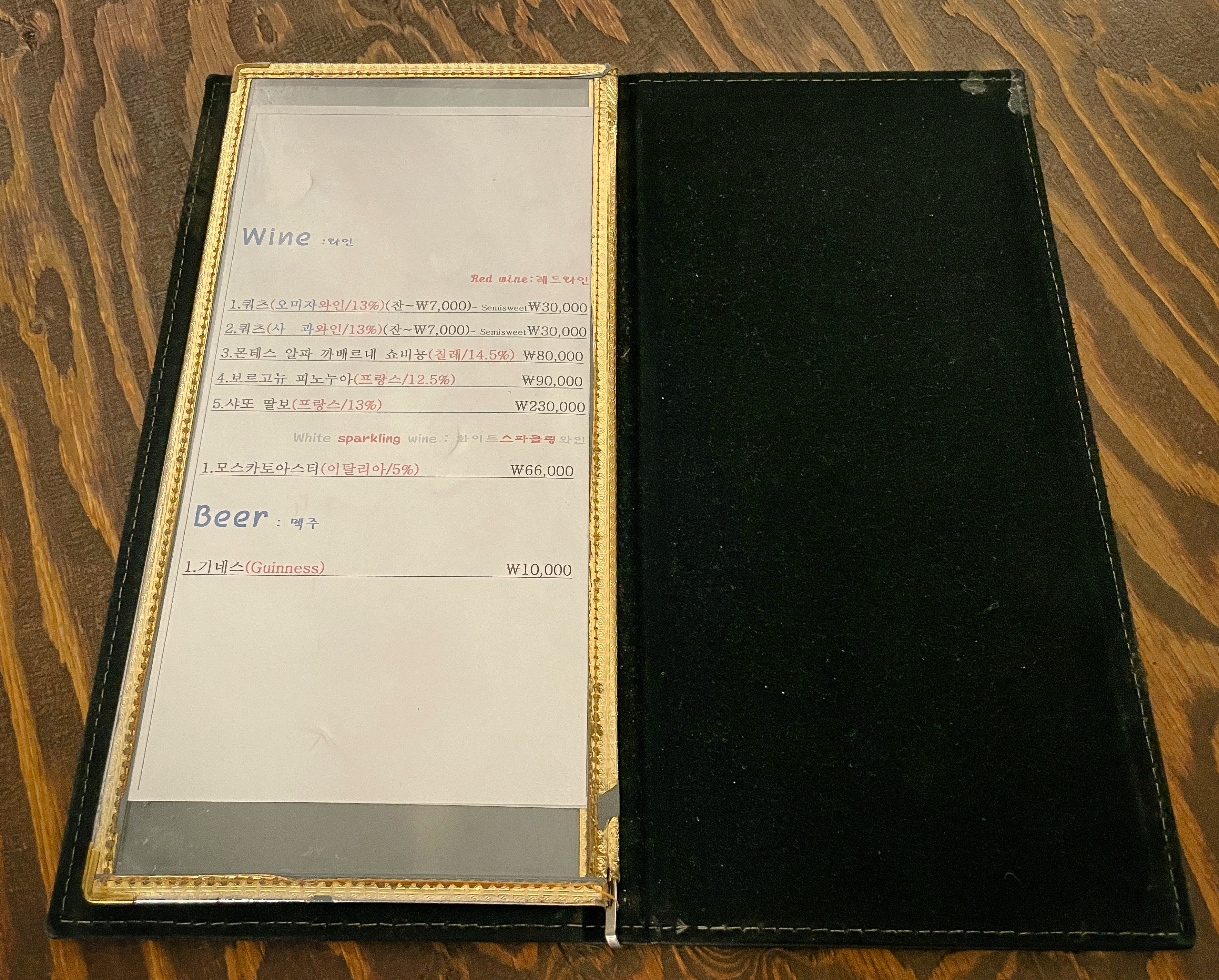 우선 안내받은 자리로 가서 메뉴를 살펴보았습니다. 오미자등심스테이크, 치킨해물볶음밥, 치킨소불고기볶음밥, 닭가슴살스테이크해물볶음밥, 닭가슴살스테이크소불고기볶음밥, 비프스테이크해물볶음밥, 비프스테이크소불고기볶음밥, 허브닭가슴살샐러드, 훈제연어샐러드 그밖에 카페 음료들과 와인, 맥주, 빵 등을 판매하고 있었습니다. 저는 사장님 추천 메뉴인 비프스테이크해물볶음밥을 주문했습니다.