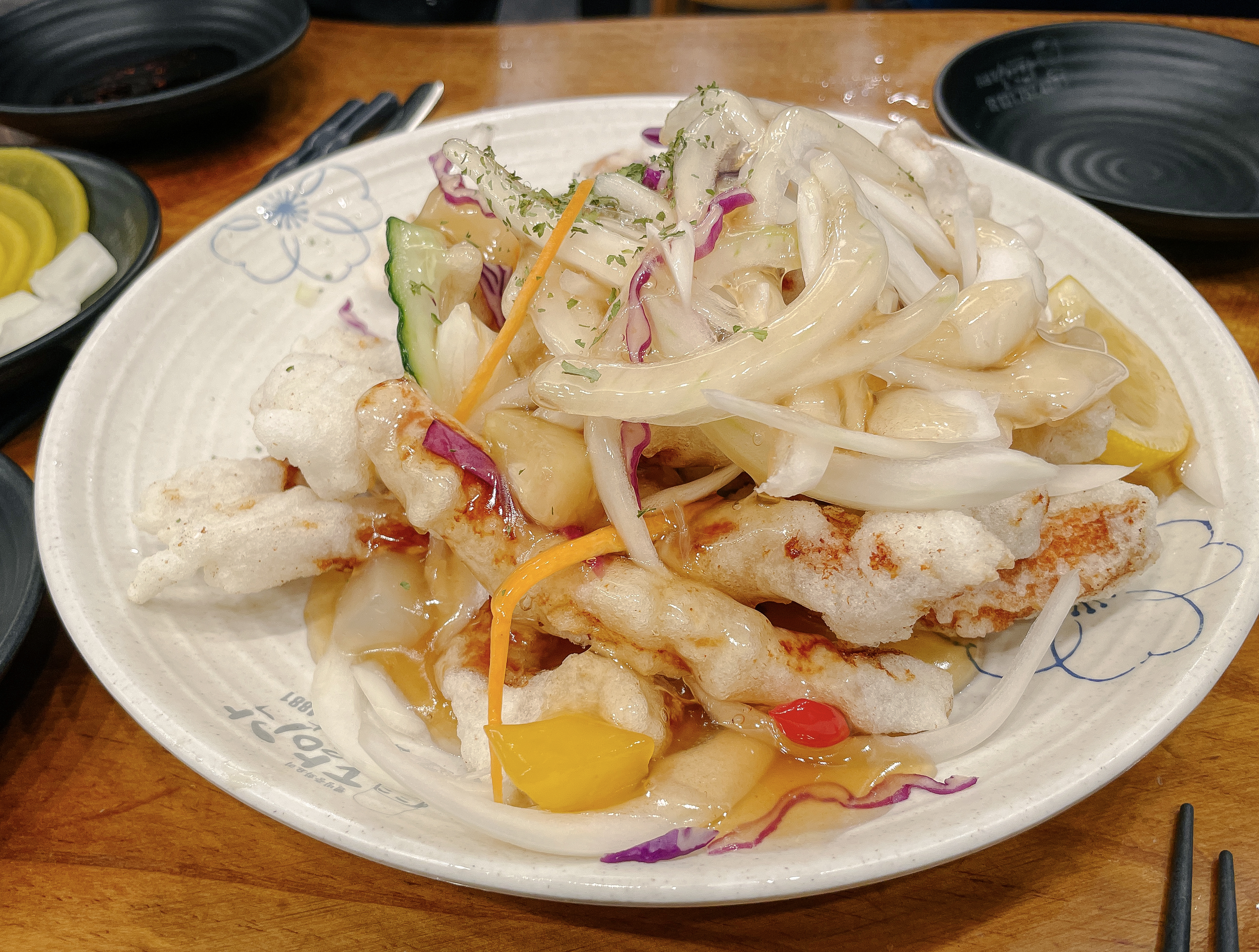 저희는 찹쌀등심탕수육과 삼선짬뽕을 주문하였습니다. 먼저 찹쌀 등심 탕수육이 나왔는데, 탕수육이 바삭바삭하게 튀겨져 맛이 좋았습니다. 소스는 새콤달콤했는데, 탕수육의 바삭함을 방해하지도 않고 맛이 좋았습니다.