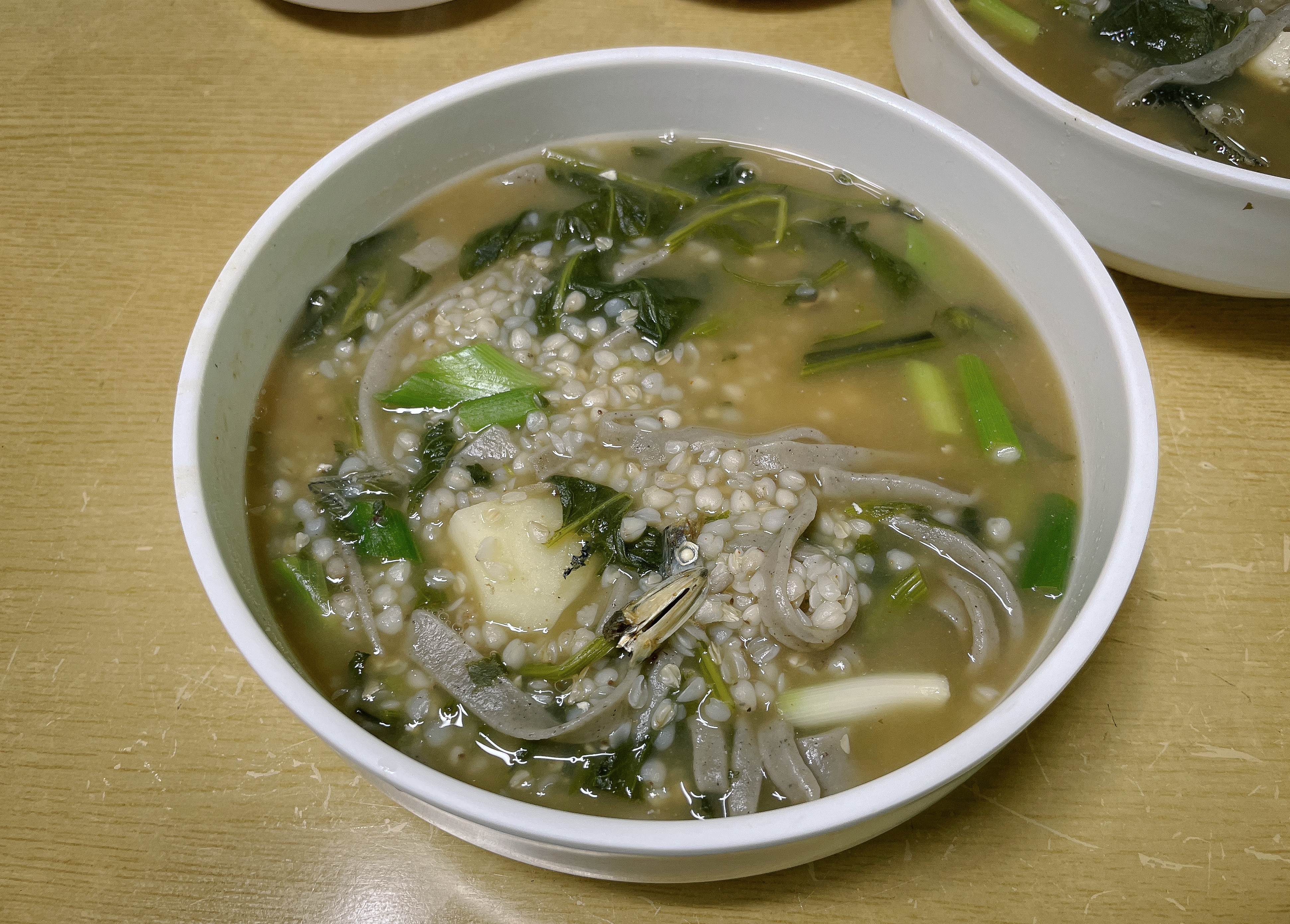 메밀국죽이 준비되는 동안 할머니께 메밀국죽이 어떤 메뉴인지 여쭤보았습니다. 메밀국죽은 메밀쌀과 국수, 곤드레나물, 감자, 두부, 대파 등을 멸치육수와 된장으로 맛을 낸 국물에 푹 끓여 내어 주는 메뉴였습니다. 이 메밀국죽은 정선의 향토음식으로 강원도 지역에서만 맛볼 수 있다는 것이 특징이었습니다.