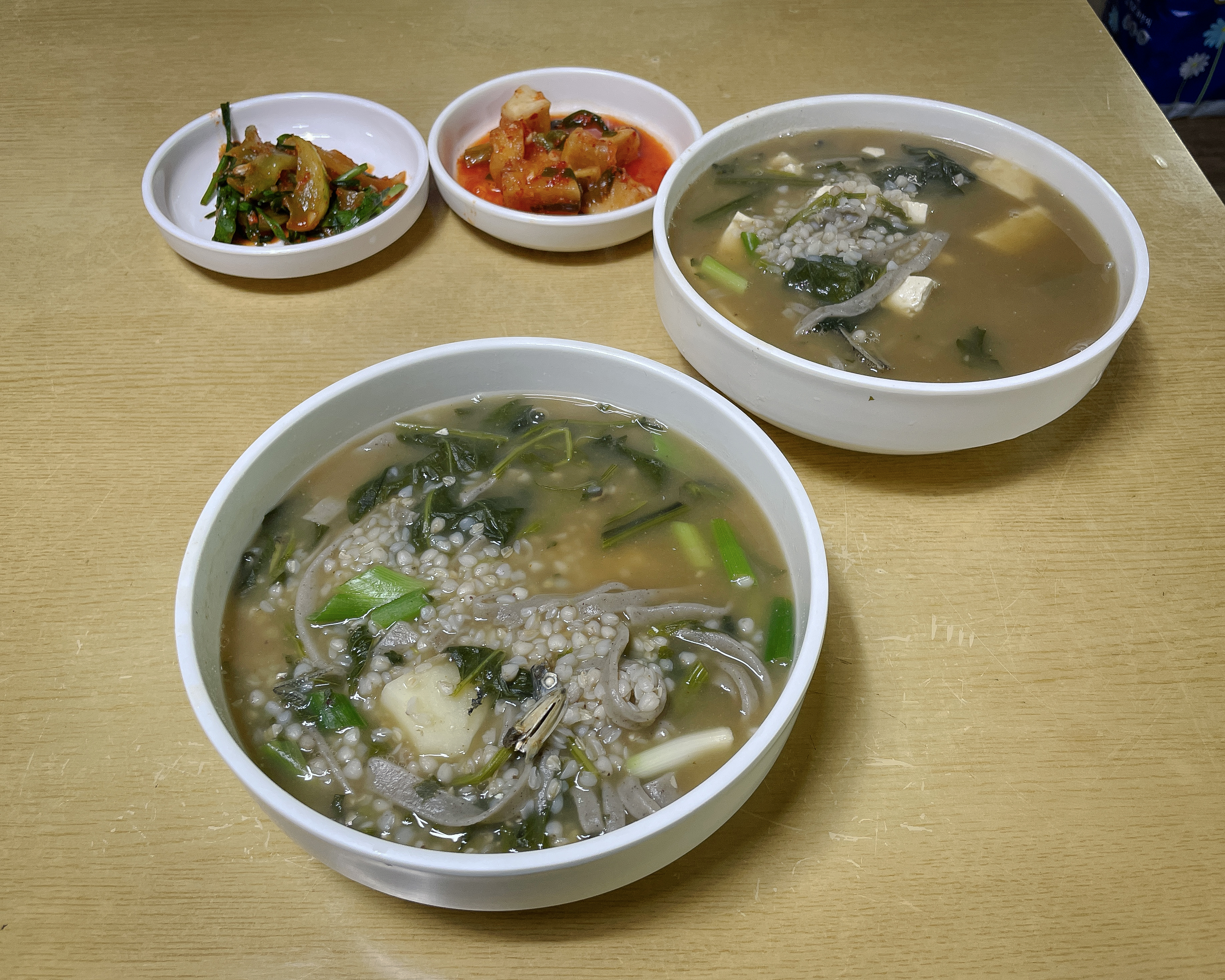 메밀국죽이 준비되었고, 전날 저녁을 굶은 터라 2인분 양이 많지만 충분히 먹을 수 있어 보이더라고요. 고마루의 메밀국죽은 어머니께서 종종 해주시던 시금치 된장국과 비슷한 느낌이었는데, 구수한 된장과 멸치로 맛을 낸 육수가 시골집(?)을 생각나게 하는 맛이었습니다. 같이 내어주신 오이무침과 무김치도 간이 아주 잘 배어있어 맛있었습니다.