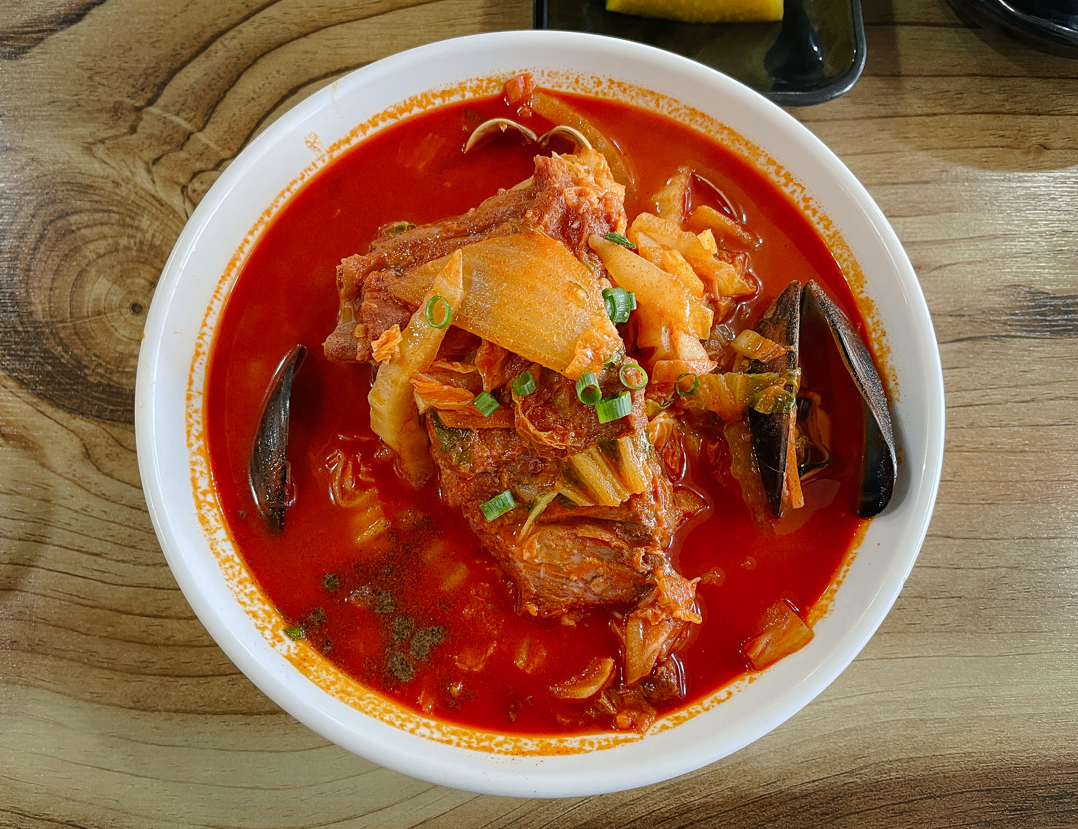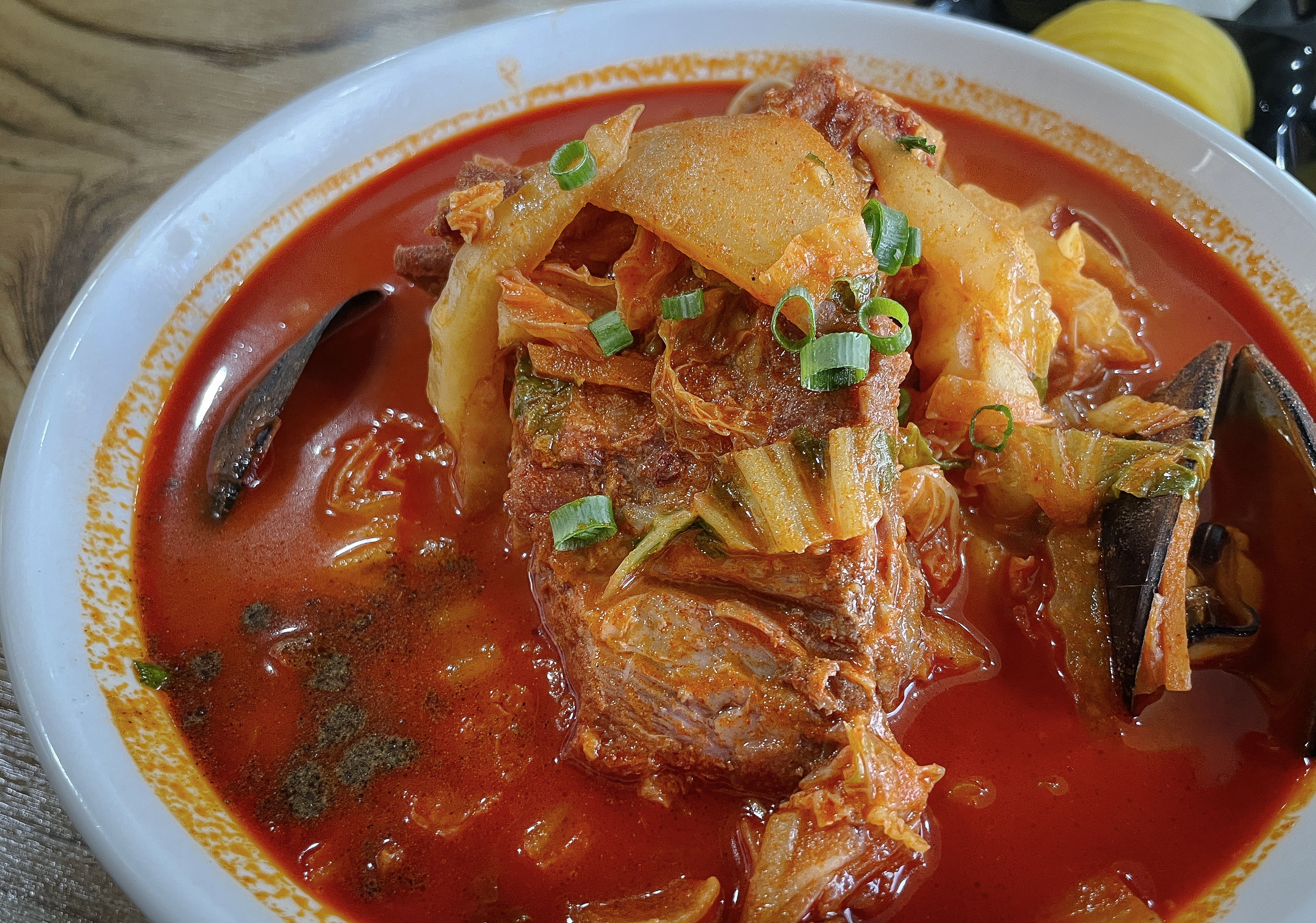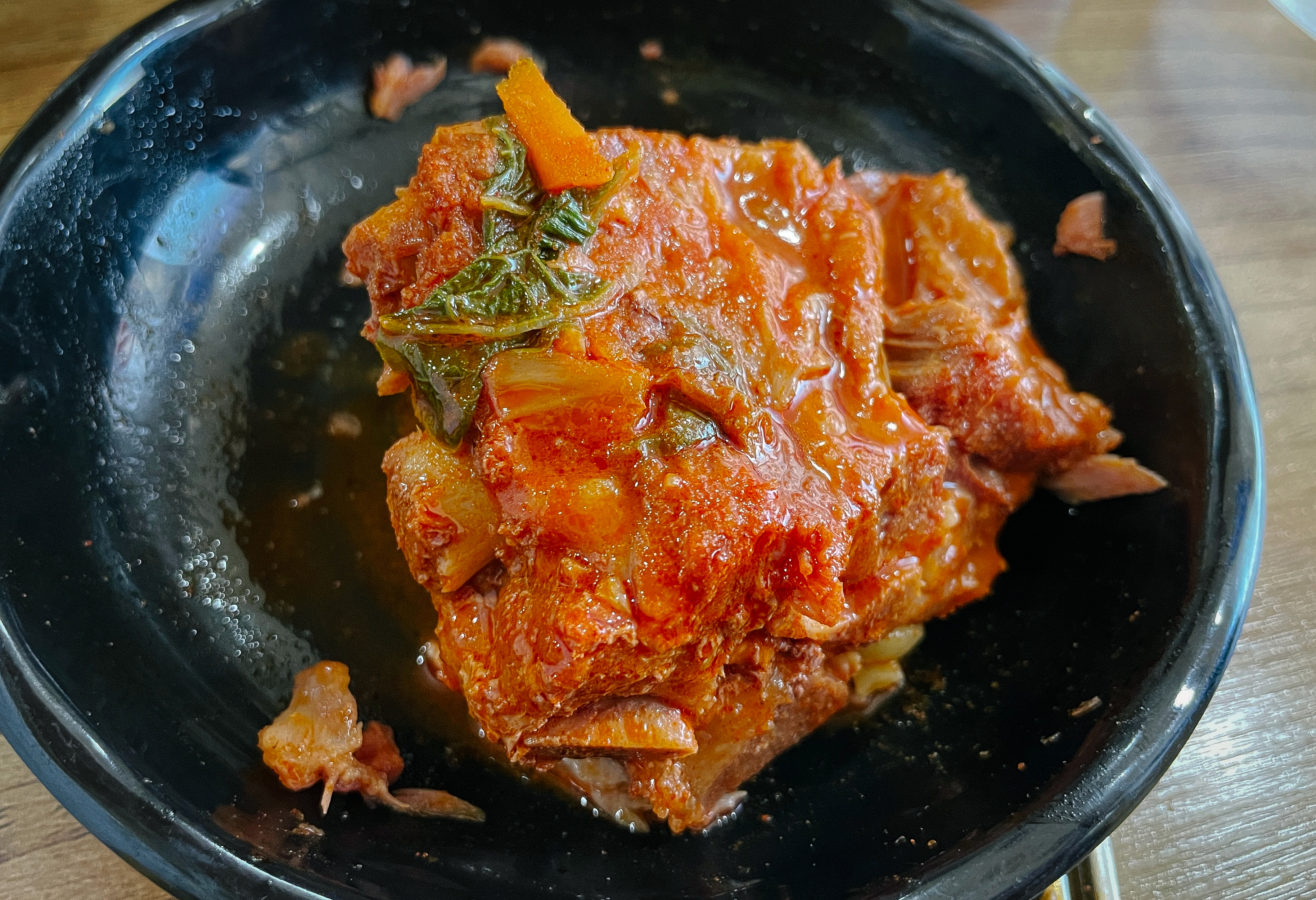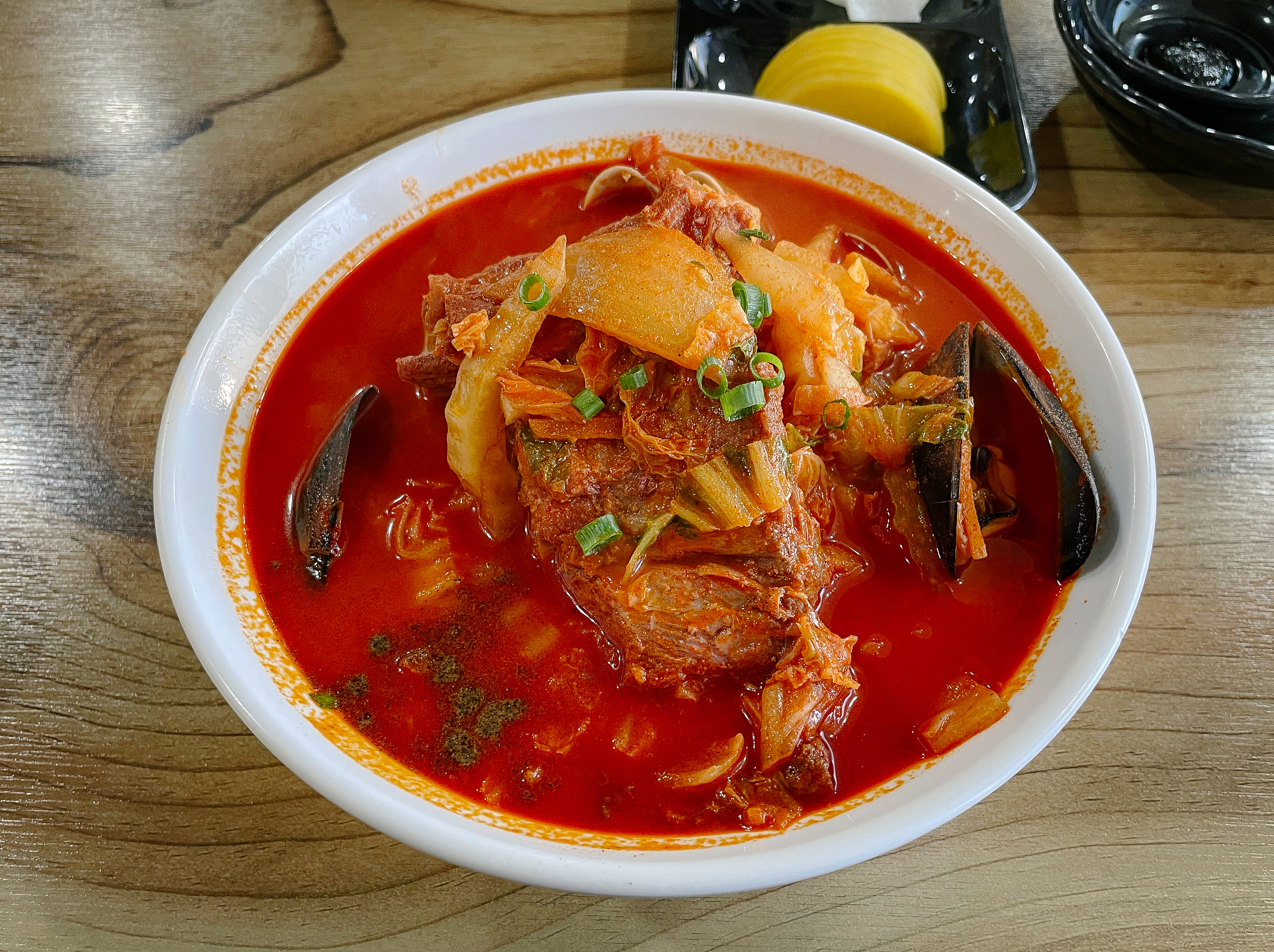 잠시 기다리니 뼈짬뽕이 나왔습니다. 뼈짬뽕은 짬뽕면과 배추, 양파, 홍합 그리고 뼈가 들어간 메뉴였고. 국물이 진하고 좋았습니다. 기본 베이스는 짬뽕이었고, 뼈다귀가 위에 올라가는 형태의 메뉴였습니다. 국물의 맛은 고기가 통으로 들어가 약간 묵직한 느낌이었고, 생각보다 짬뽕과 뼈다귀가 잘 어울렸습니다.
