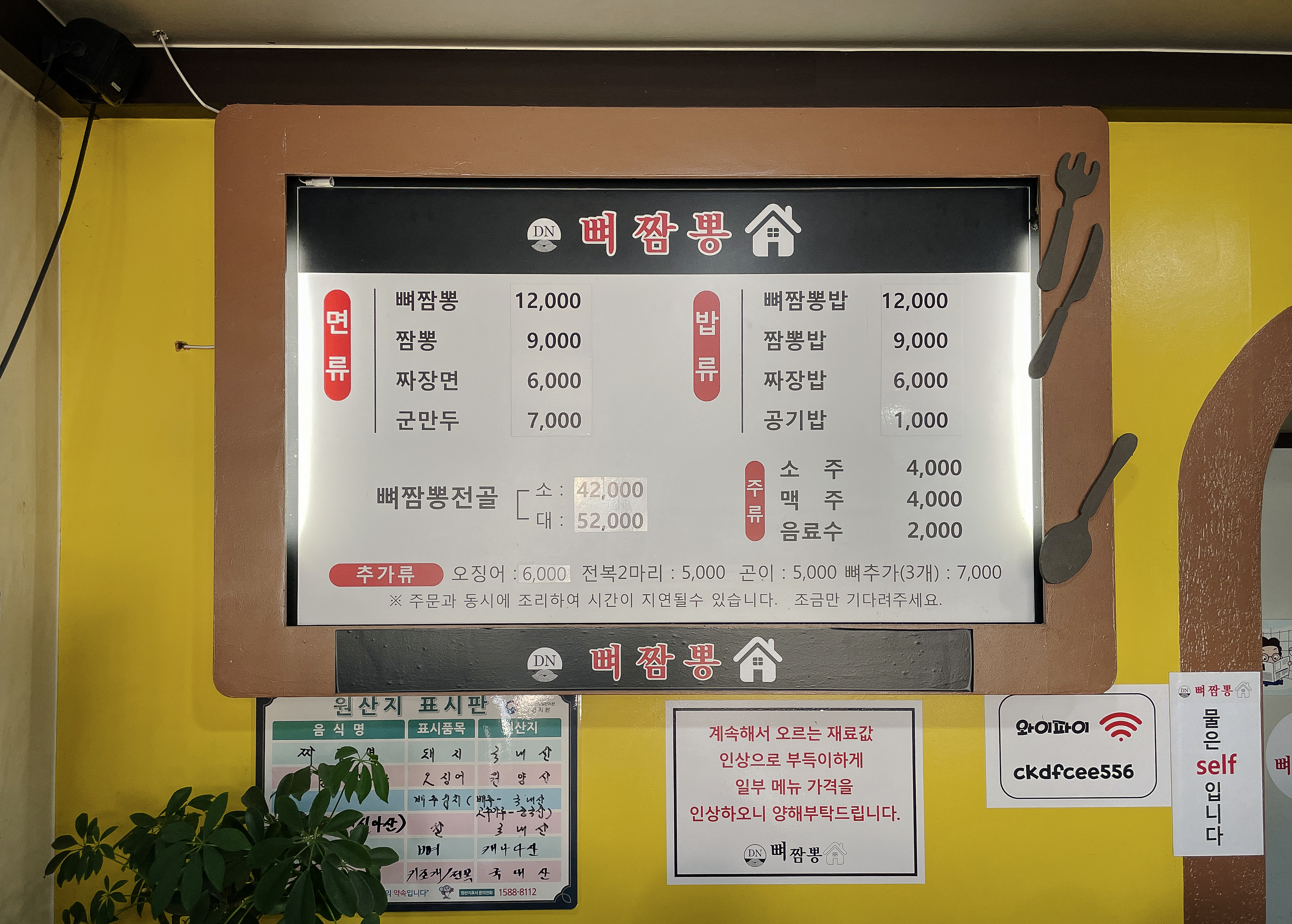 가게에 들어가 자리를 잡고 메뉴를 살펴보았습니다. 메뉴는 뼈짬뽕, 짬뽕, 짜장면, 뼈짬뽕밥, 짬뽕밥, 짜장밥, 군만두, 공기밥, 뼈짬뽕전골이 있었습니다. 원래는 가격이 더 저렴했었는데, 손님들의 말을 들어보니 최근에 가격이 인상된 듯하더라고요. 제가 주문한 뼈짬뽕의 가격은 12,000원이었습니다.