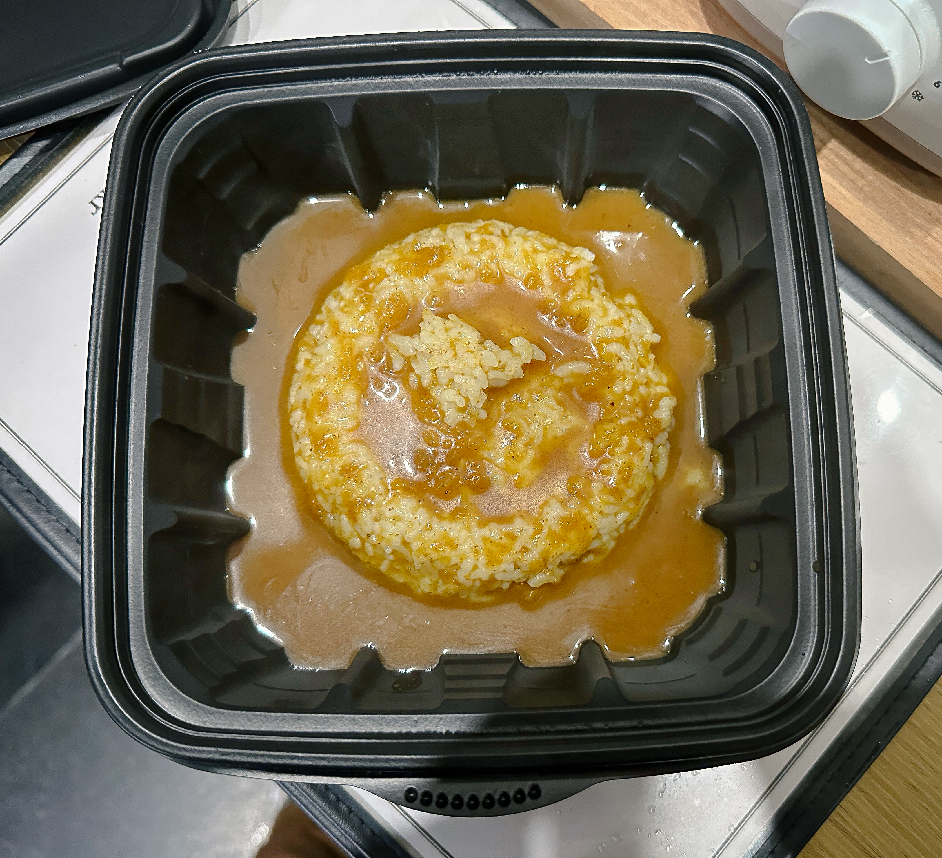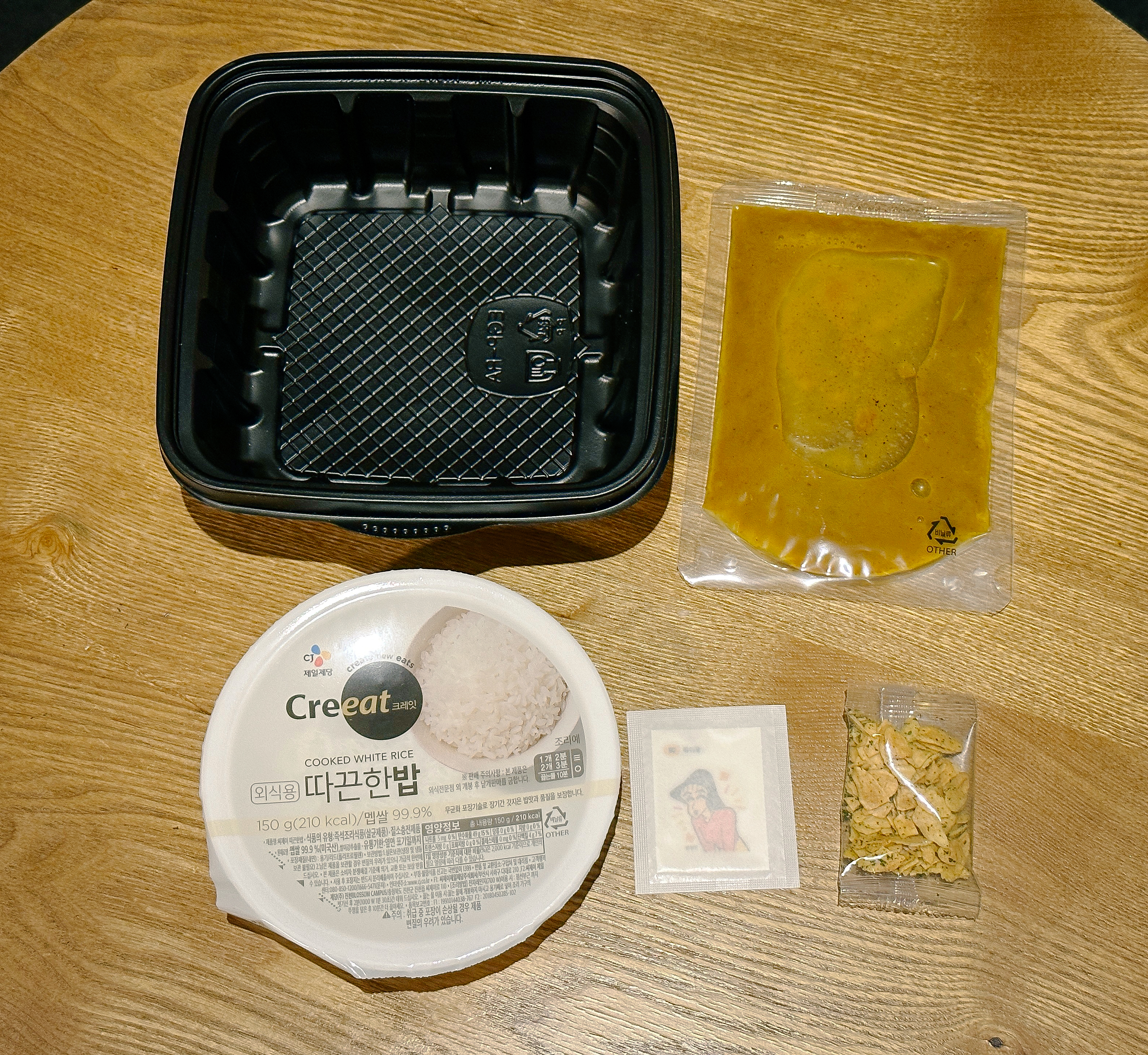 짱구는 카레대왕의 외부 포장지를 벗겨내고 즉석밥, 카레, 띠부띠부씰, 마늘 후레이크를 꺼내어 준비한 다음 전자레인지를 이용해 조리법에 맞춰 순서대로 준비했습니다. 모든 과정은 크게 어렵지 않았고, 이제 먹기만 하면 되었습니다.