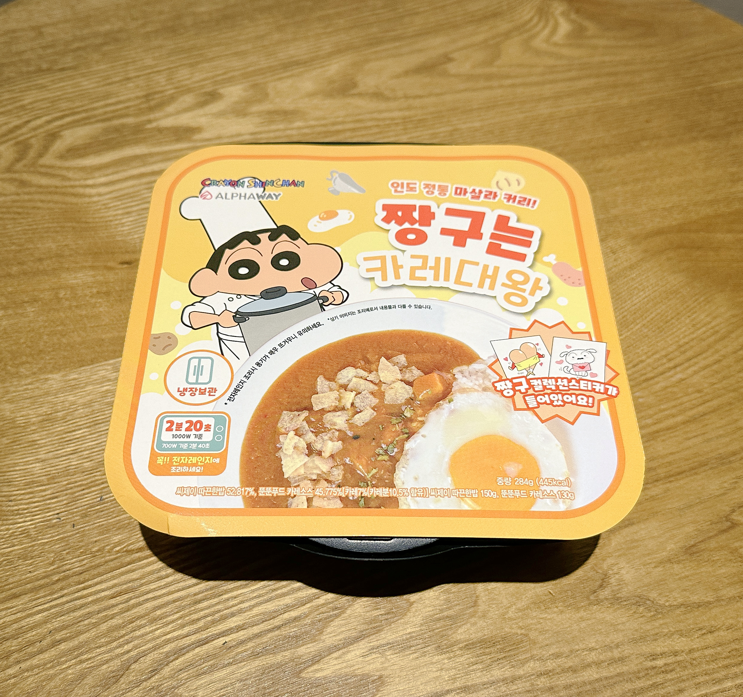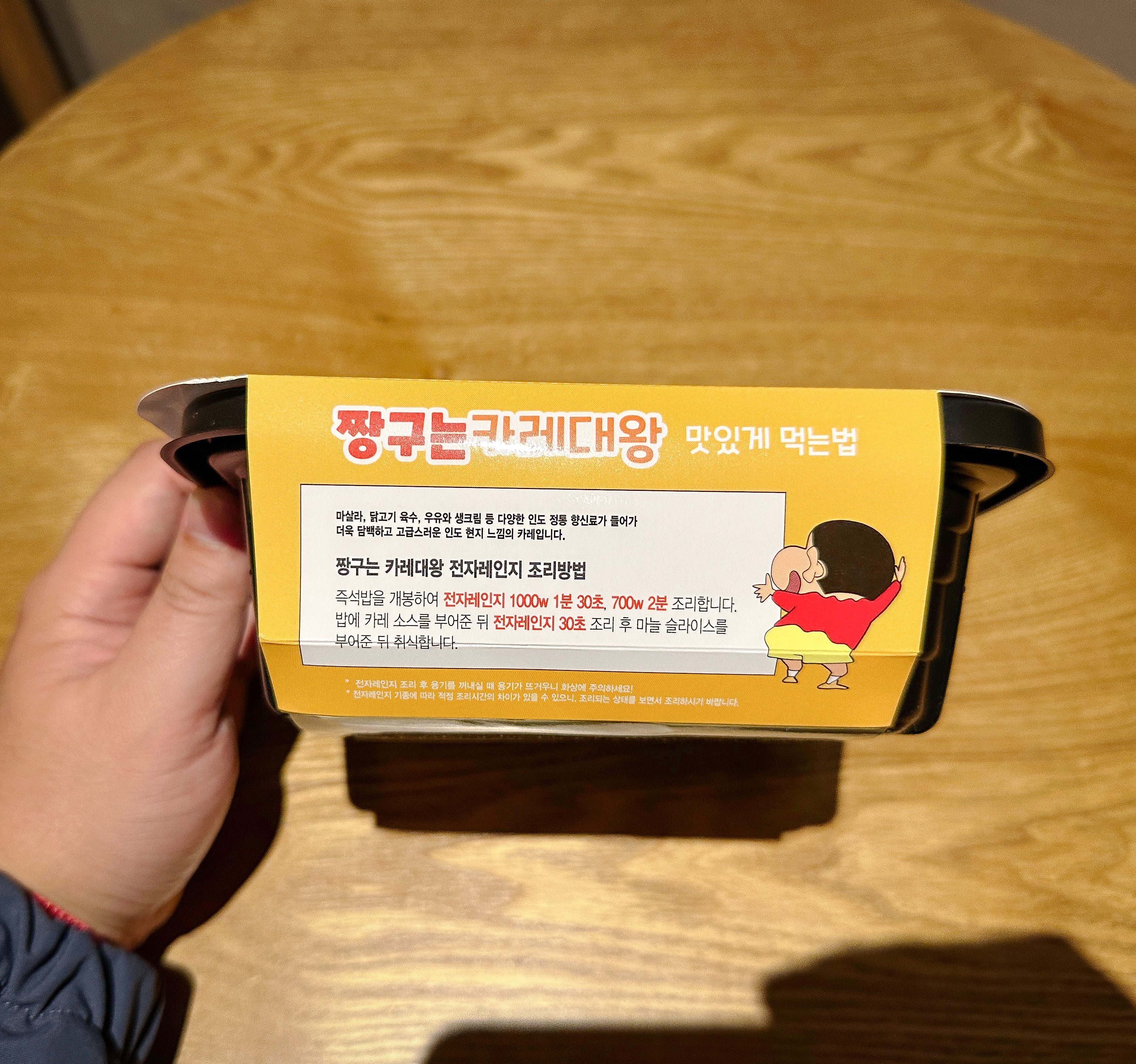짱구는 카레대왕 줄여서 '짱구카레'로 불리는 이 제품의 가격은 4,900원이었습니다. 내용물은 인도 정통 마살라 커리라고 하고, 이번에는 온수를 붓지 않고 전자레인지 만으로 조리가 가능하다는 점이 특징이었습니다.