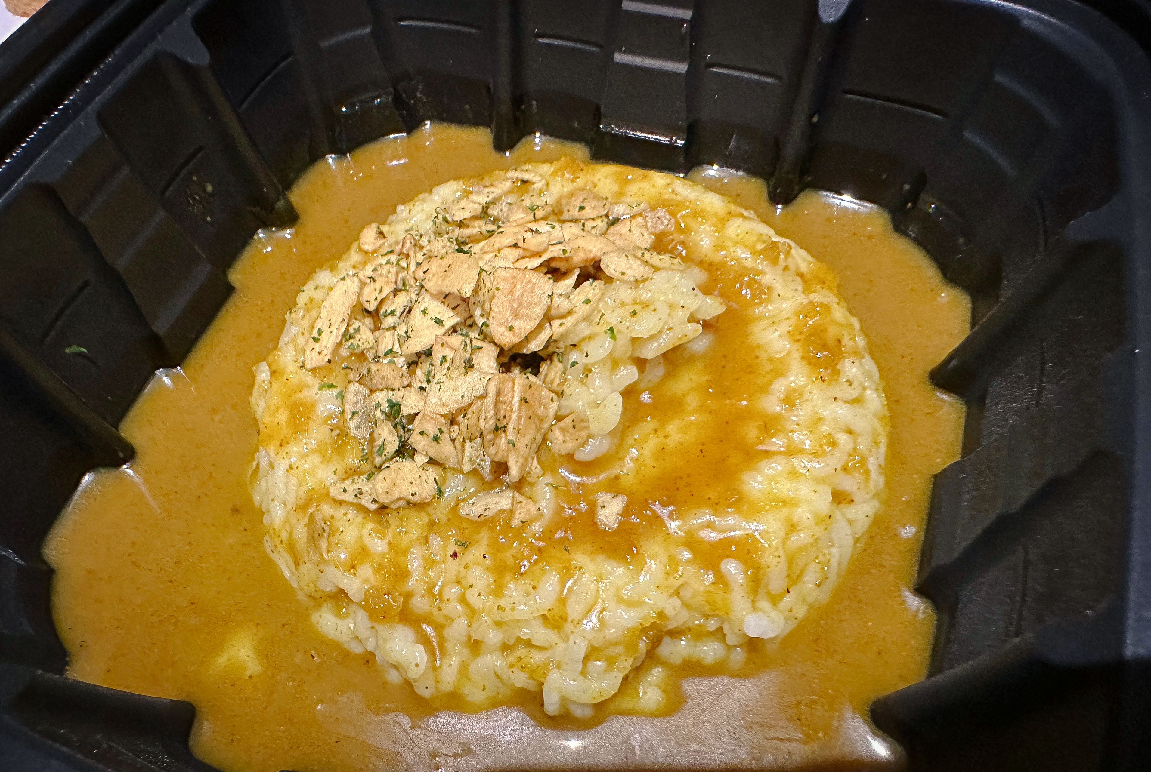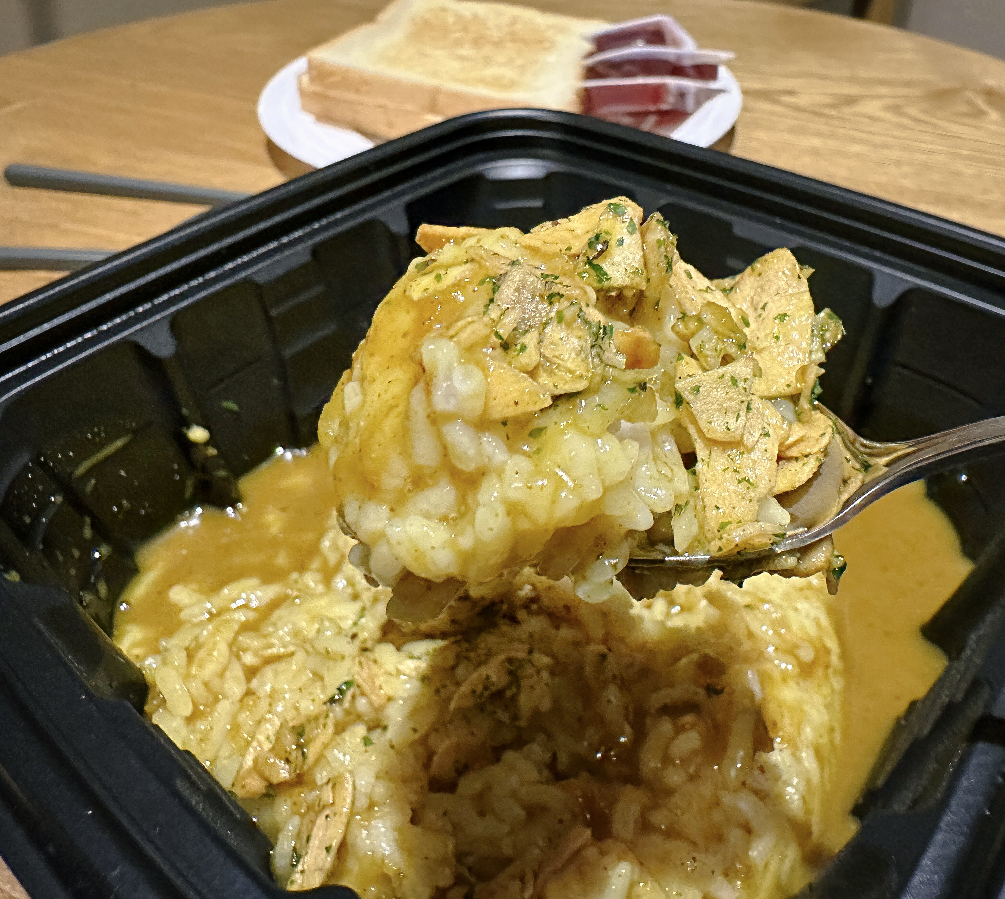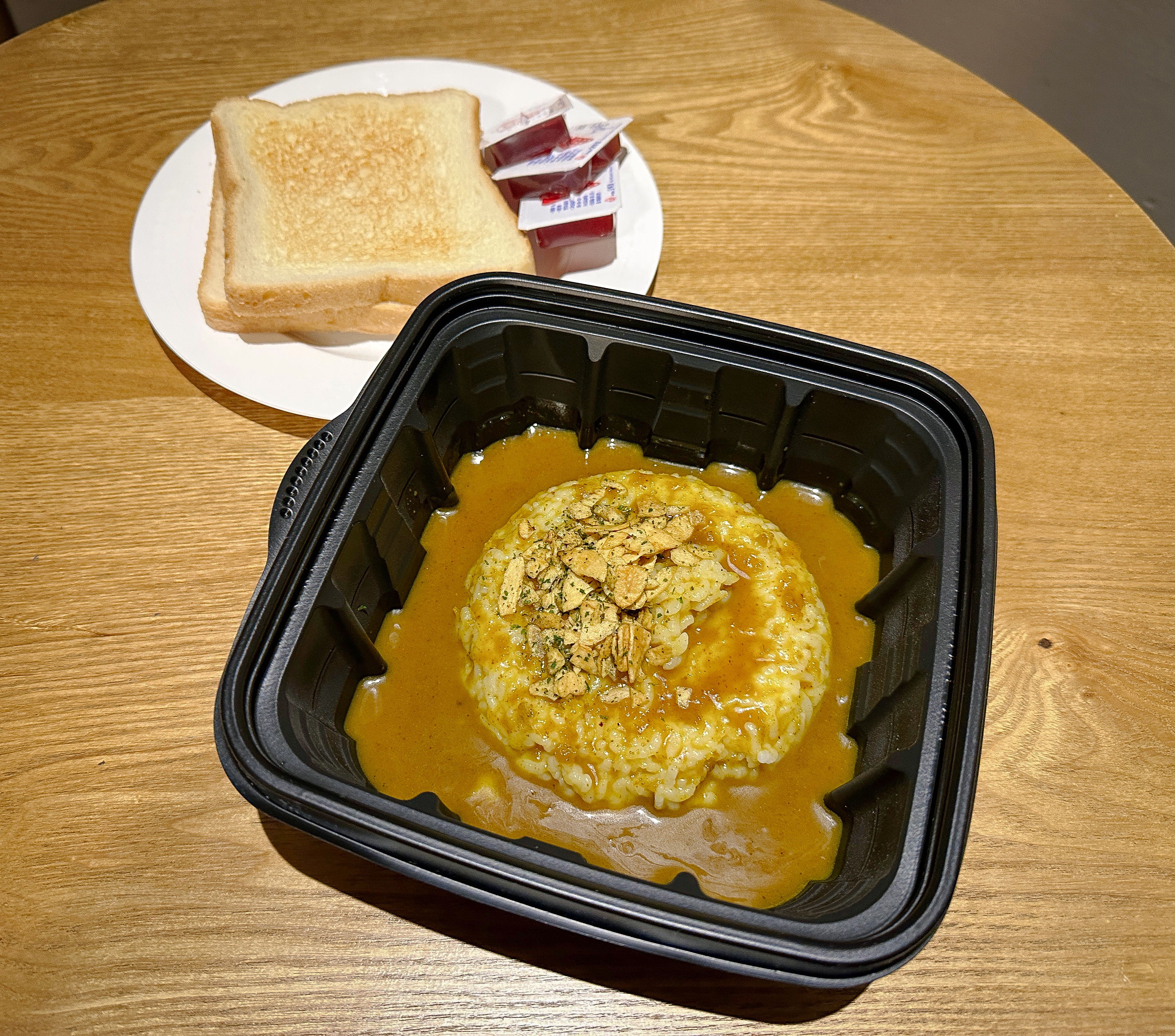 카레는 제가 워낙 좋아하는 메뉴이기 때문에 기대감을 가지고 첫 숟가락을 떴습니다. 인도식 카레는 조금 점도가 느껴지는데, 이 카레는 약간 묽은 느낌이었고, 카레는 4,900원이라는 가격에 걸맞지 않게 건더기도 거의 없고, 마늘 슬라이스 올라가는 게 전부인 듯했습니다. 그리고 무엇보다도 카레가 너무 달아서 먹다 보면 물리더라고요.