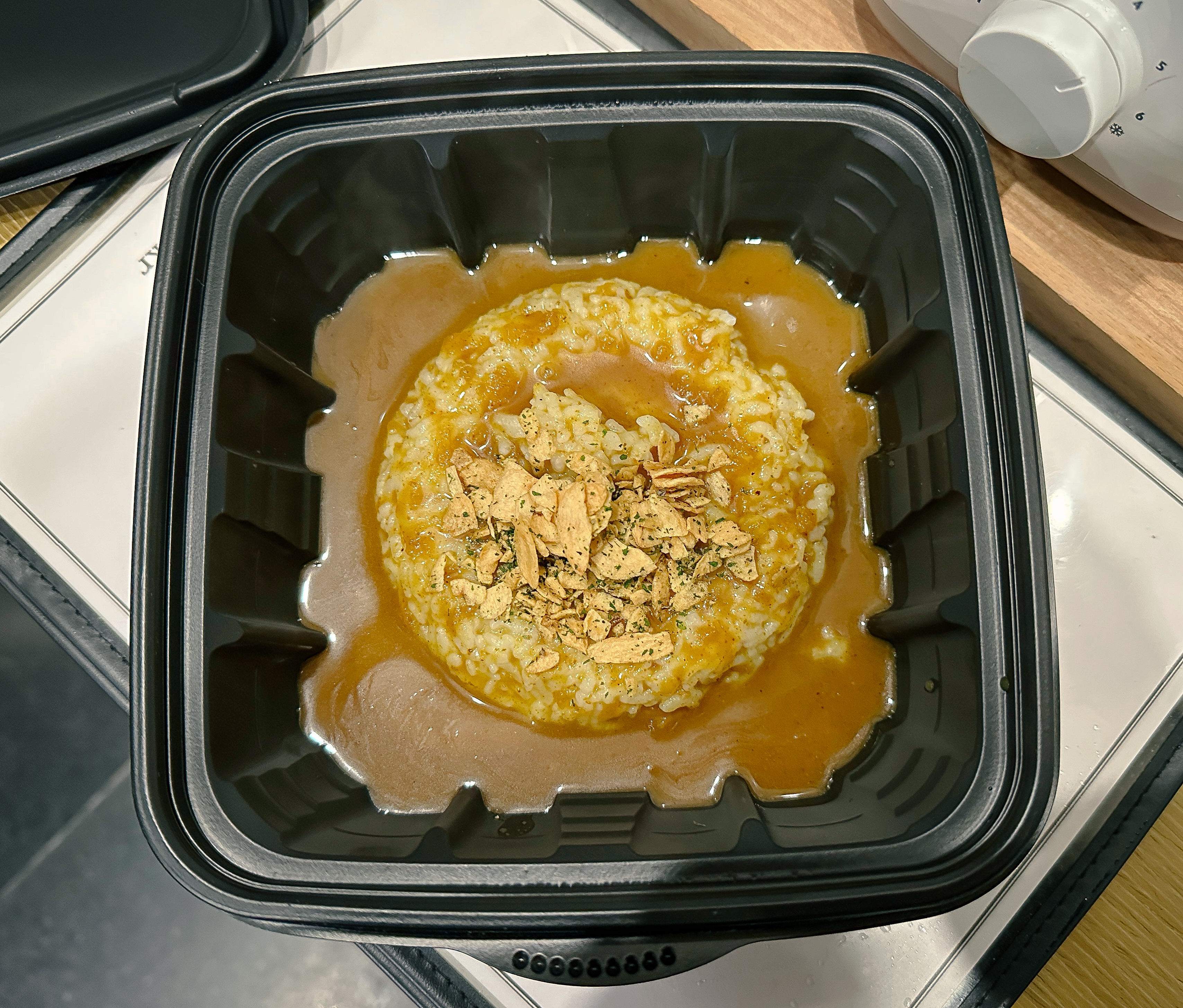 짱구는 카레대왕의 외부 포장지를 벗겨내고 즉석밥, 카레, 띠부띠부씰, 마늘 후레이크를 꺼내어 준비한 다음 전자레인지를 이용해 조리법에 맞춰 순서대로 준비했습니다. 모든 과정은 크게 어렵지 않았고, 이제 먹기만 하면 되었습니다.