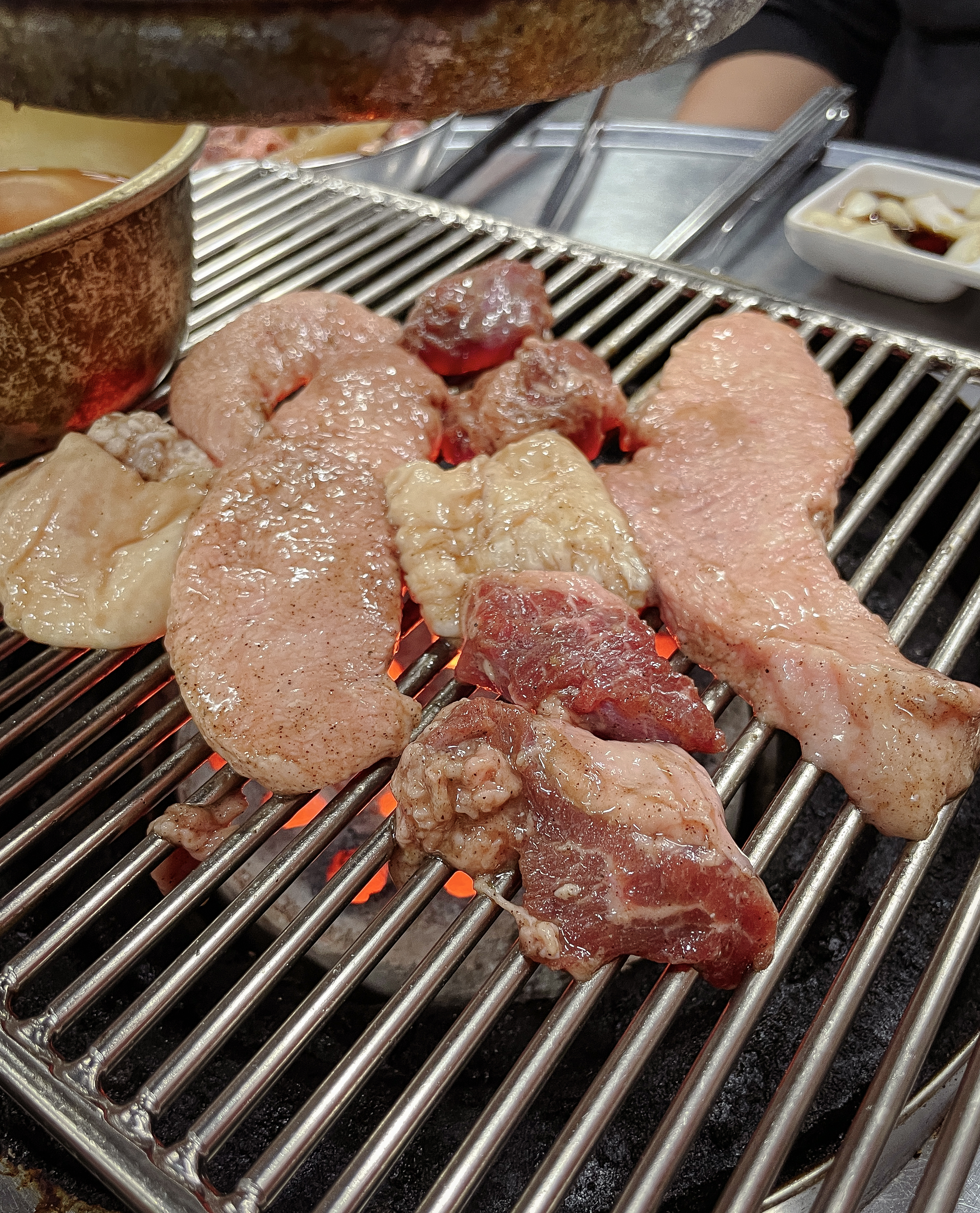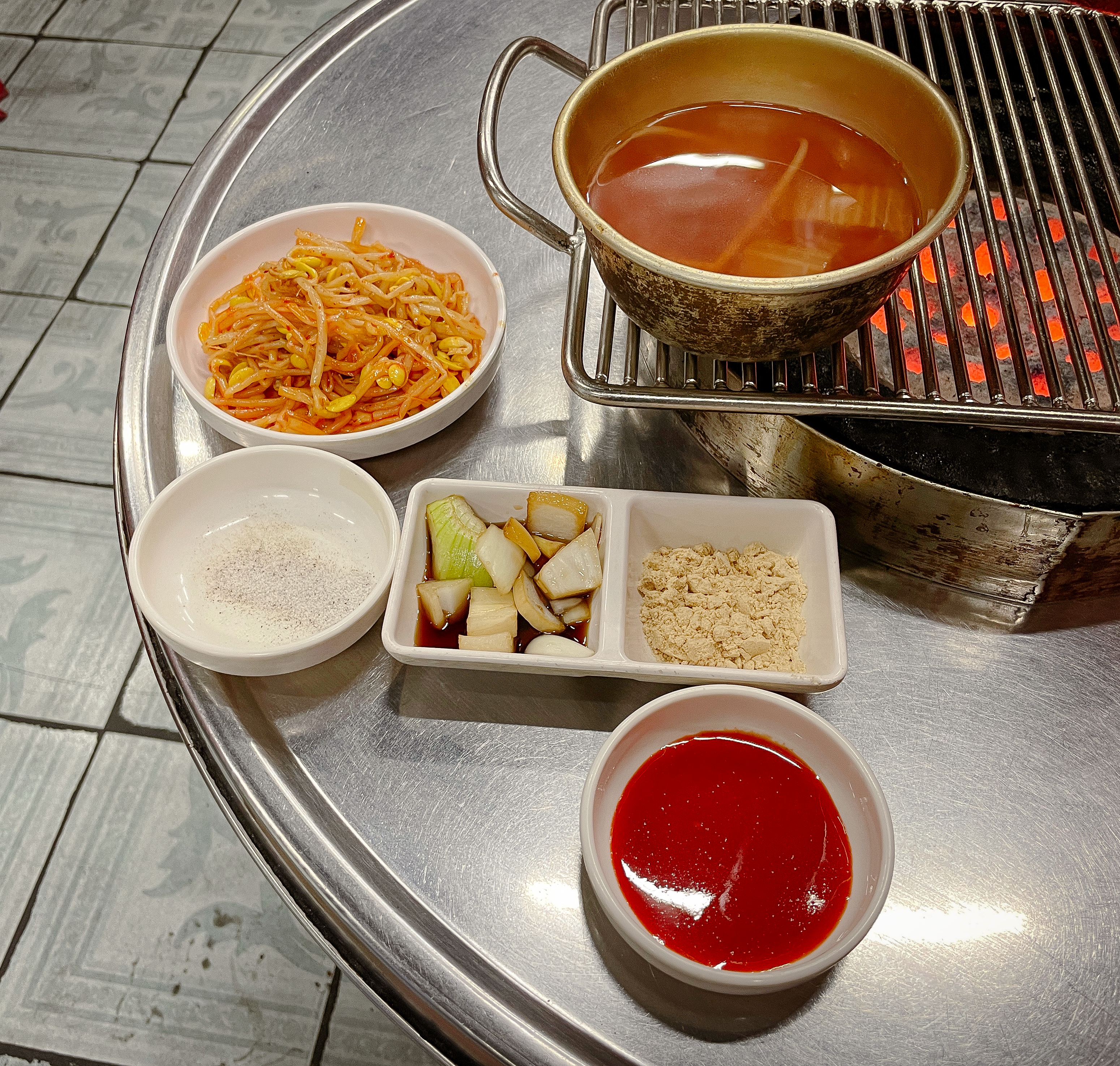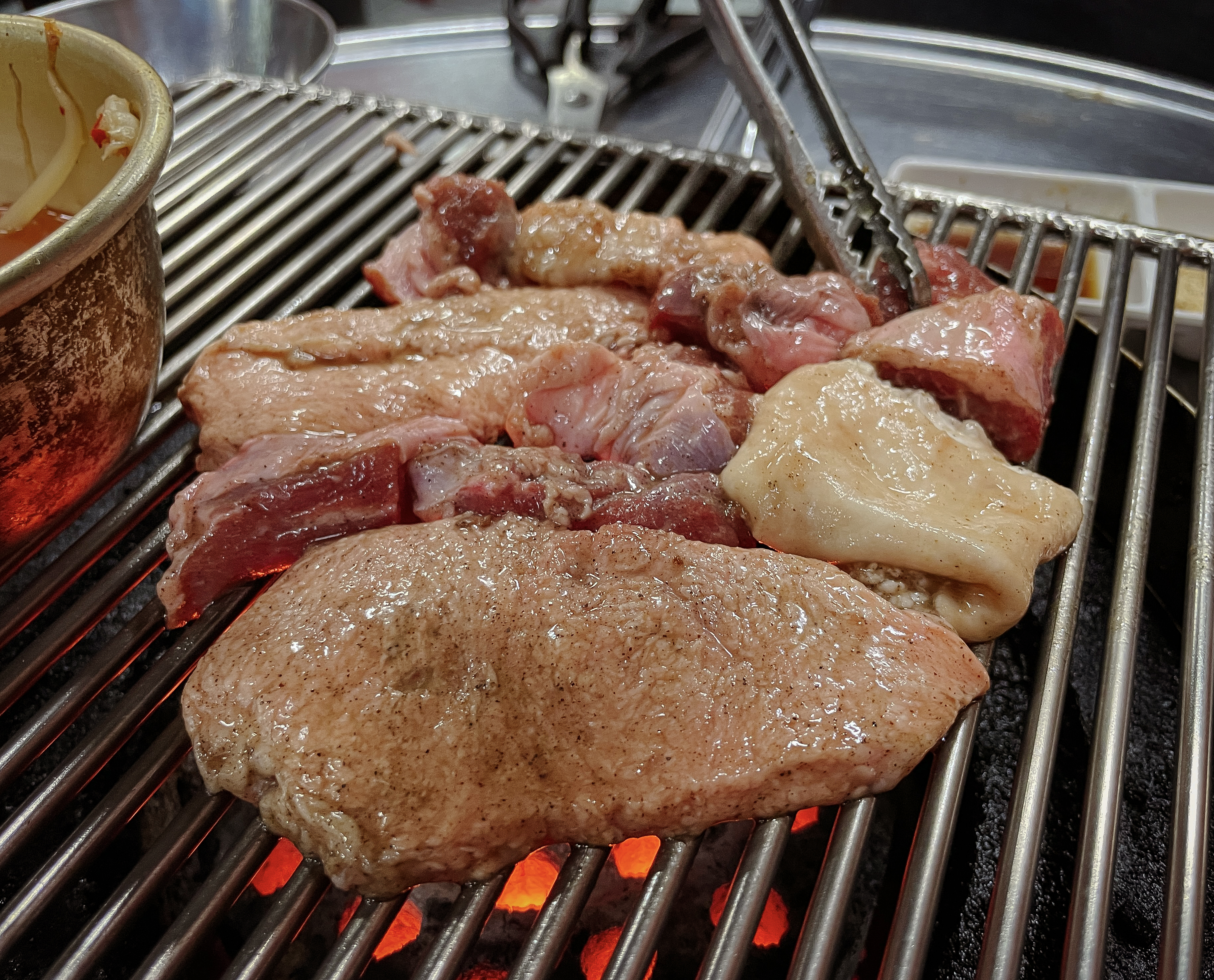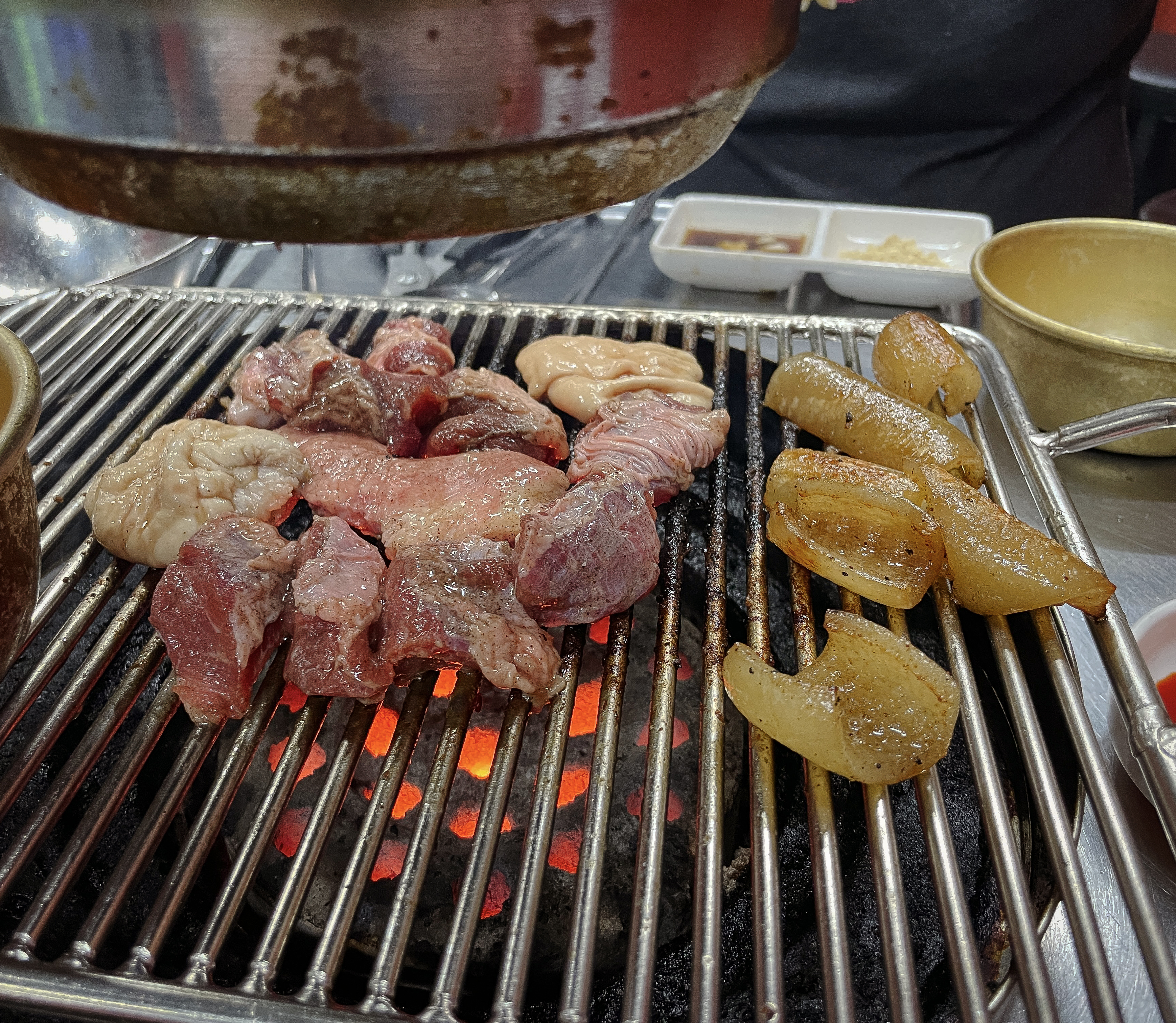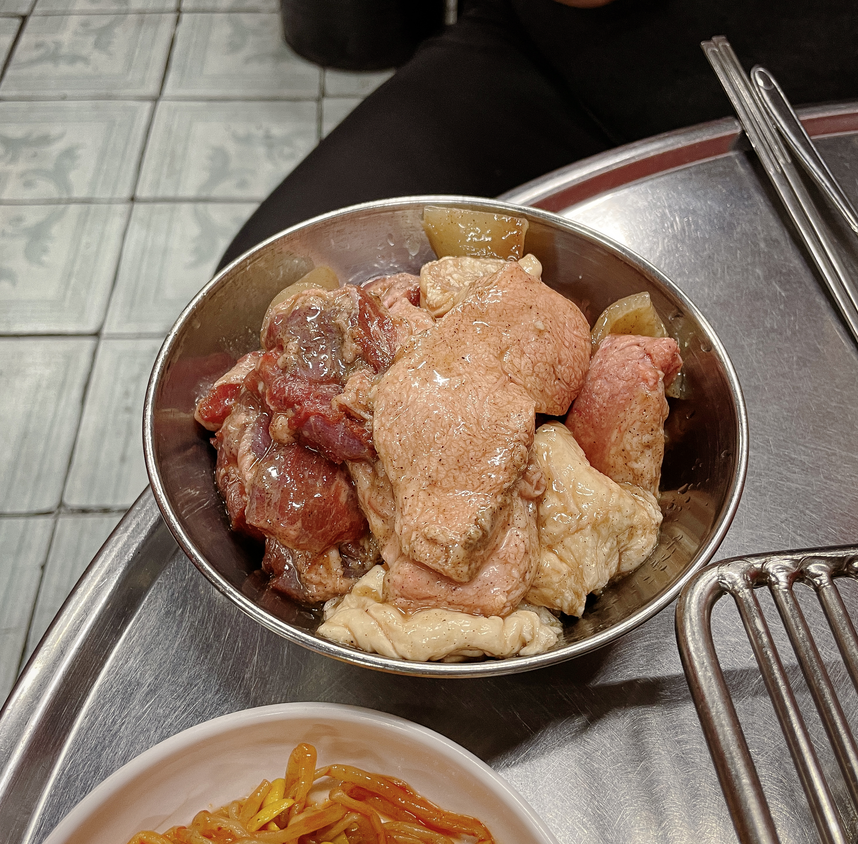 김치 콩나물국, 콩나물무침, 양파장아찌, 양념류가 반찬으로 제공되었고, 곧이어 주문한 돼지 부속고기가 나왔습니다. 사진 찍고 보니 우리가 흔히 구워 먹는 삼겹살 목살과는 다른 비주얼에 약간 이질감이 느껴졌지만, 평소에도 곱창, 막창 등은 거부감 없이 먹었기 때문에 일단 불판 위에 고기를 올려 구워주기 시작했습니다.