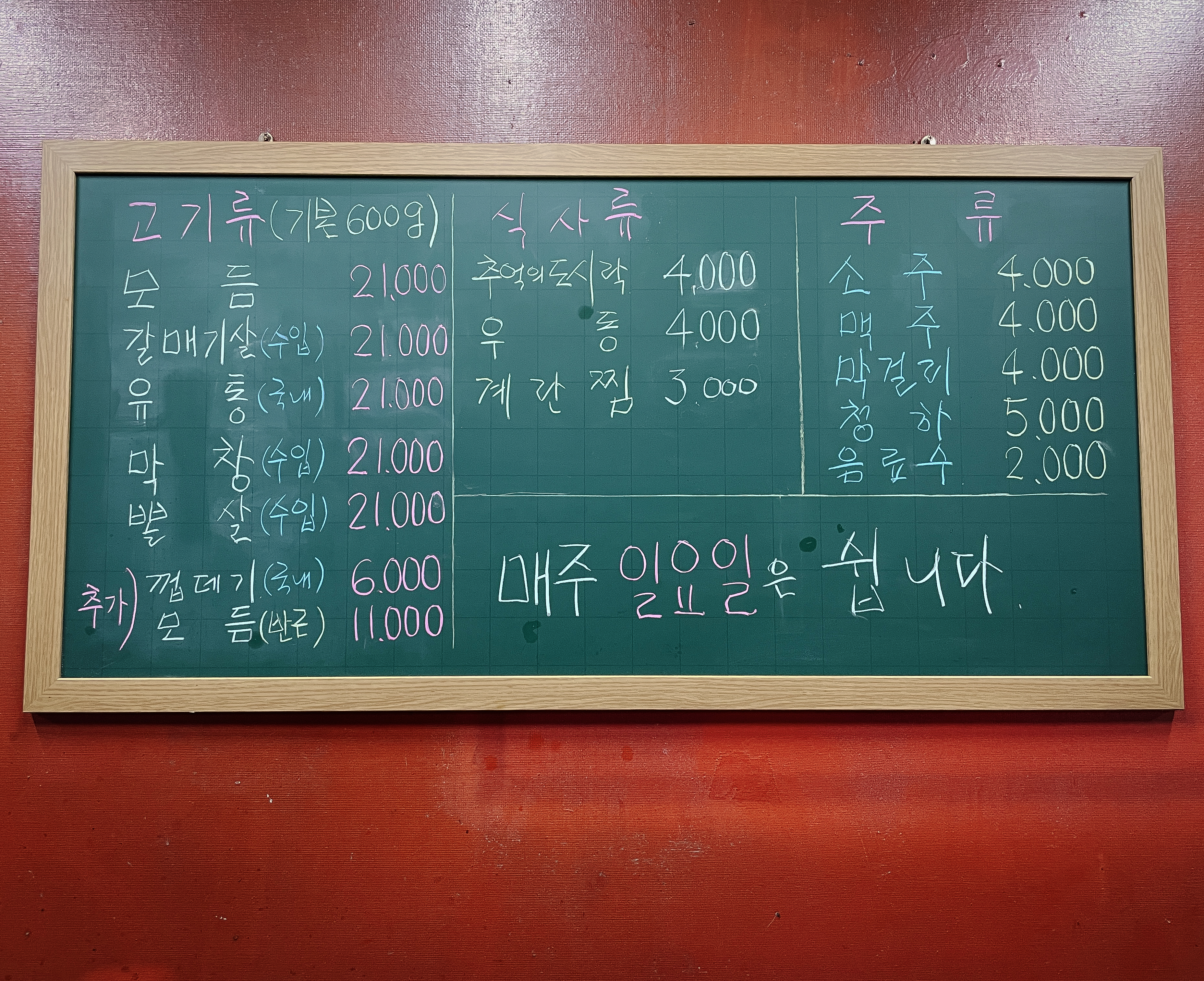 삼거리집은 서울 은평구 불광동 89-3, 1층에 위치한 가게였습니다. 메뉴는 모듬, 갈매기살, 유통, 막창, 뽈살, 껍데기, 추억의도시락, 우동, 계란찜 등이 있었습니다. 친구는 유통 부위가 포함된 모듬으로 주문을 하더라고요.