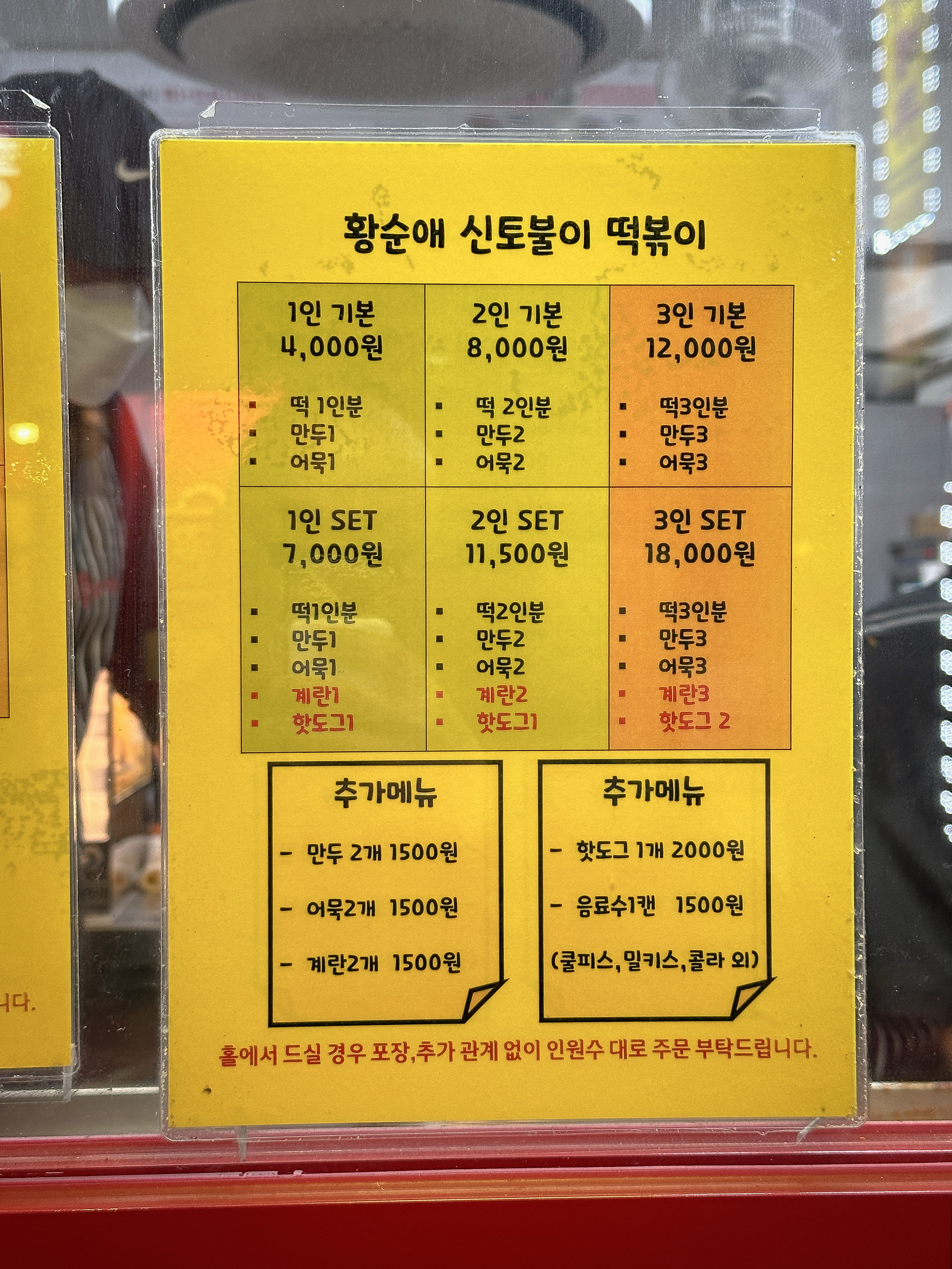 저희는 황순애 신토불이 떡볶이의 떡볶이 2인분과 만두, 어묵, 달걀, 핫도그가 함께 나오는 2인 세트를 주문했습니다. 2인 세트 기준 가격은 11,500원으로 부담스럽지 않은 금액에 판매하고 있었습니다. 부족할 경우 메뉴들을 추가해서 먹을 수 도 있었습니다.