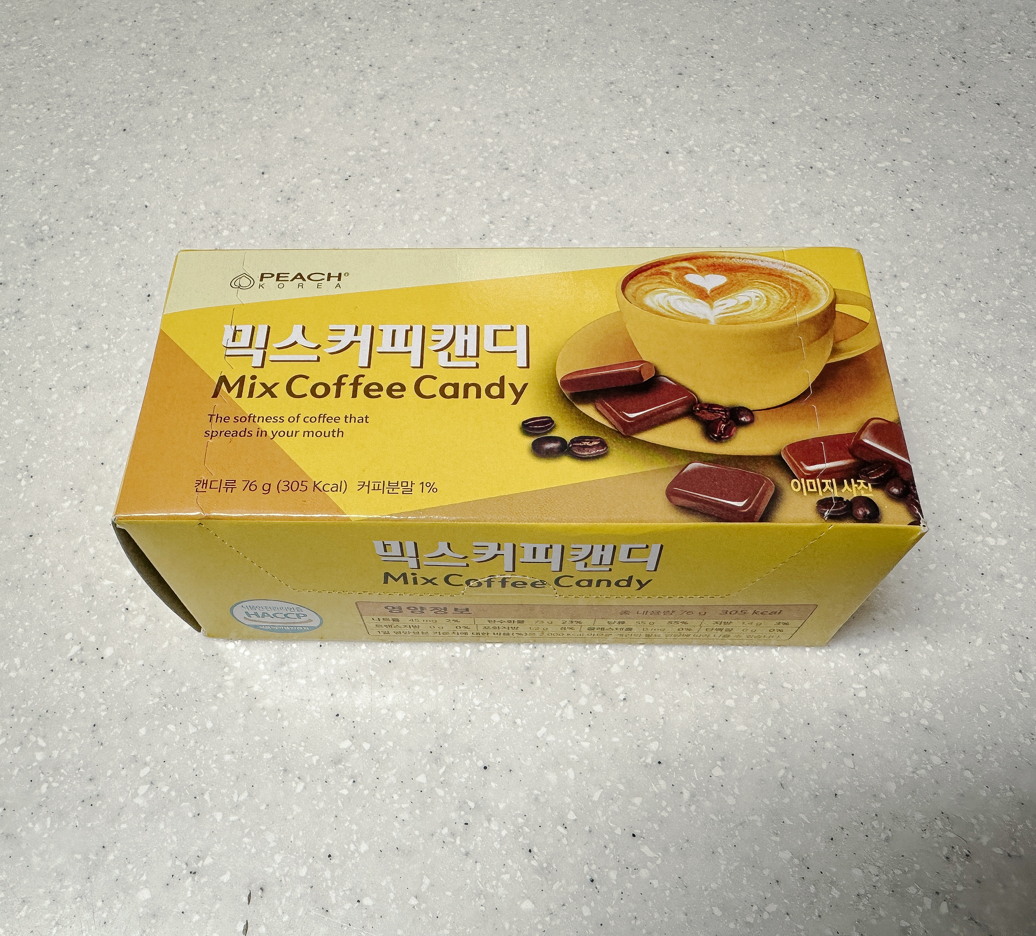 편의점 신상 믹스커피캔디는 위와 같이 생겼습니다. 피치코리아라는 곳에서 판매 중이었고, 다른 제품들처럼 영양정보 및 원재료명을 알기 쉽게 포장에 잘 적어두었더라고요.