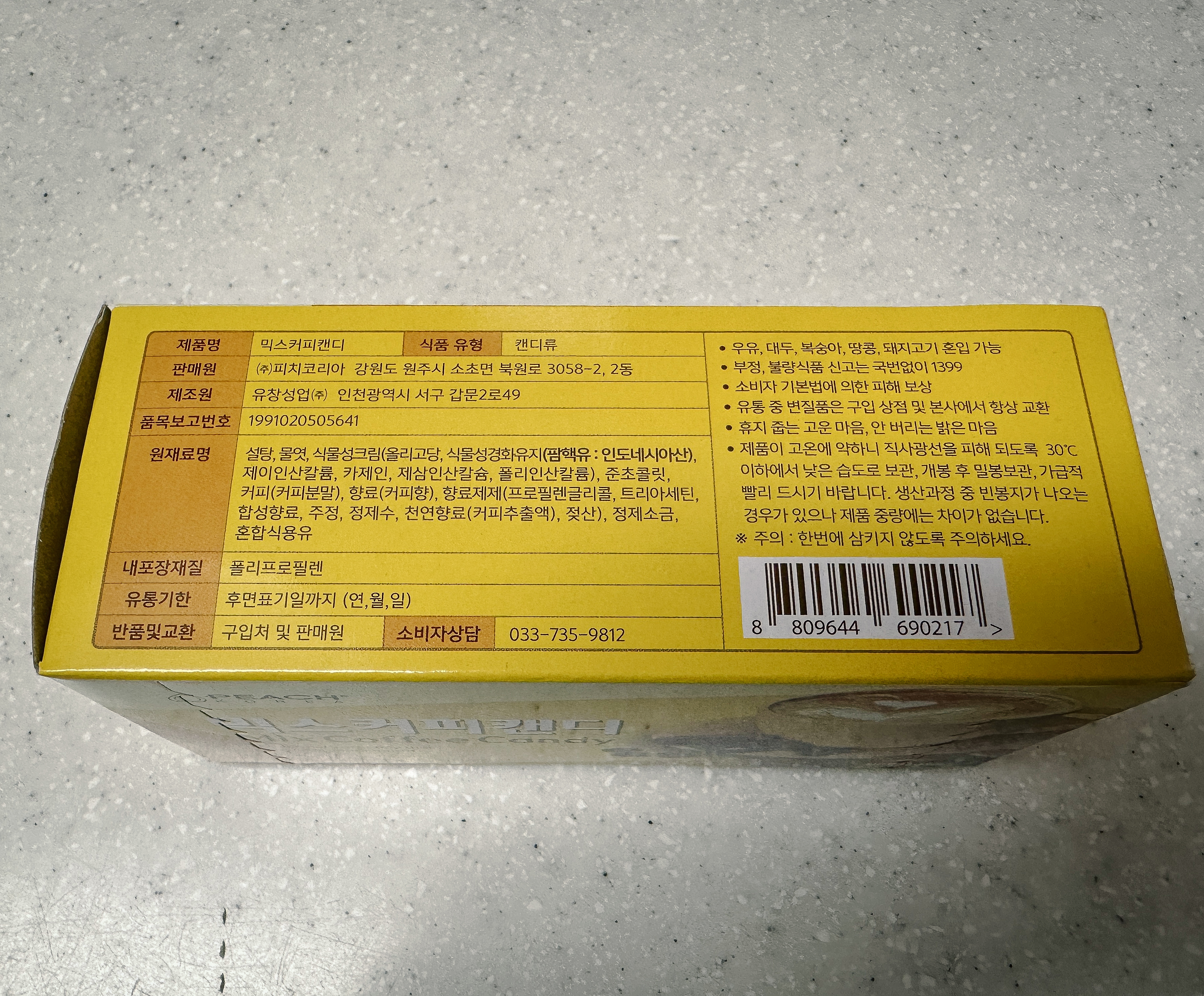 편의점 신상 믹스커피캔디는 위와 같이 생겼습니다. 피치코리아라는 곳에서 판매 중이었고, 다른 제품들처럼 영양정보 및 원재료명을 알기 쉽게 포장에 잘 적어두었더라고요.
