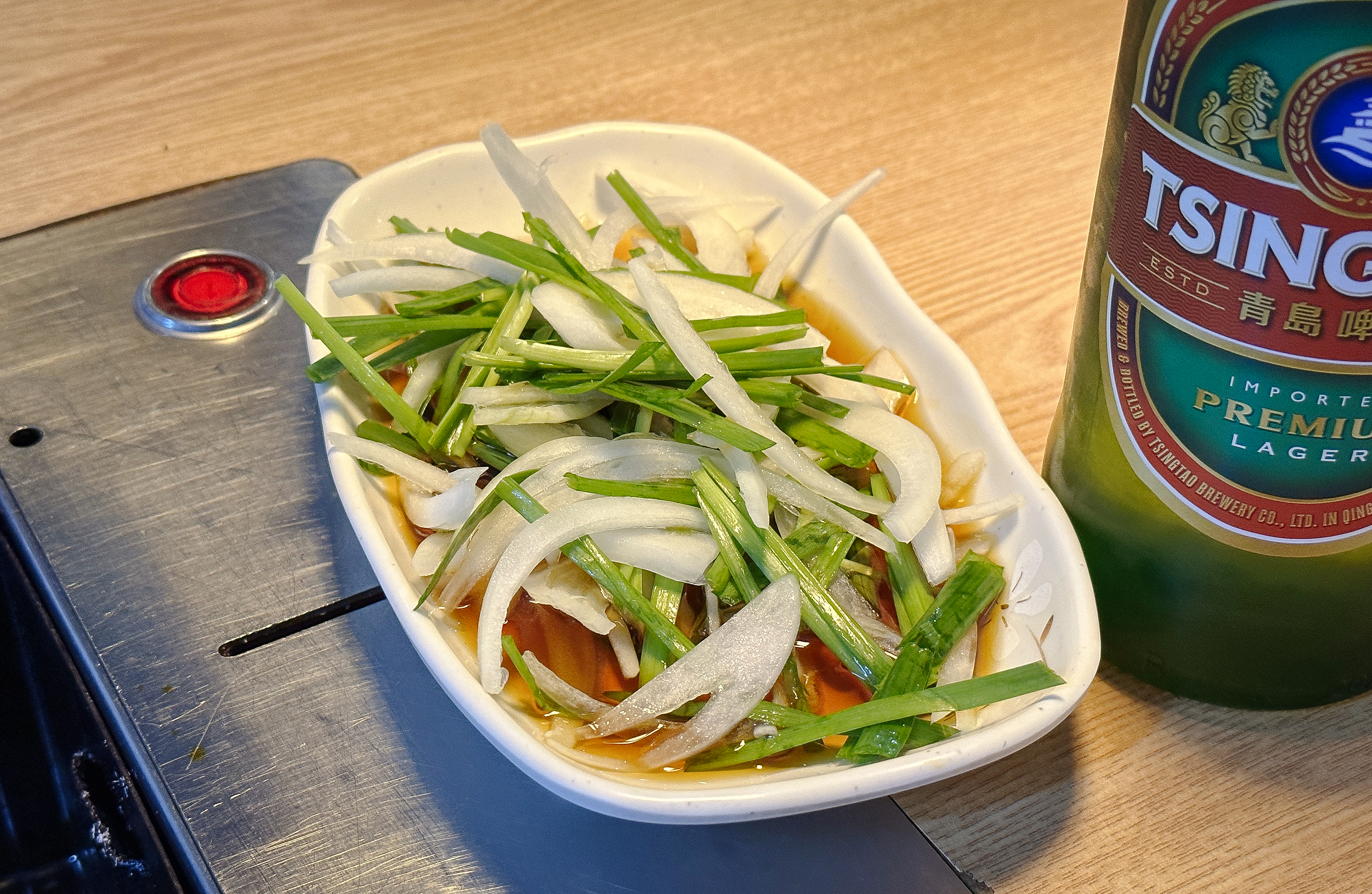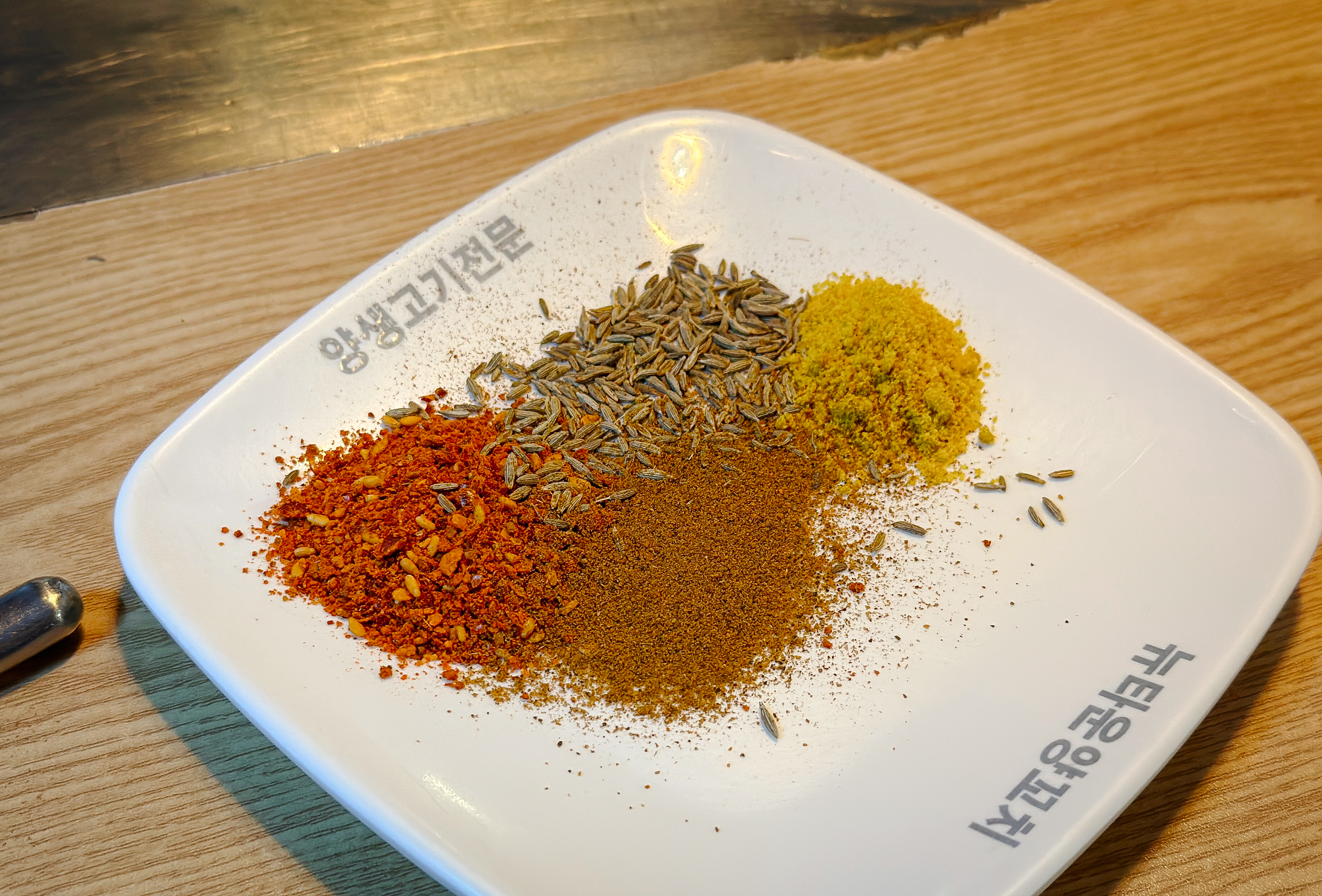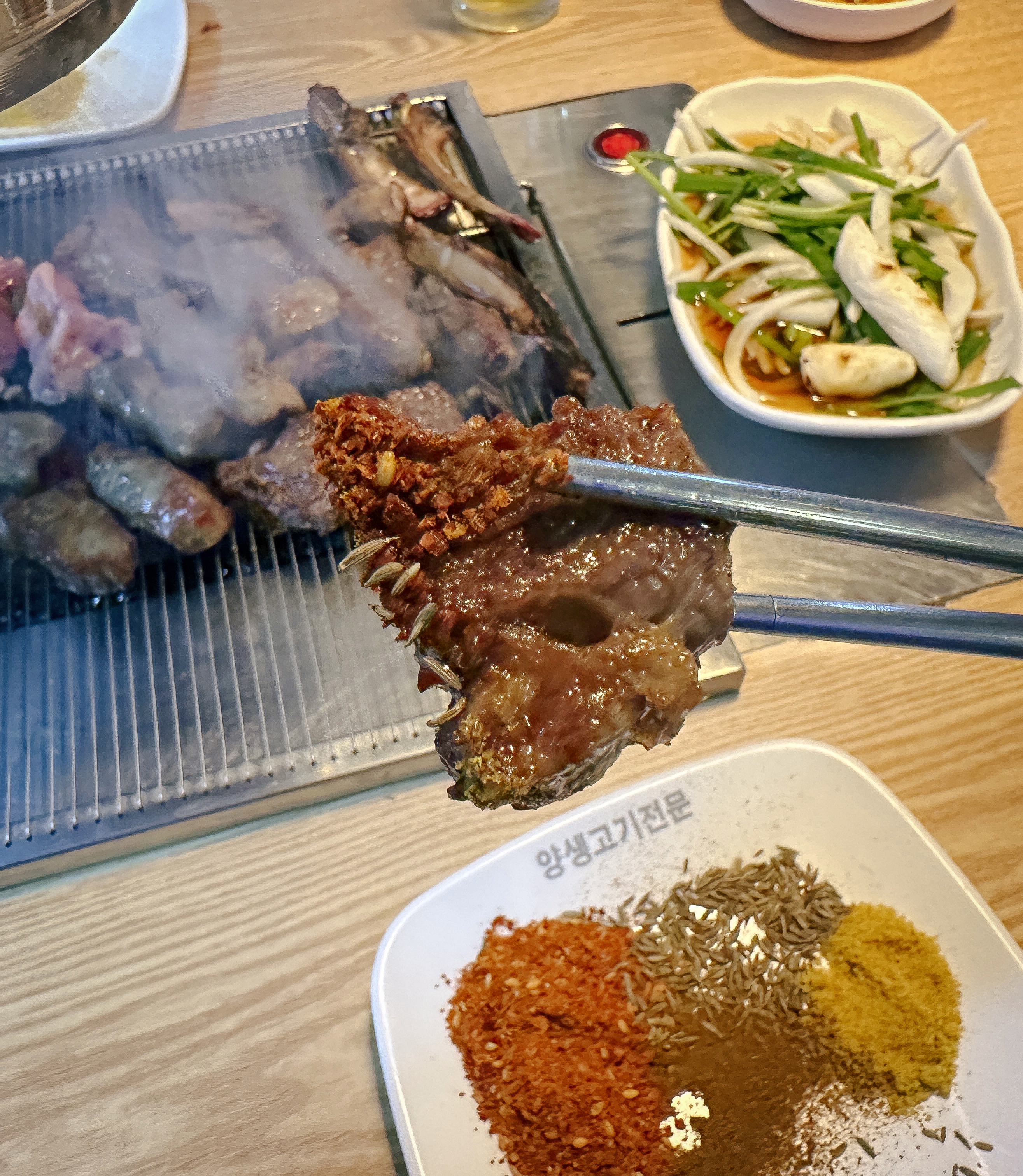 양고기는 그냥 먹어도 맛있지만 쯔란, 카레 같은 향신료와 함께 먹으면 더 맛있는 것 같습니다. 부족할 경우 가게 한편에 마련되어있는 김치냉장고에서 덜어먹으면 되었는데, 김치냉장고에 비닐장갑을 여러 사람이 공용으로 쓰게 되어있어 위생적으로 보이지는 않더라고요. 차라리 집게 같은 것을 놔두면 좋았을 텐데요.