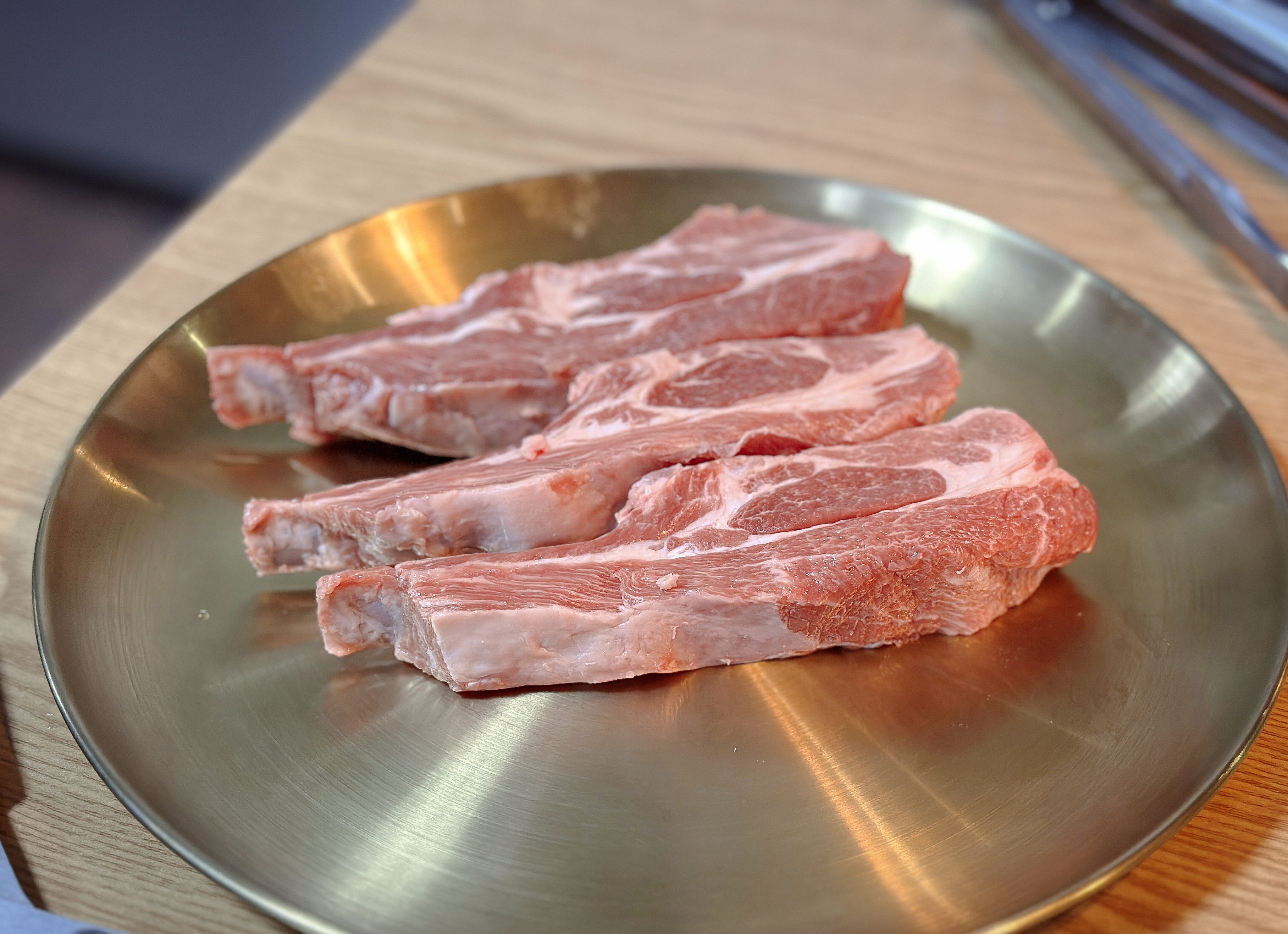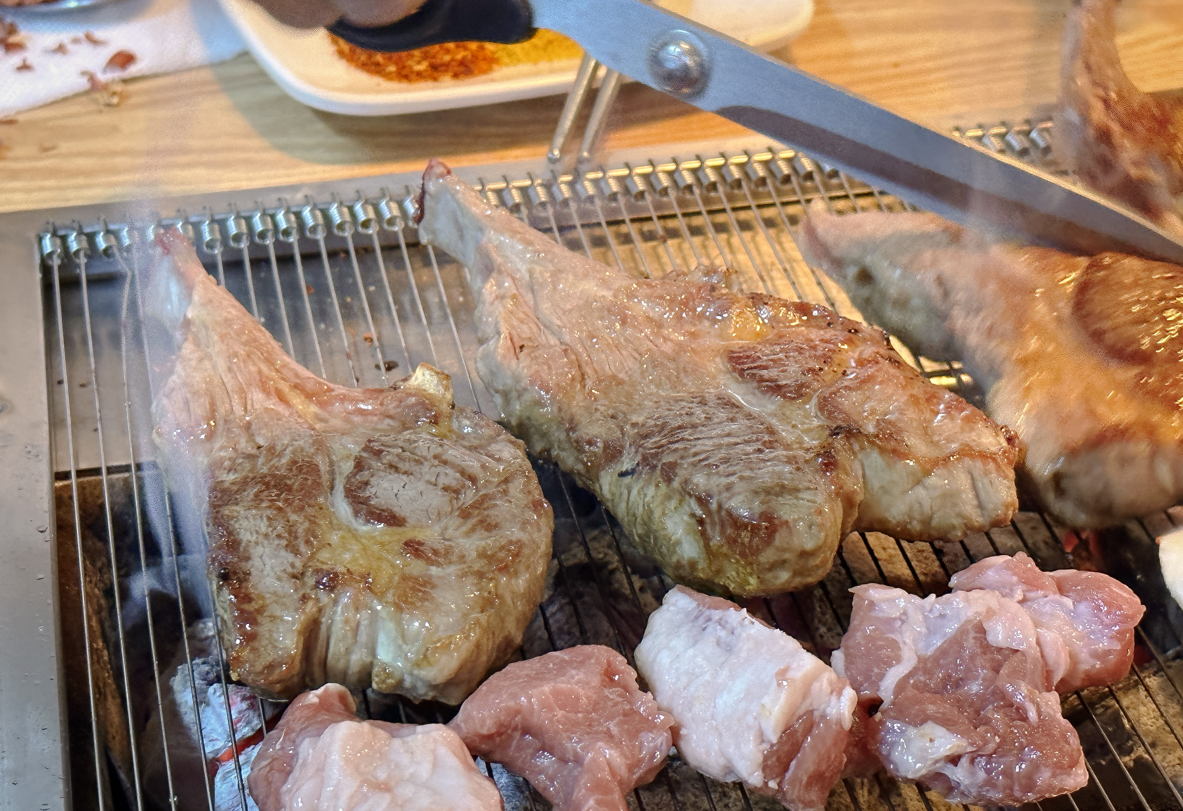 불판 위에 양갈비를 올리고 고기를 구웠습니다. 불판이 작아서 그런 건지 불이 약해서 그런건지 고기를 올리고 아무리 구워도 익지를 않더라고요. 그래도 인내심을 가지고 열심히 구워줬습니다.