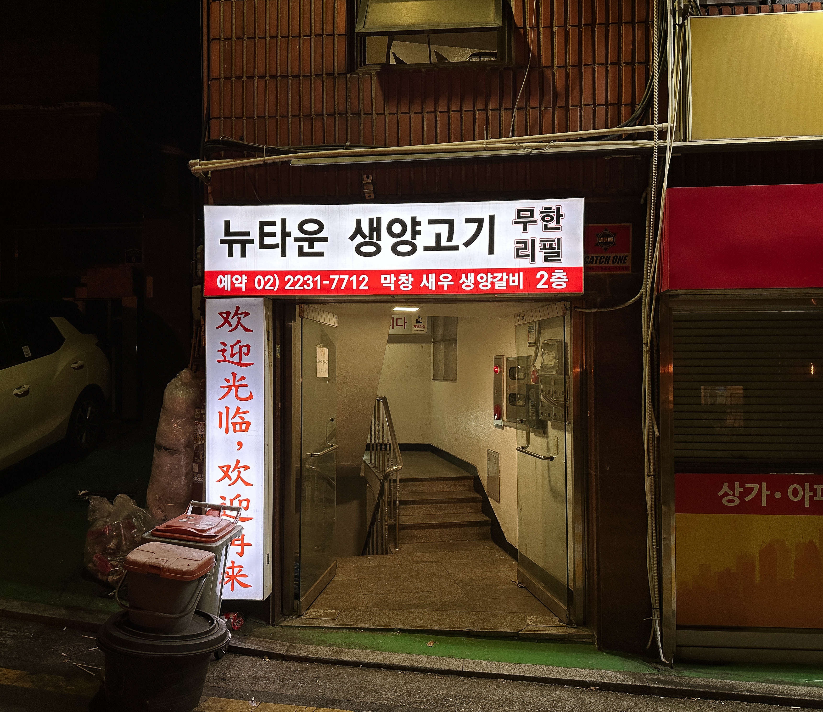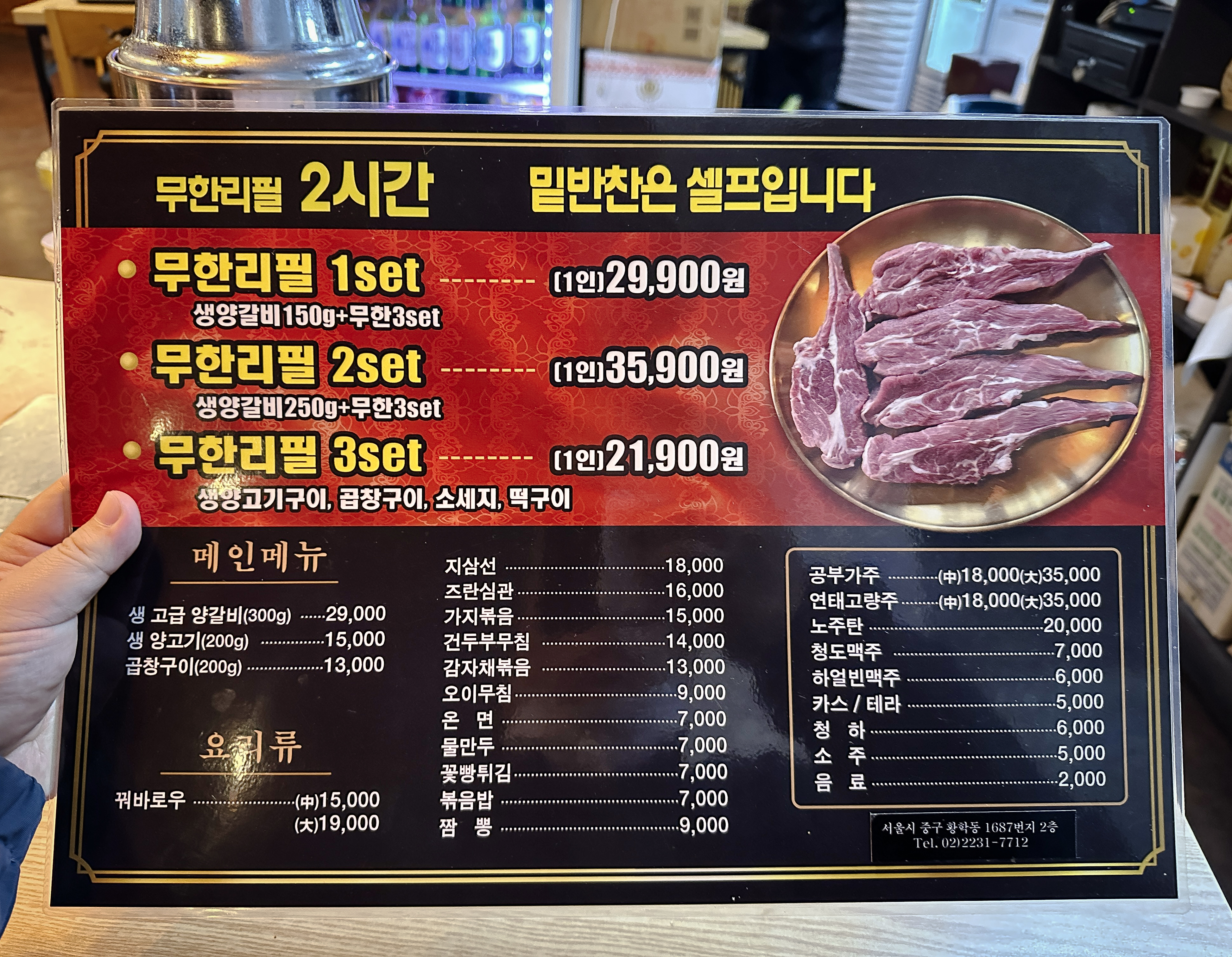 뉴타운생양고기는 서울 중구 황학동 1687, 2층에 위치한 가게였고, 저희는 처음 방문이라 생양갈비가 포함된 무한리필 1 세트를 주문했습니다. (먹어보니 무한리필 3 세트가 가성비가 가장 좋더라고요.)