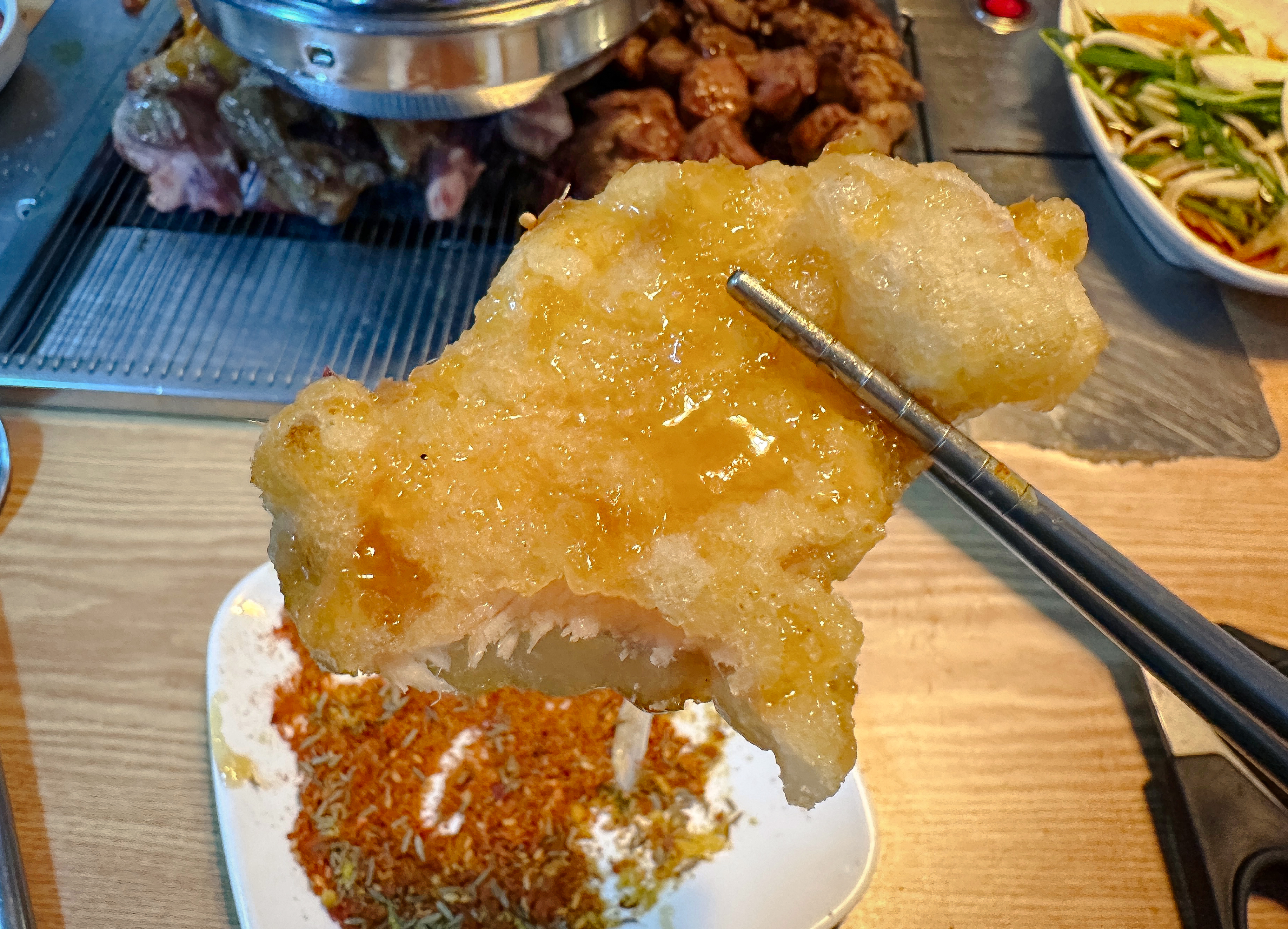 양고기는 무한리필로 먹을 수 있다고 했는데, 제가 간 날은 김치냉장고에 양고기도 금세 떨어지고 없었고, 사장님께 더 달라고 부탁드리니 눈치를 주시더라고요. 먹방 유튜버가 다녀갔다면 분명 꽤 많은 양을 먹었을 텐데, 저희는 만족스러운 양은 제공받지 못했습니다. 아쉬운 대로 꿔바로우도 주문했습니다. 투박하게 튀겨낸 꿔바로우는 새콤한 소스에 곁들여져 맛이 좋더라고요.