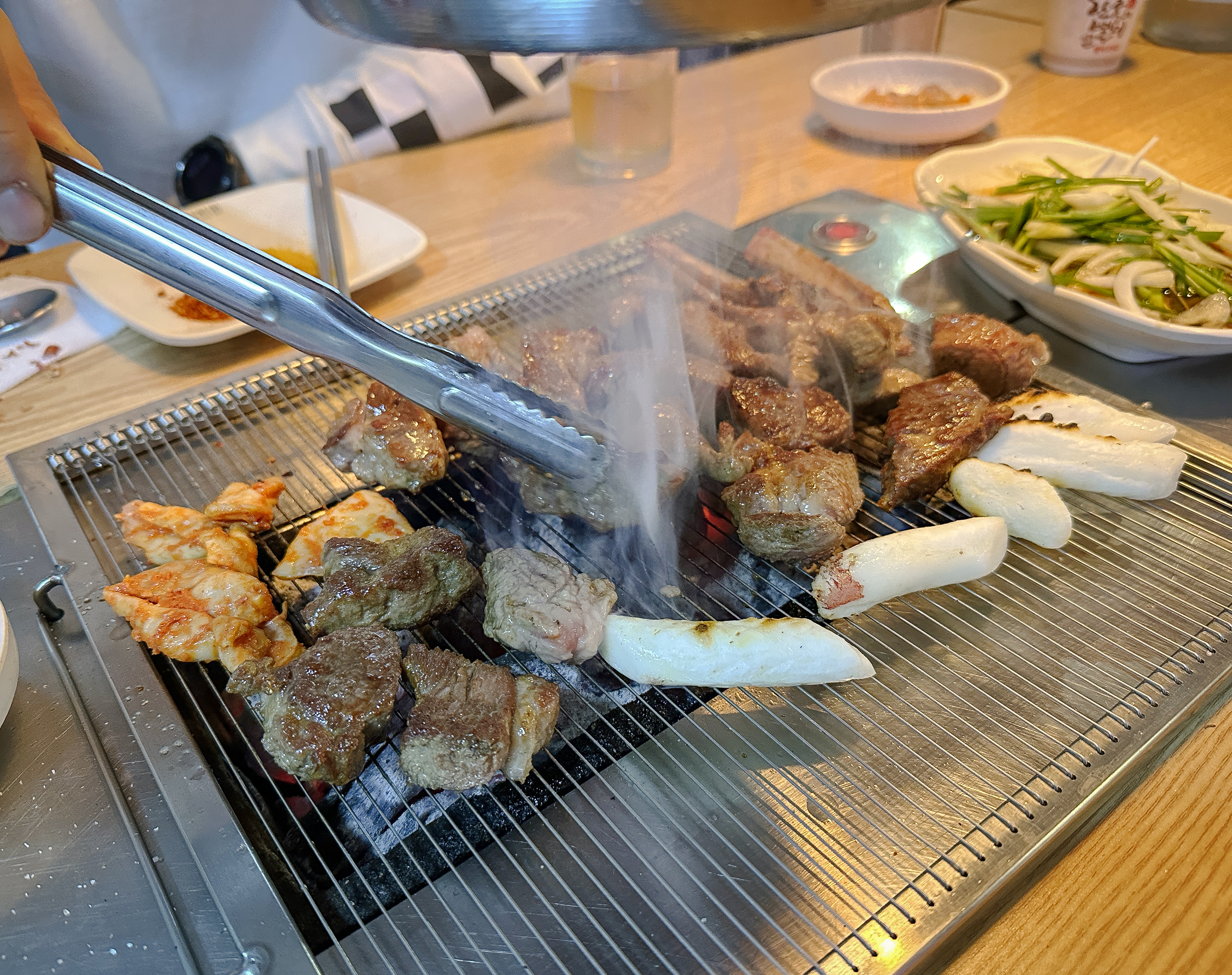 그래도 시간이 지나니 조금씩 익기 시작하더라고요. 양고기는 부드러우면서 맛이 좋았고, 한 입 크기로 큼직큼직하게 썰어져 나오는 고기는 먹기에 좋았습니다. 소시지와 양고기는 금세 익었는데 곱창은 생각보다 익는 게 더디게 느껴지더라고요.