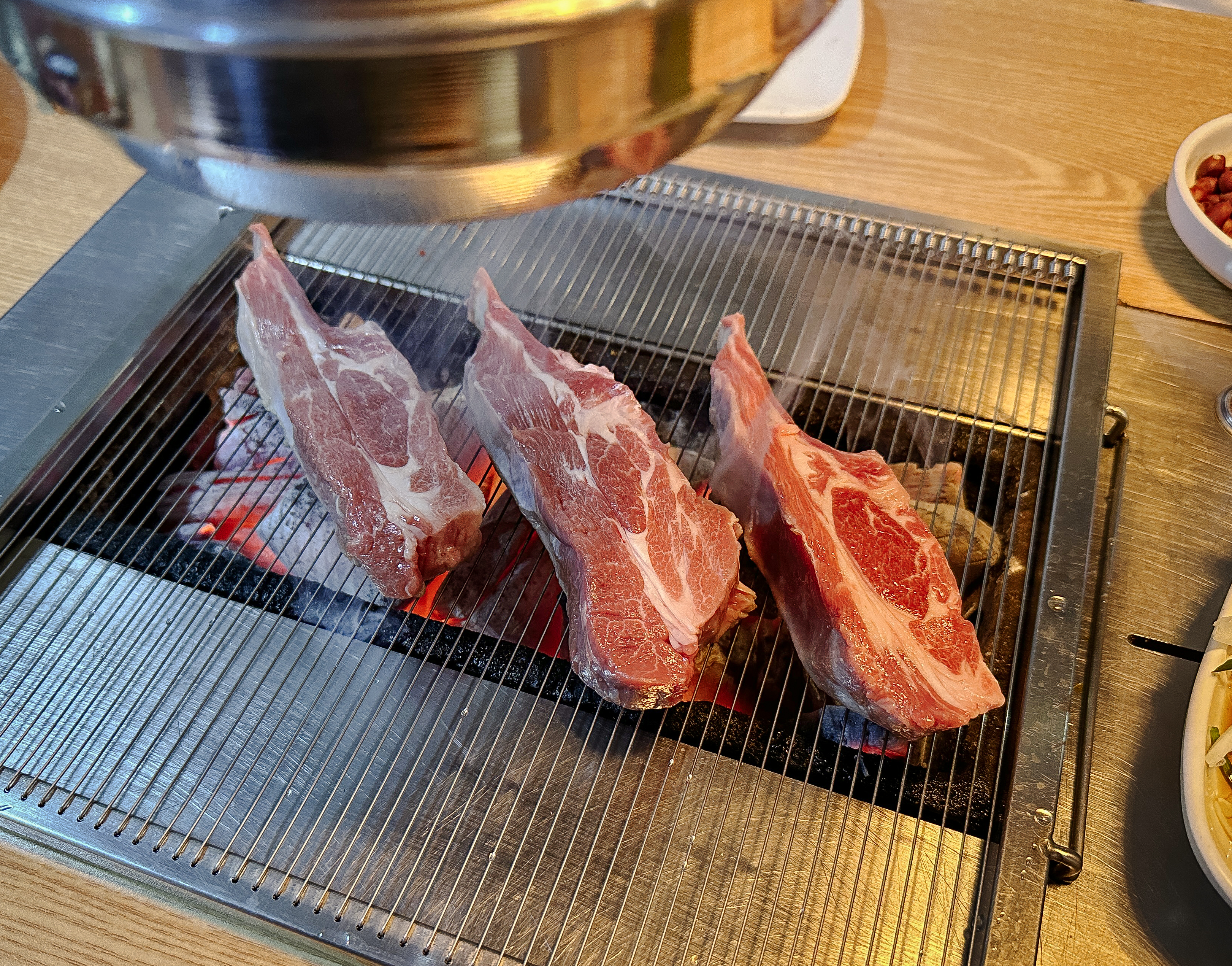 불판 위에 양갈비를 올리고 고기를 구웠습니다. 불판이 작아서 그런 건지 불이 약해서 그런건지 고기를 올리고 아무리 구워도 익지를 않더라고요. 그래도 인내심을 가지고 열심히 구워줬습니다.