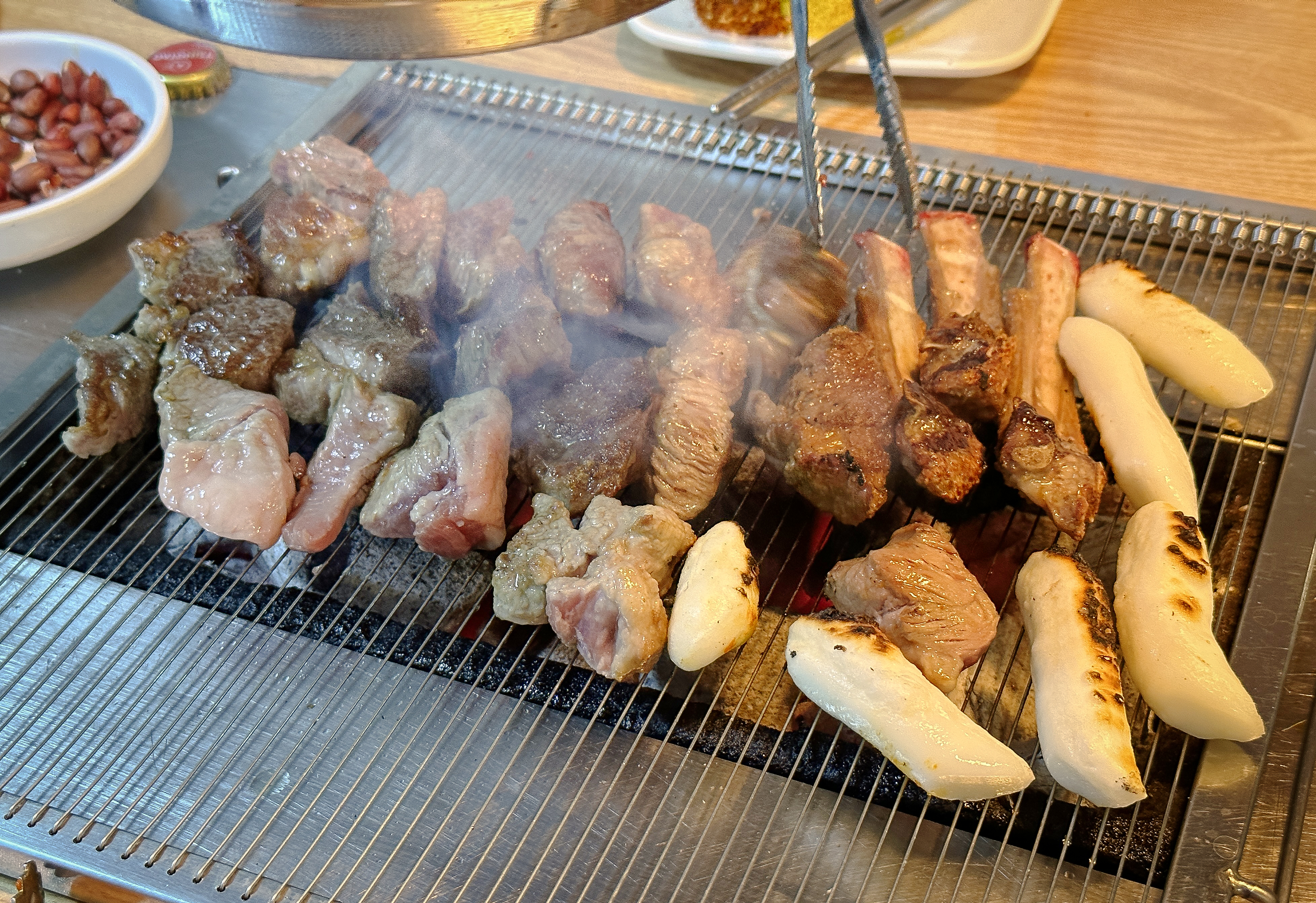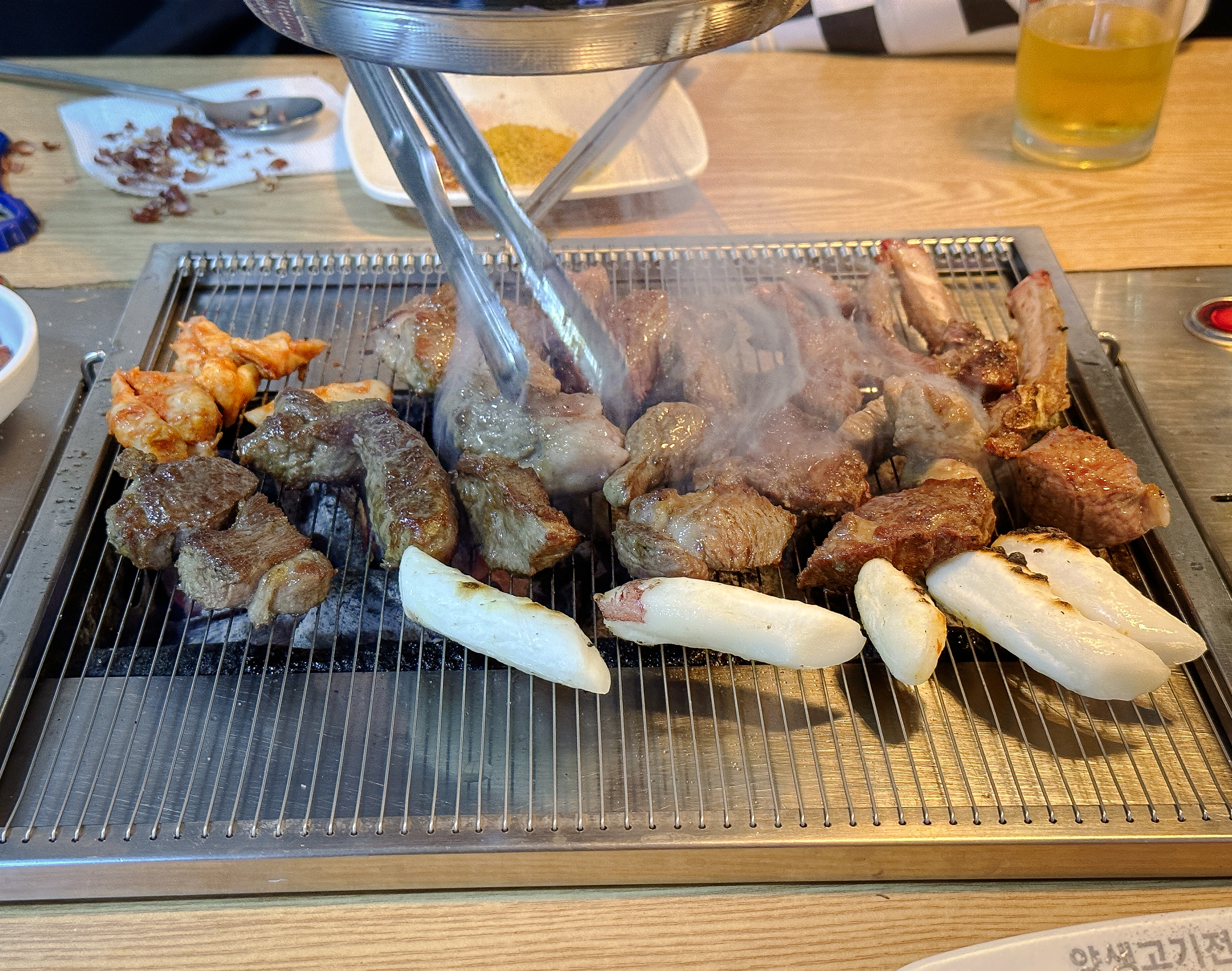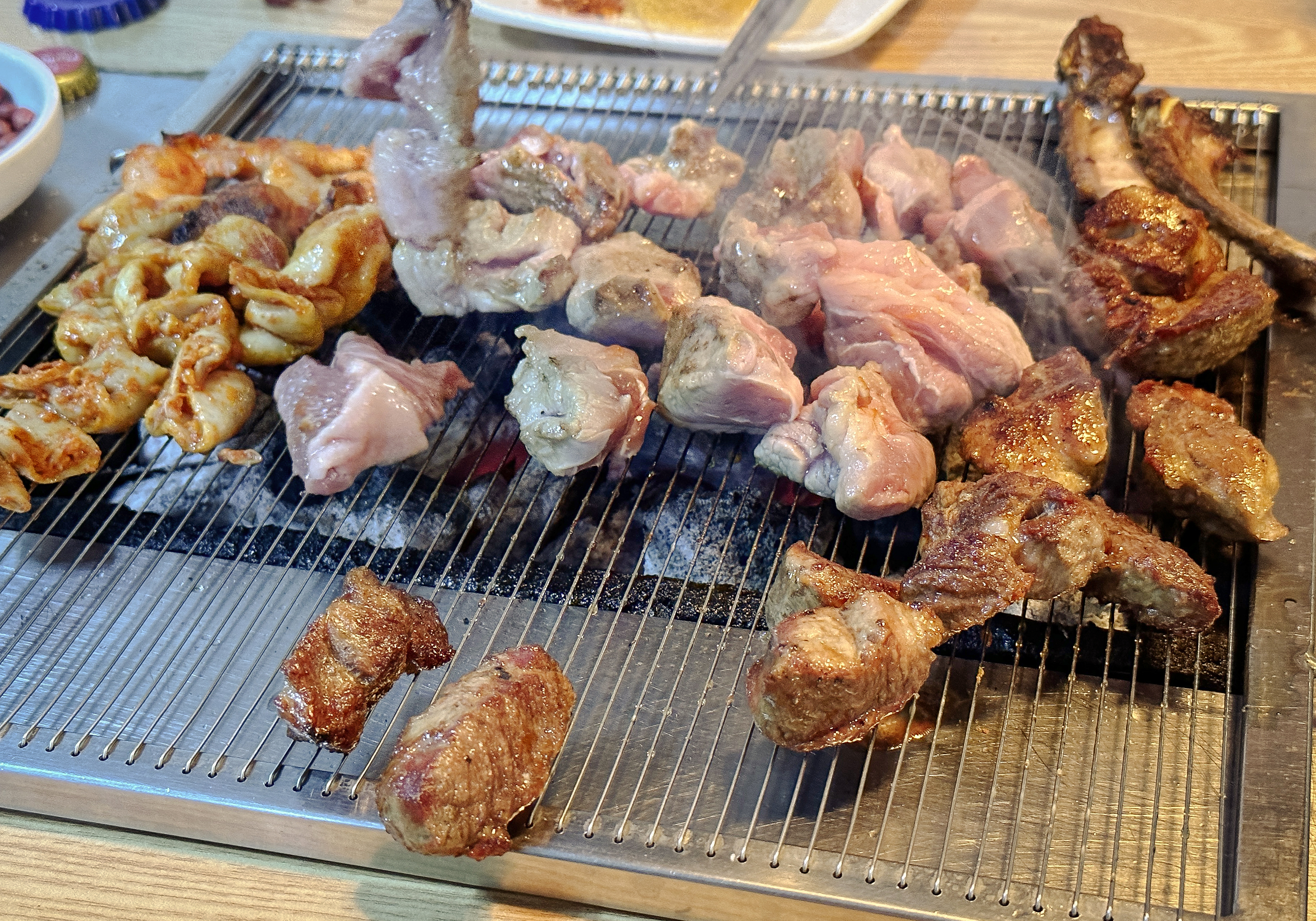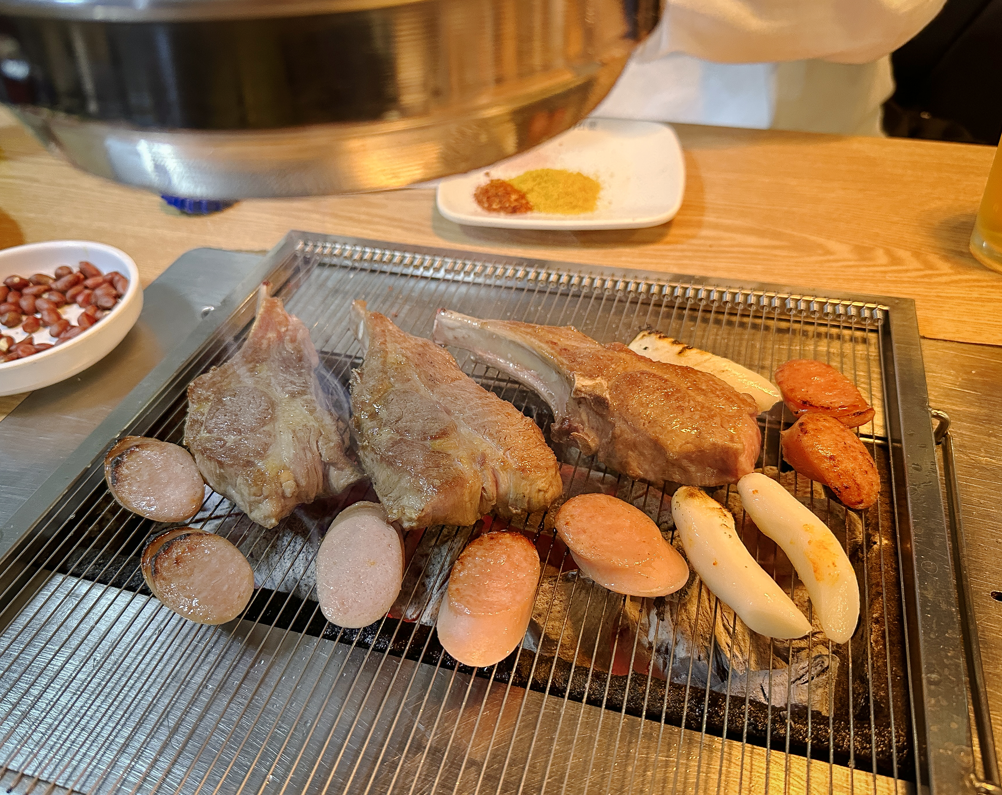 그래도 시간이 지나니 조금씩 익기 시작하더라고요. 양고기는 부드러우면서 맛이 좋았고, 한 입 크기로 큼직큼직하게 썰어져 나오는 고기는 먹기에 좋았습니다. 소시지와 양고기는 금세 익었는데 곱창은 생각보다 익는 게 더디게 느껴지더라고요.