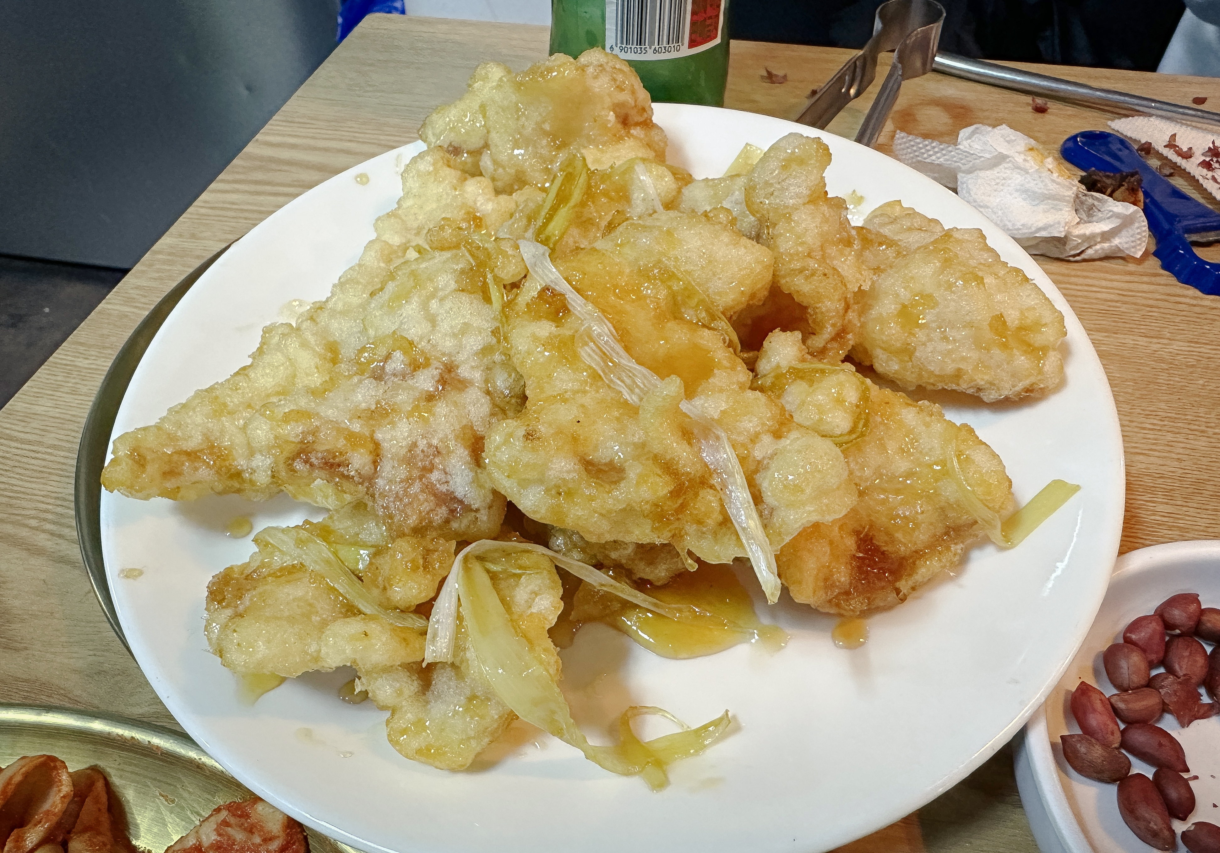 양고기는 무한리필로 먹을 수 있다고 했는데, 제가 간 날은 김치냉장고에 양고기도 금세 떨어지고 없었고, 사장님께 더 달라고 부탁드리니 눈치를 주시더라고요. 먹방 유튜버가 다녀갔다면 분명 꽤 많은 양을 먹었을 텐데, 저희는 만족스러운 양은 제공받지 못했습니다. 아쉬운 대로 꿔바로우도 주문했습니다. 투박하게 튀겨낸 꿔바로우는 새콤한 소스에 곁들여져 맛이 좋더라고요.