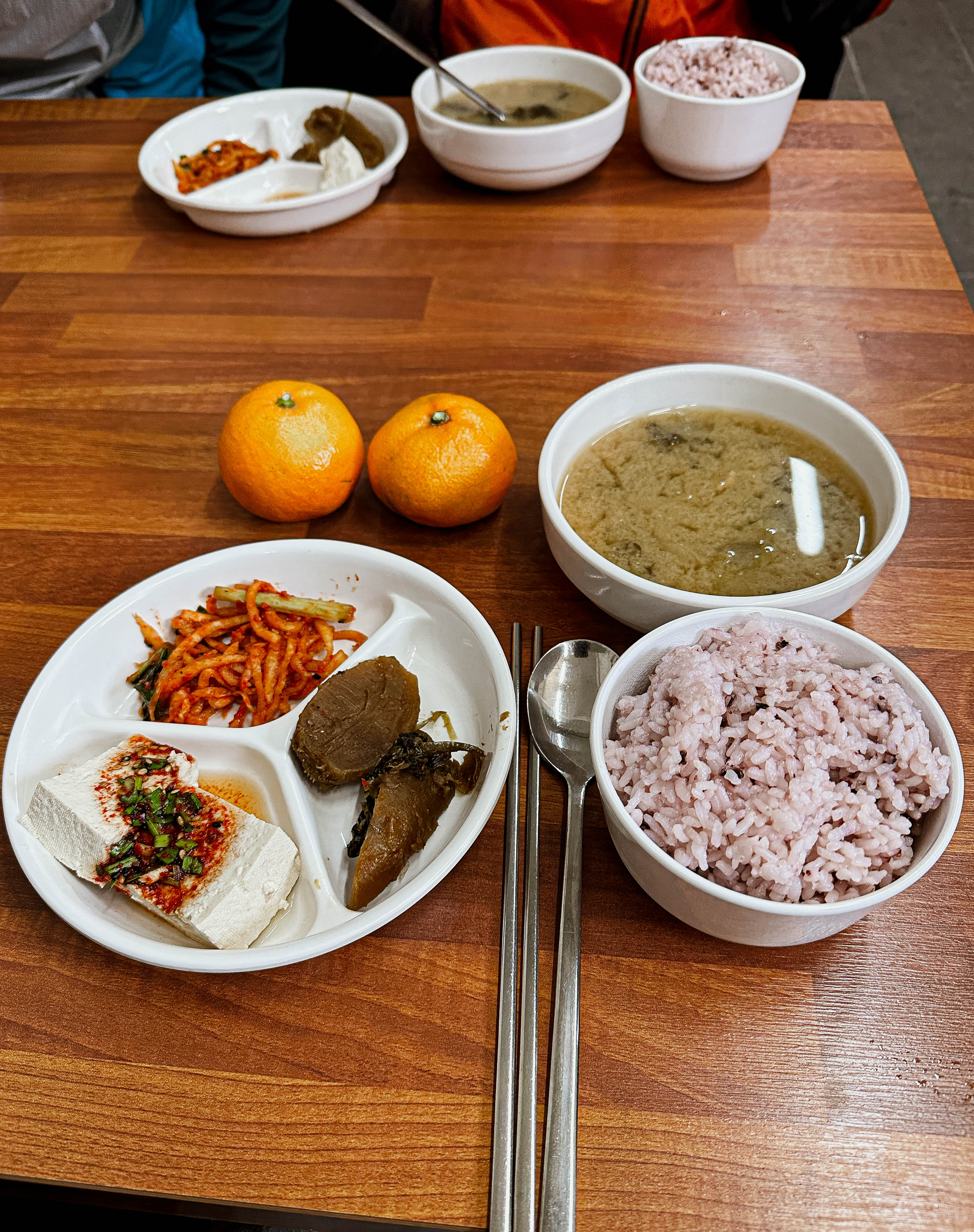 반찬과 된장국은 생각보다 맛있었습니다. 특히 편의점에서 가장 저렴하다고 생각하는 삼각김밥도 천원이 넘어가는데, 천 원에 밥, 국, 반찬, 후식까지 너무 실속 있고 맛있게 먹었습니다.