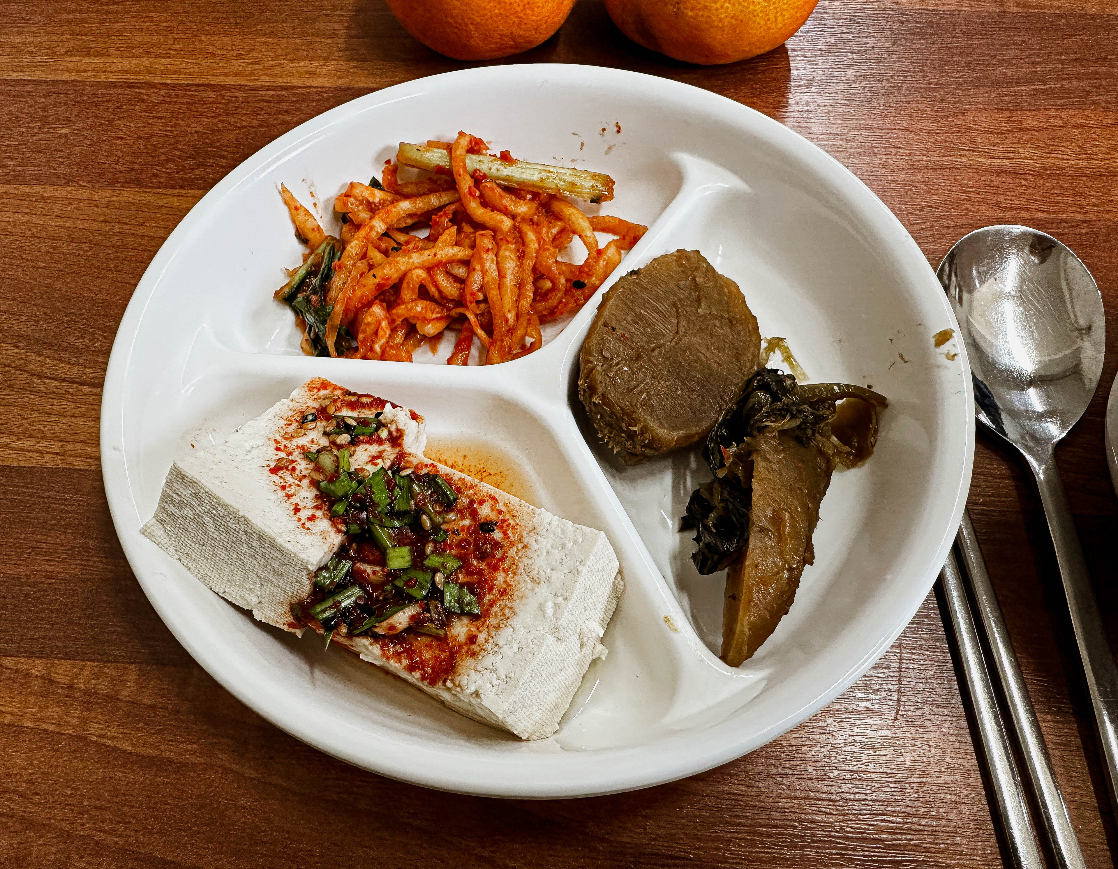 하나 둘 자리에 식사가 나오고 저도 차례가 되어 식사가 나왔습니다. 밥과 된장국 그리고 반찬은 두부, 무생채, 무조림이 나왔습니다. 이 메뉴는 바뀌는 것으로 알고 있는데, 보통의 식사에서 이렇게 나왔다면 투정을 부렸겠지만, 천원짜리 식사라는 것을 생각하면 누군가에겐 이런 식사도 훌륭한 한 끼가 될 수 있겠다 싶었습니다.