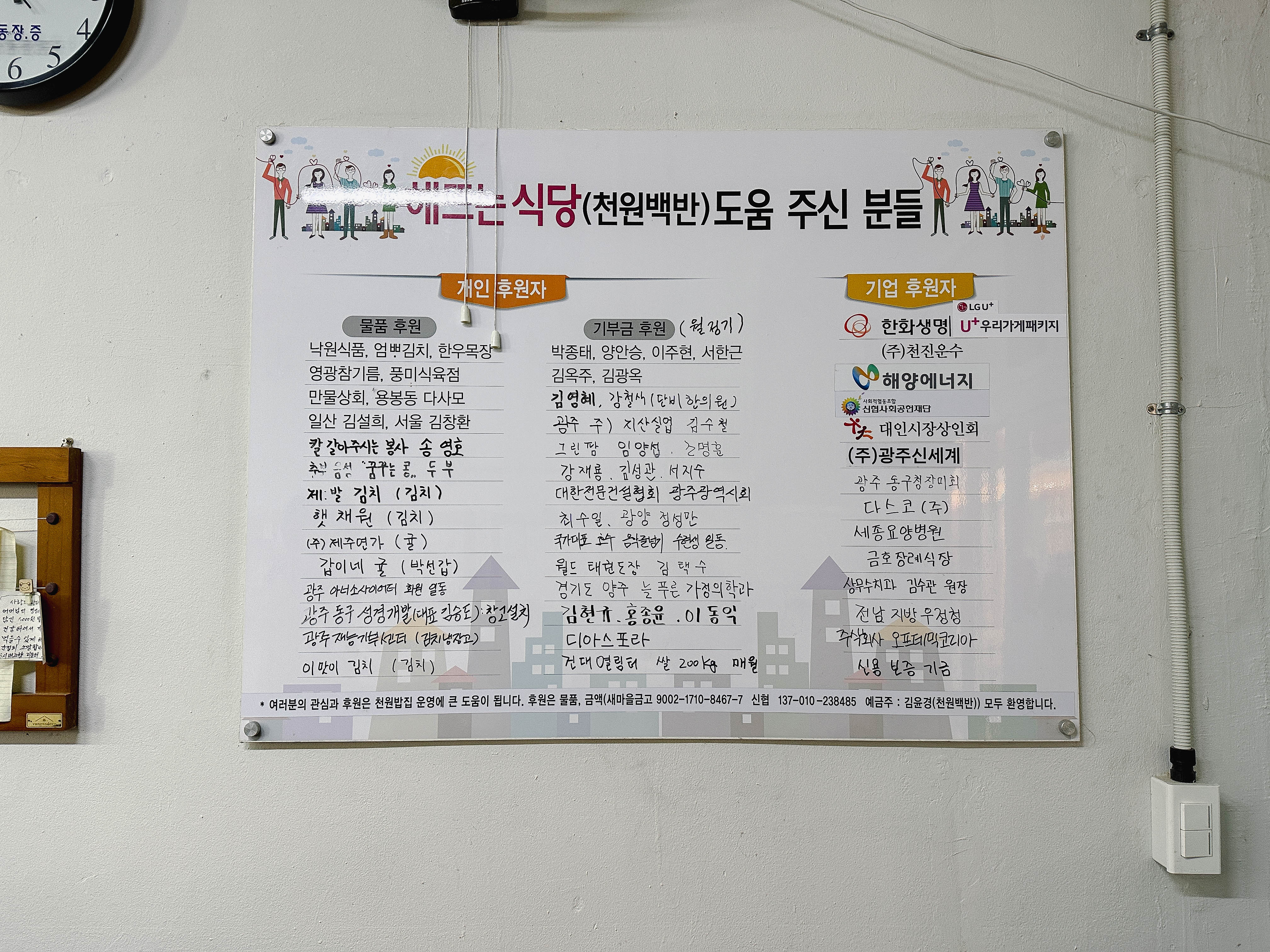 광주 해뜨는식당은 광주 동구 대인동 309-12 에 위치한 가게로 오로지 1,000원만 있으면 따뜻한 밥 한 끼를 먹을 수 있는 가게였습니다. 이곳은 11:30~14:00 까지 운영중인 가게로, 주로 어르신들이 많이 찾고 있었습니다. 가게에는 천원식당 유지를 위해 곳곳에서 후원사나 기부자들의 명단이 적혀있었습니다.