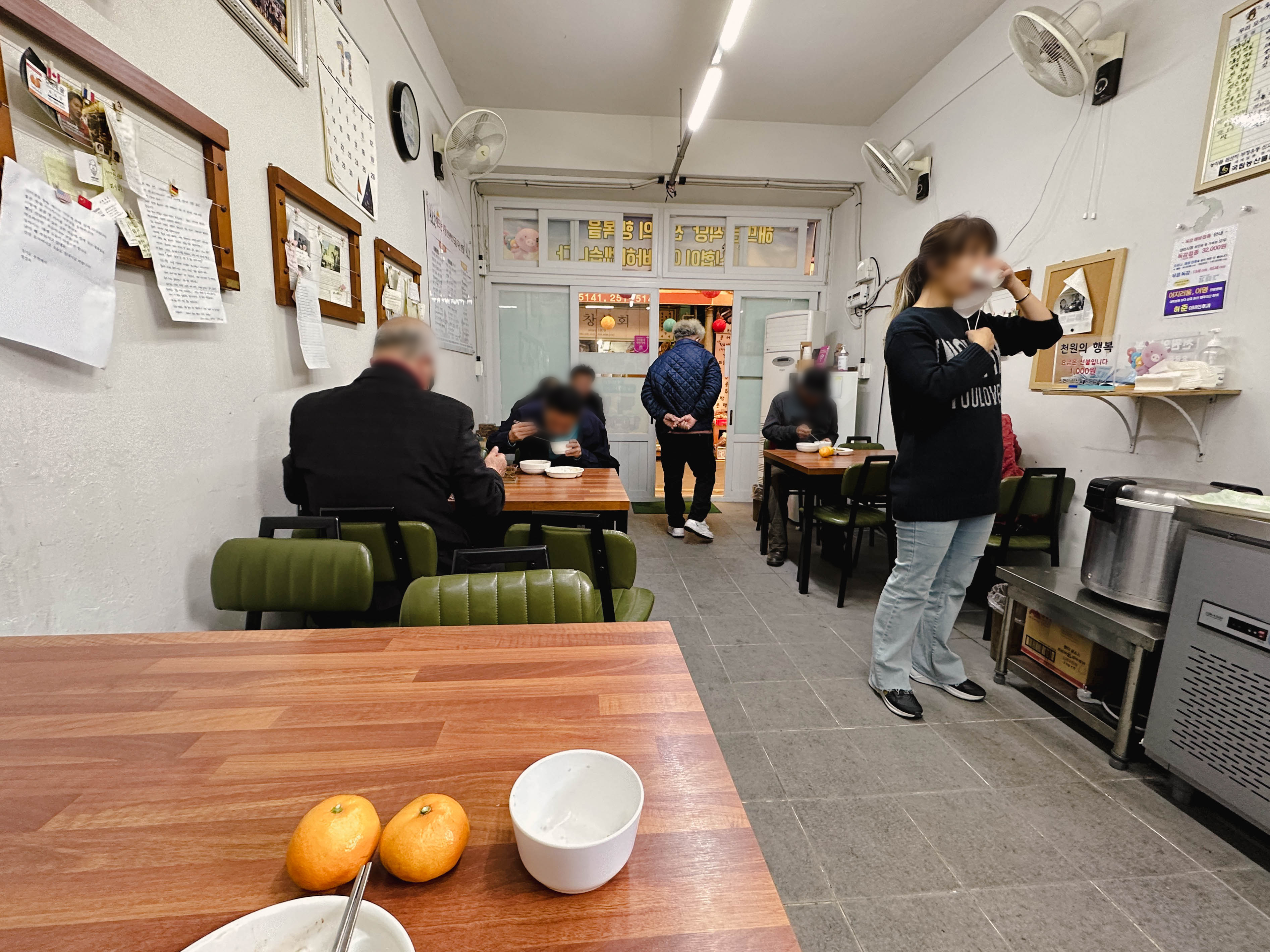 가게 안으로 들어가면 돈통이 놓여있는데, 천원을 넣고 자리에 앉아있으면 직접 음식을 가져다주시고 계셨습니다. 자리는 일반 식당처럼 일행끼리 맞춰서 앉는 게 아니라, 빈자리에 아무 곳이나 합석해서 앉으면 되었습니다.