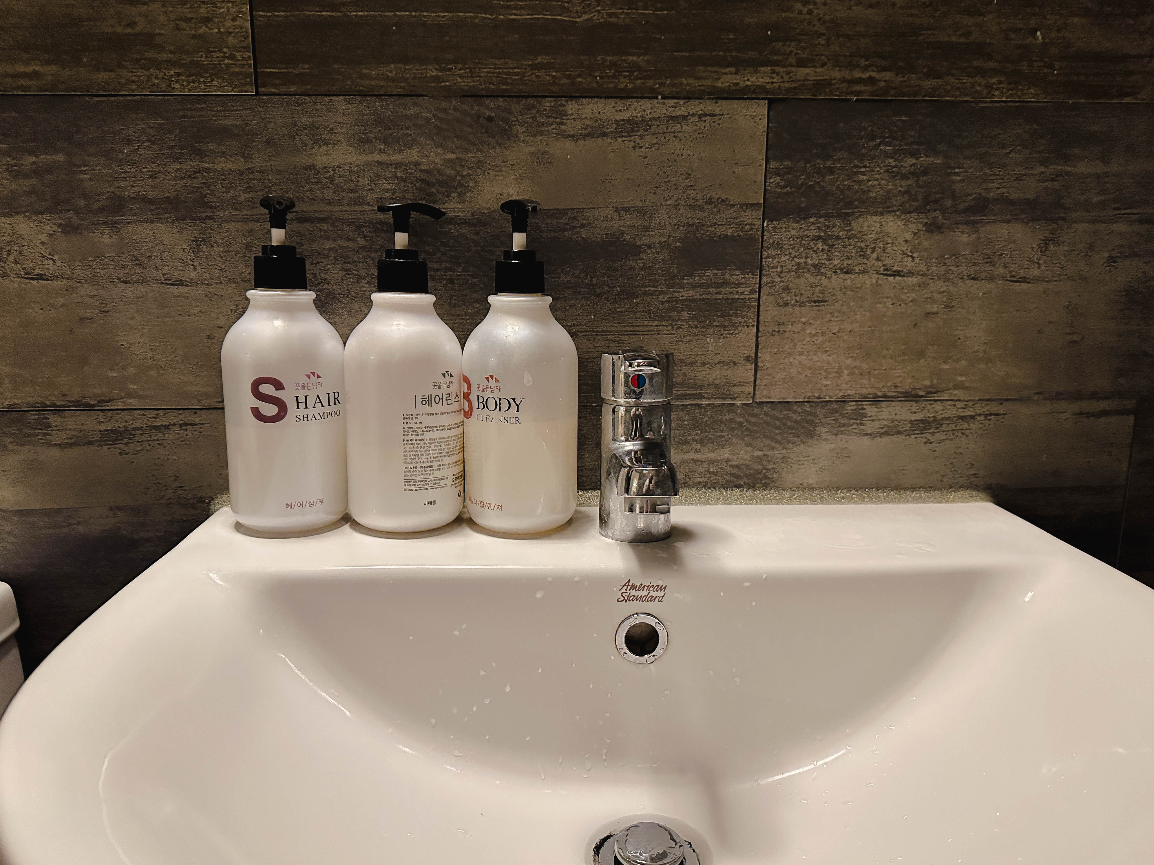 욕실은 방금 전 청소를 하셨는지 락스 냄새가 조금 났지만, 환기를 조금 시켜놓으니 사용하기 괜찮았습니다. 솔직히 샴푸, 린스, 바디워시는 공용으로 사용해도 괜찮은데, 비누, 치약 같은 경우는 공용으로 사용하면 좀 거부감이 있는데, 이곳은 그런 부분에서 불편함이 전혀 들지 않았습니다.