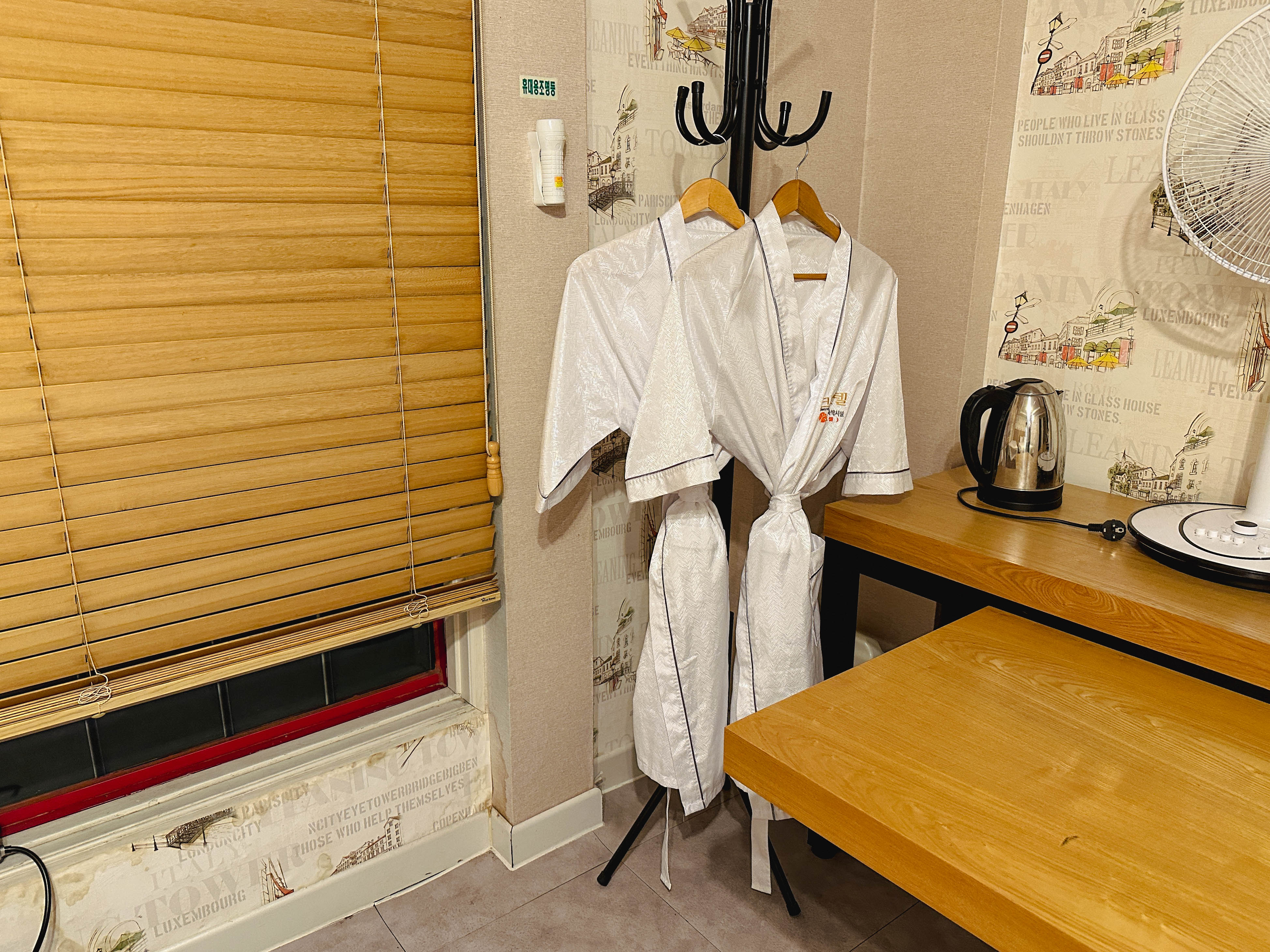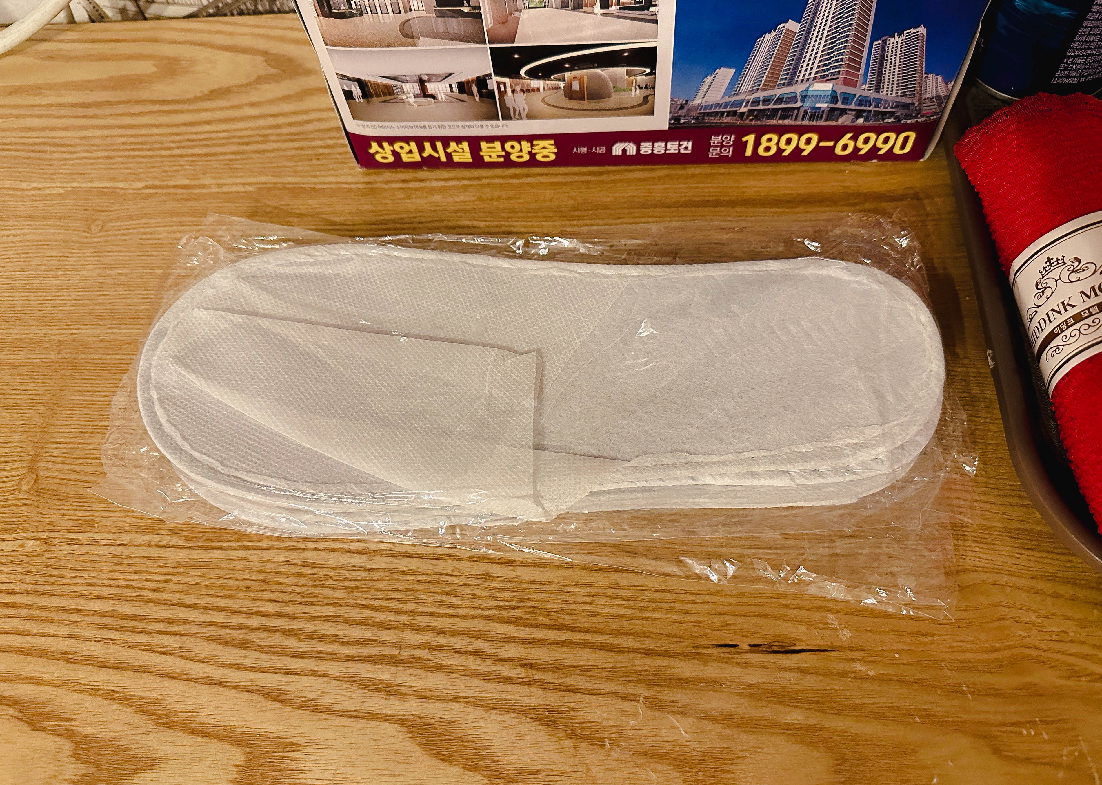 칫솔, 치약, 비누 등 위생용품 역시 비닐백에 담아주는 것이 아니라, 가지런히 정돈되어 있어서 편하게 이용이 가능했습니다. 독특하게 실내화도 제공하고 있었고, 가운도 보기 좋게 잘 걸어두셨더라고요.