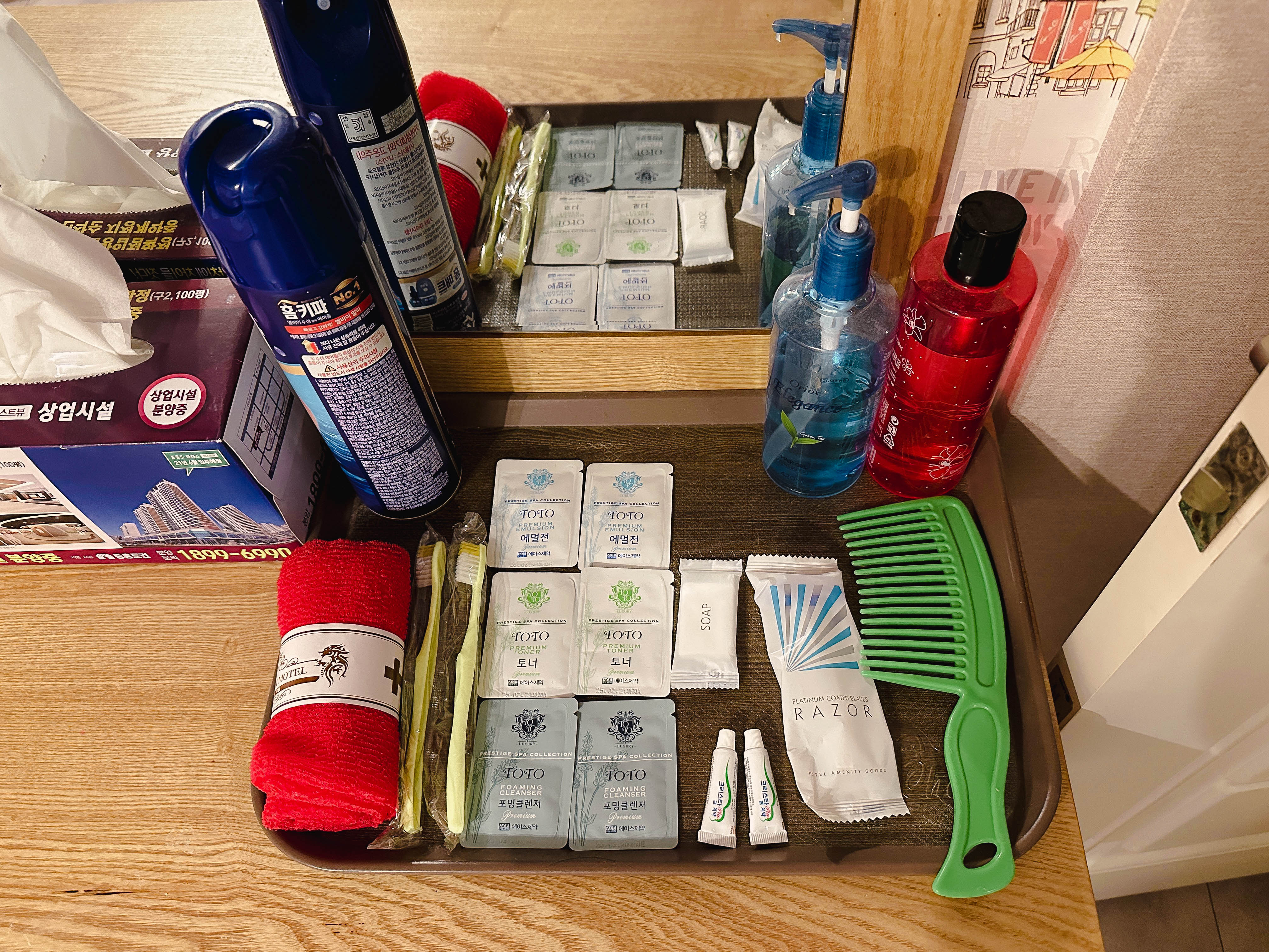 칫솔, 치약, 비누 등 위생용품 역시 비닐백에 담아주는 것이 아니라, 가지런히 정돈되어 있어서 편하게 이용이 가능했습니다. 독특하게 실내화도 제공하고 있었고, 가운도 보기 좋게 잘 걸어두셨더라고요.