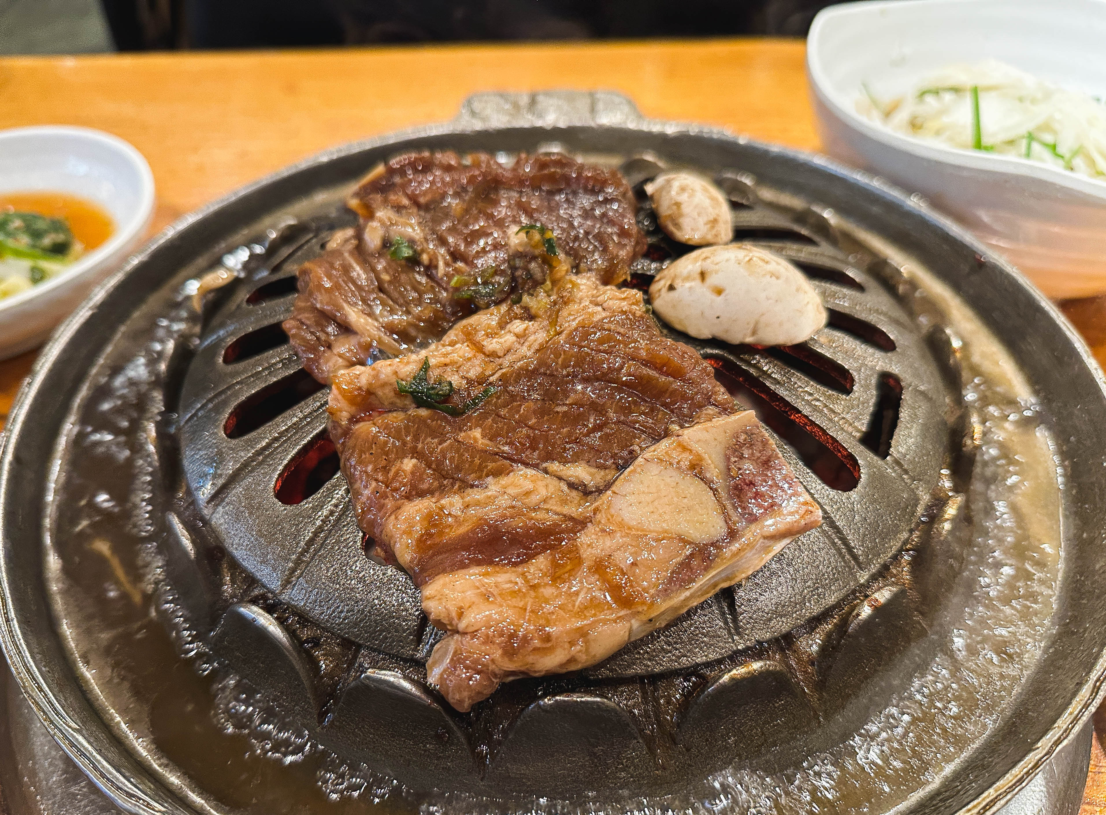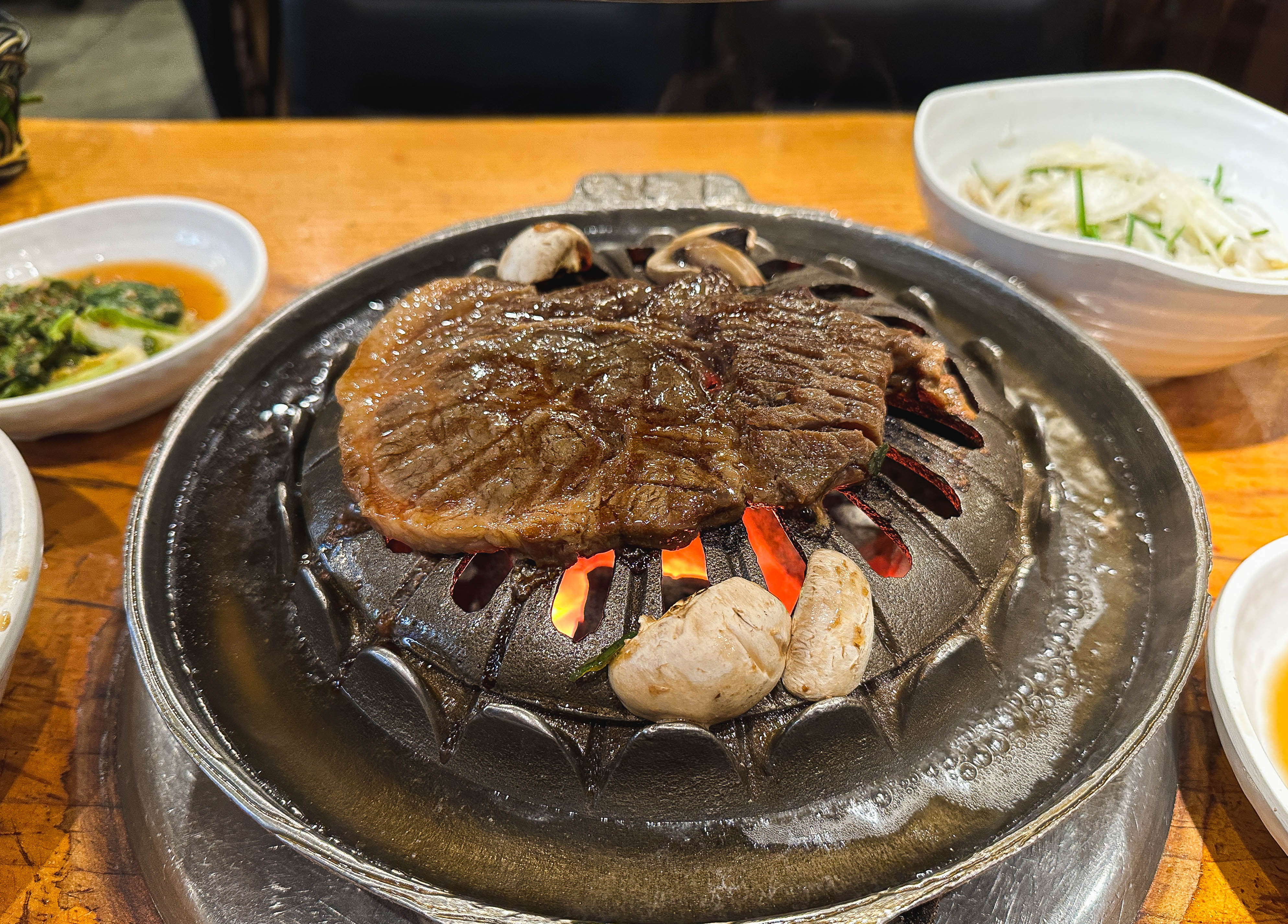 돼지갈비는 부드럽고 적당히 단맛과 감칠맛이 있어서 먹기에 좋았고, 같이 나온 양송이버섯과도 잘 어울렸습니다. 돼지갈비를 어느 정도 먹어 갈 때쯤 불사리를 달라고 부탁드렸습니다.