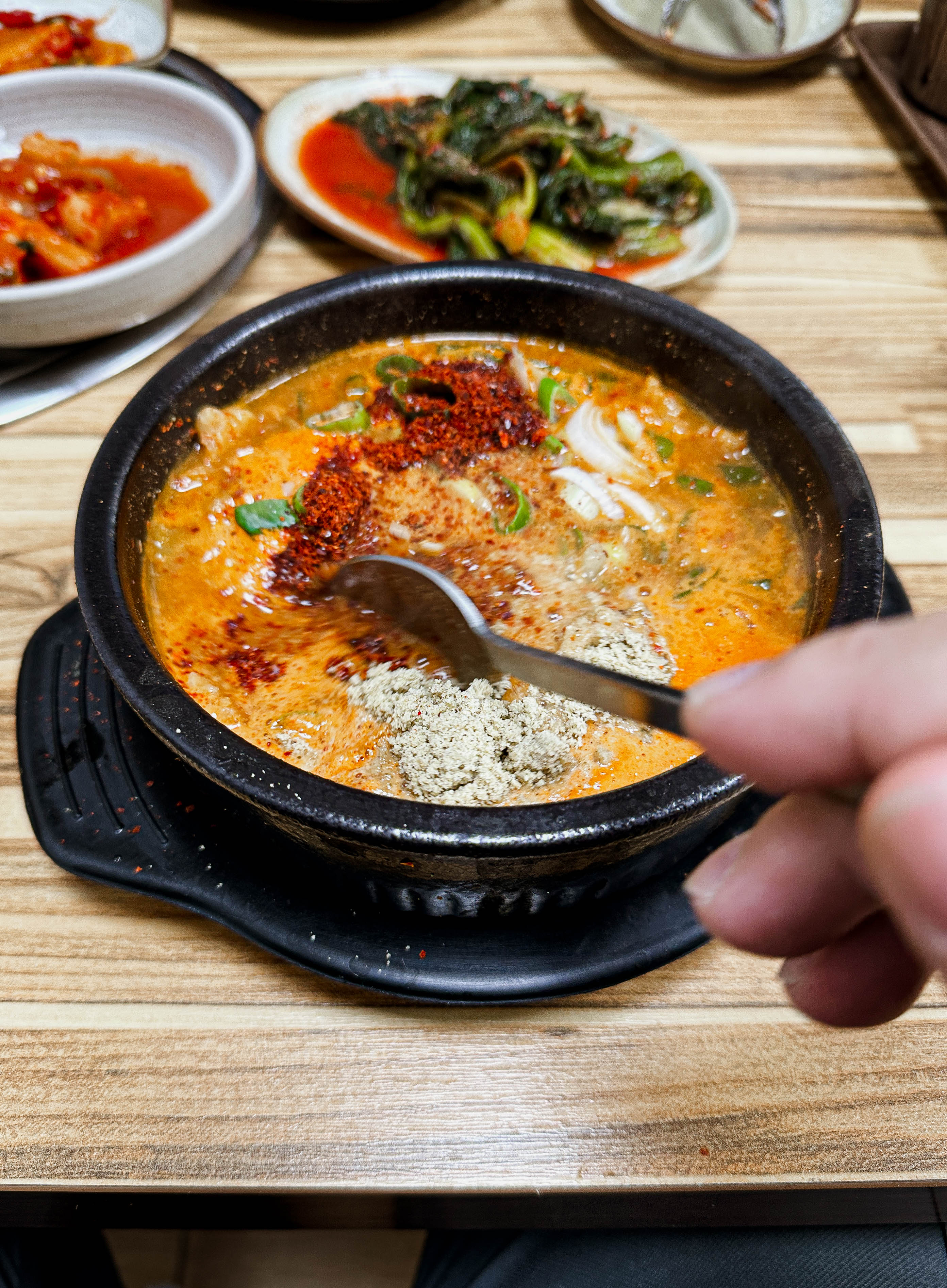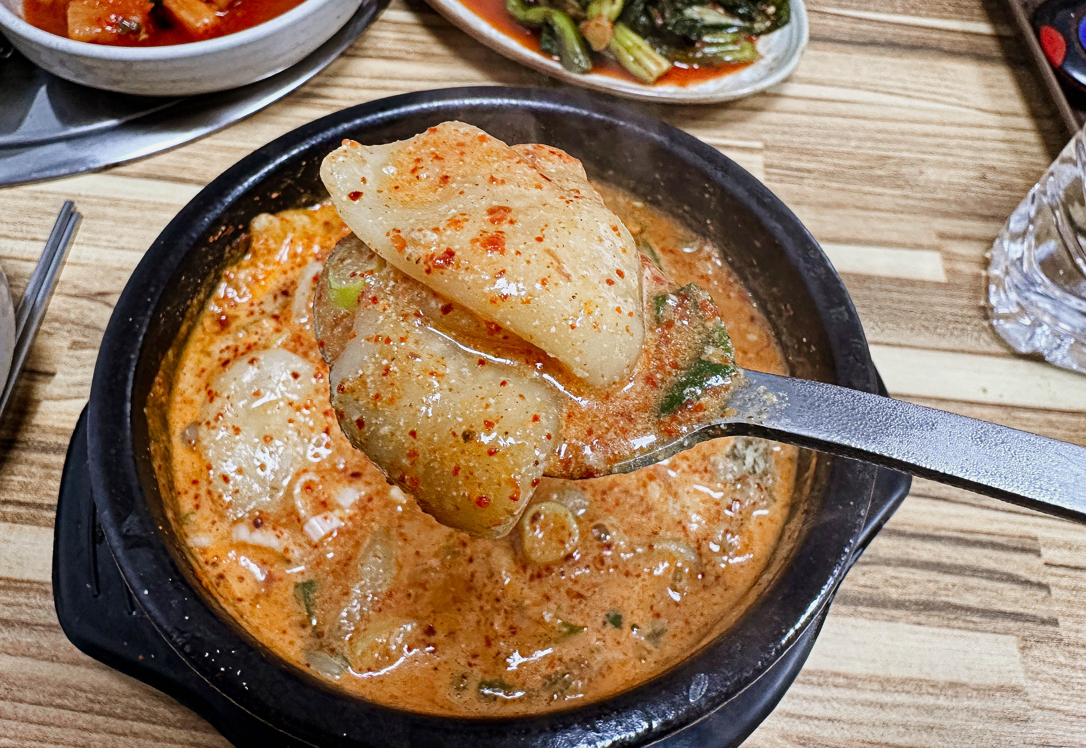 어죽과 함께 나온 양념을 잘 섞어준 다음에 수제비와 함께 국물을 떠서 먹었습니다. 국물은 양념이 많이 올라가 자극적일 줄 알았는데, 생각보다 간이 자극적이지 않아서 괜찮았습니다.