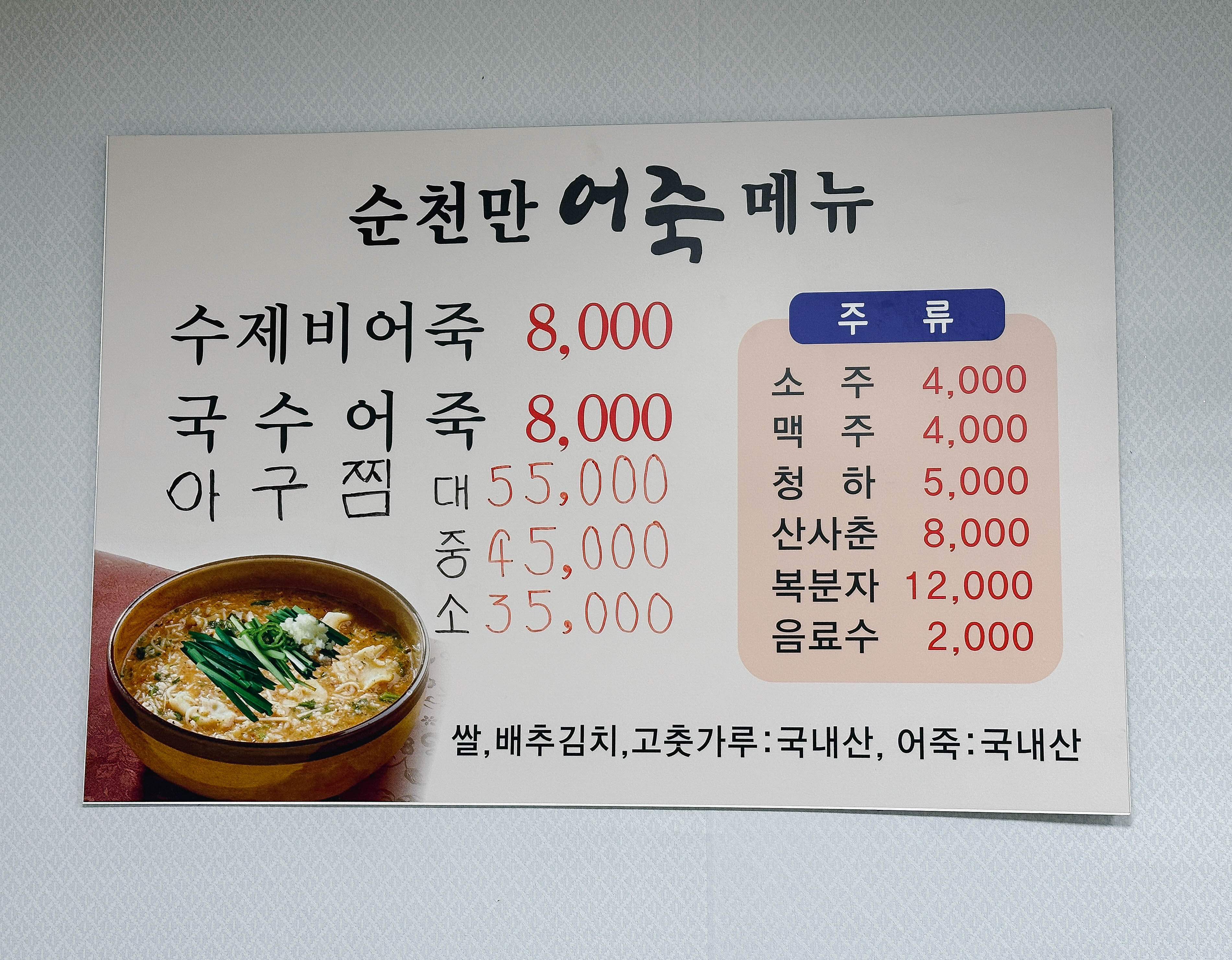 태안 순천만어죽의 메뉴는 위와 같습니다. 수제비어죽, 국수어죽, 아구찜으로 메뉴는 단출했는데, 저는 오히려 이렇게 전문적인 메뉴를 판매하는 가게가 더 신뢰가 가더라고요. 점심식사로 방문했기 때문에 국수 어죽과 수제비 어죽 중에 선택했는데, 개인적으로 수제비를 좋아해서 수제비어죽으로 주문했습니다.