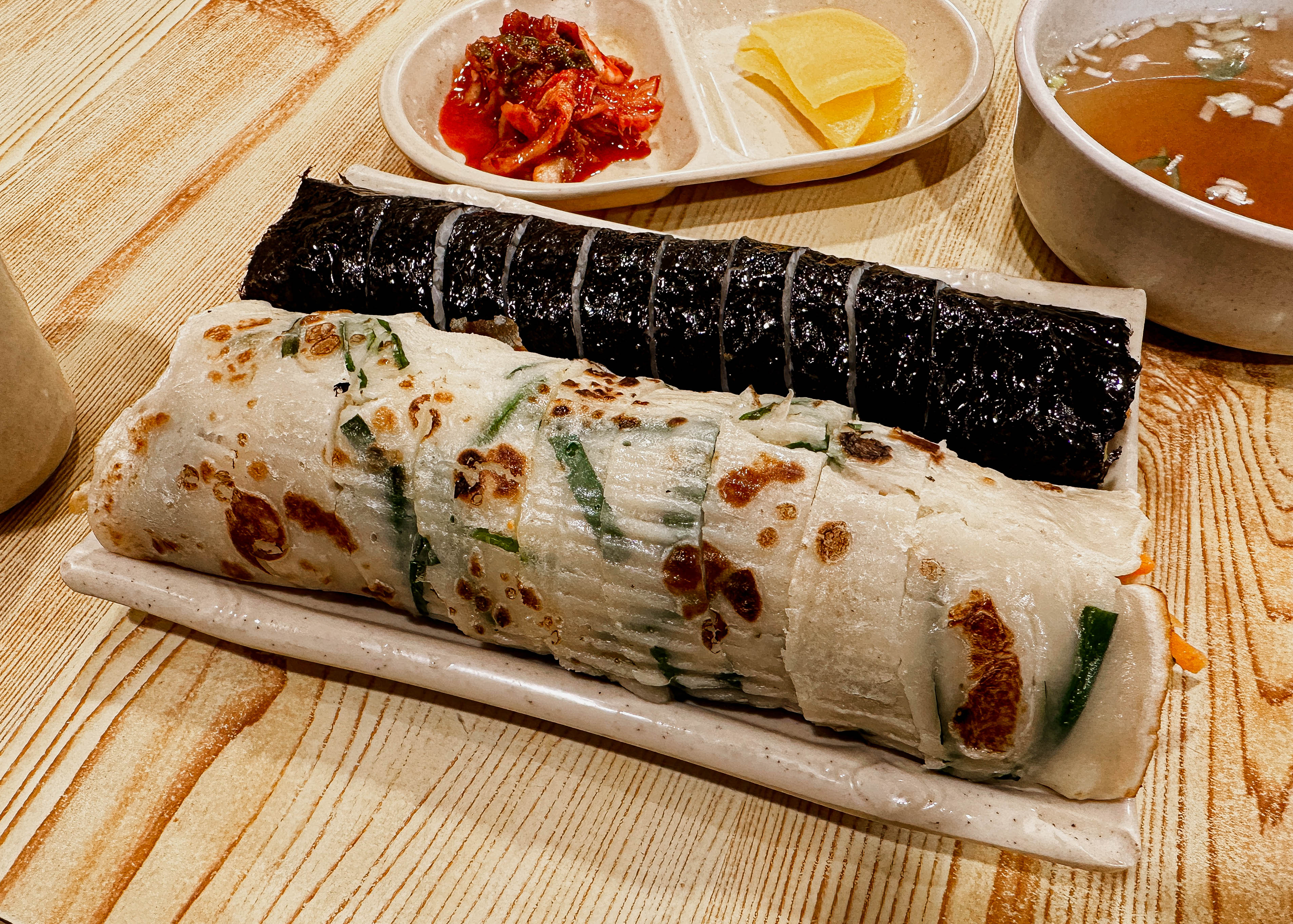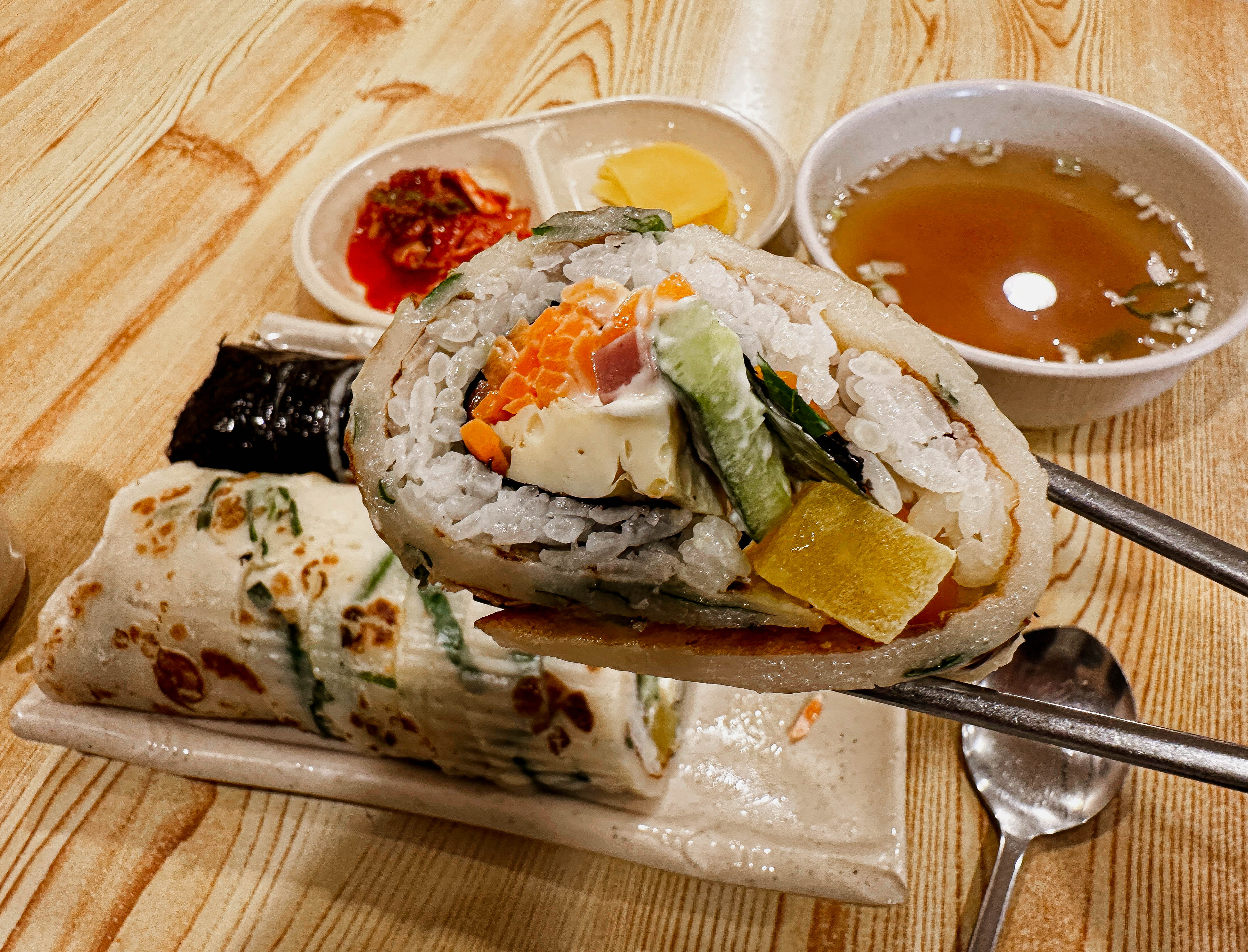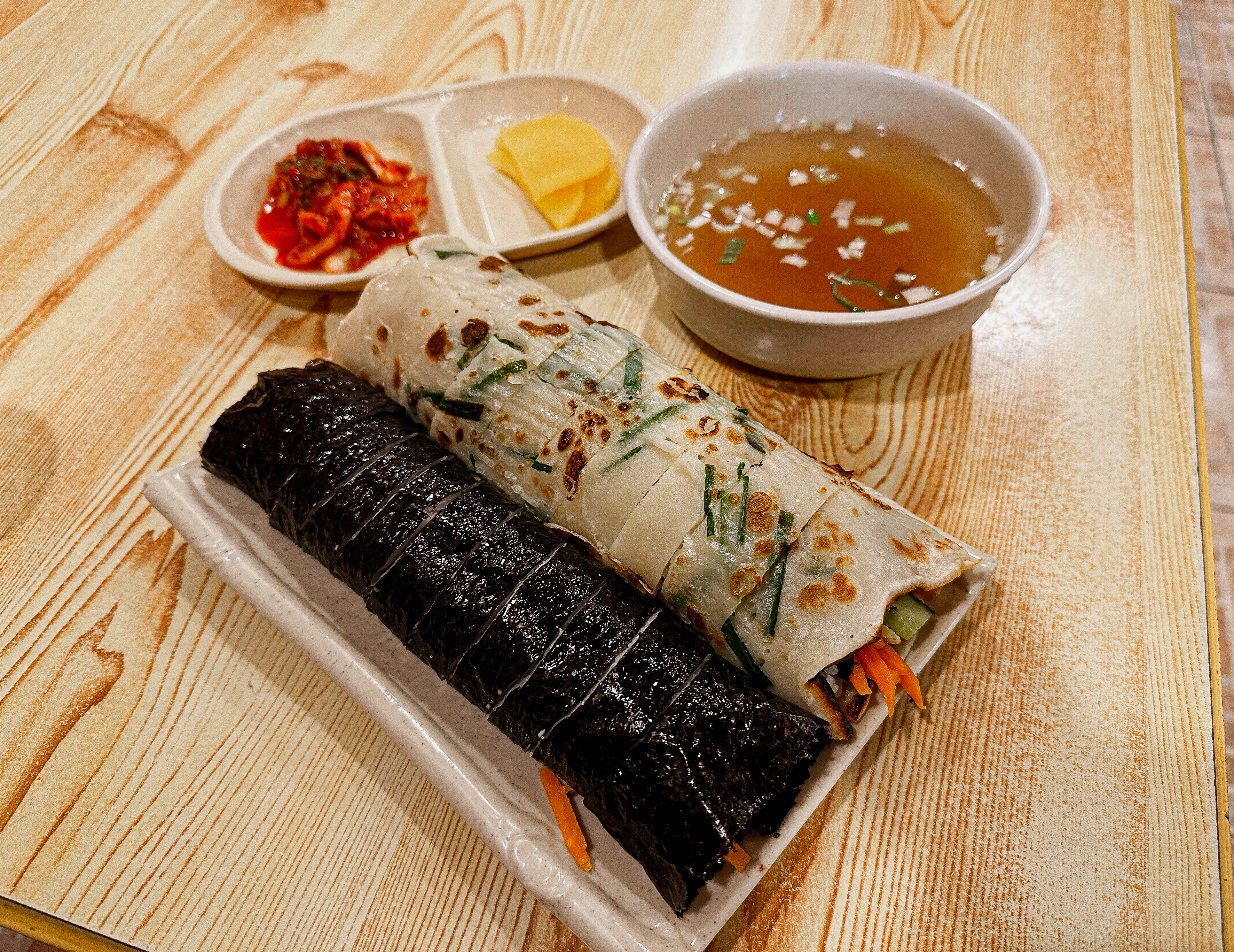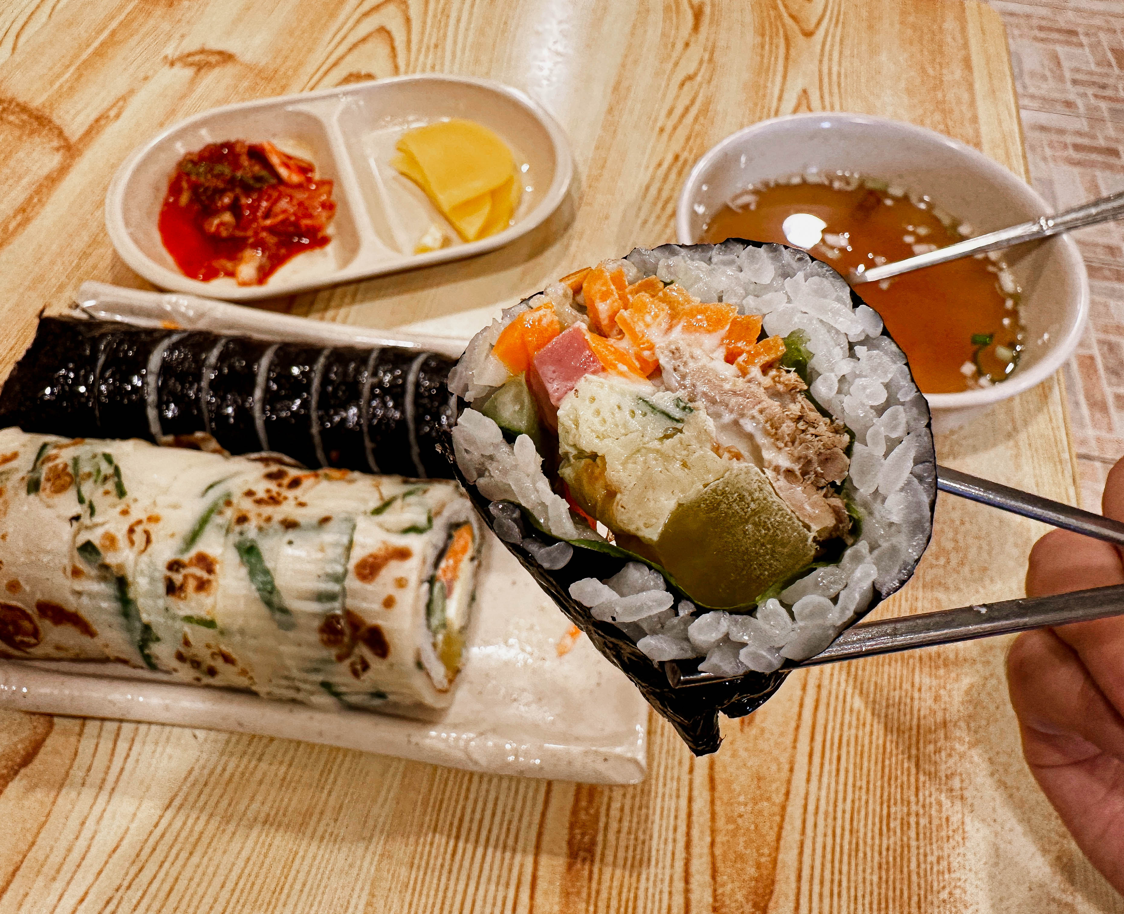 곧이어 주문한 부침개김밥과 참치김밥이 나왔습니다. 부침개 김밥을 싸는 모습을 지켜봤는데, 김밥에 김을 제외한 속재료를 미리 말아둔 다음에 부침개를 같이 말아서 김밥 잘라주는 기계로 썰어서 내어주시더라고요.