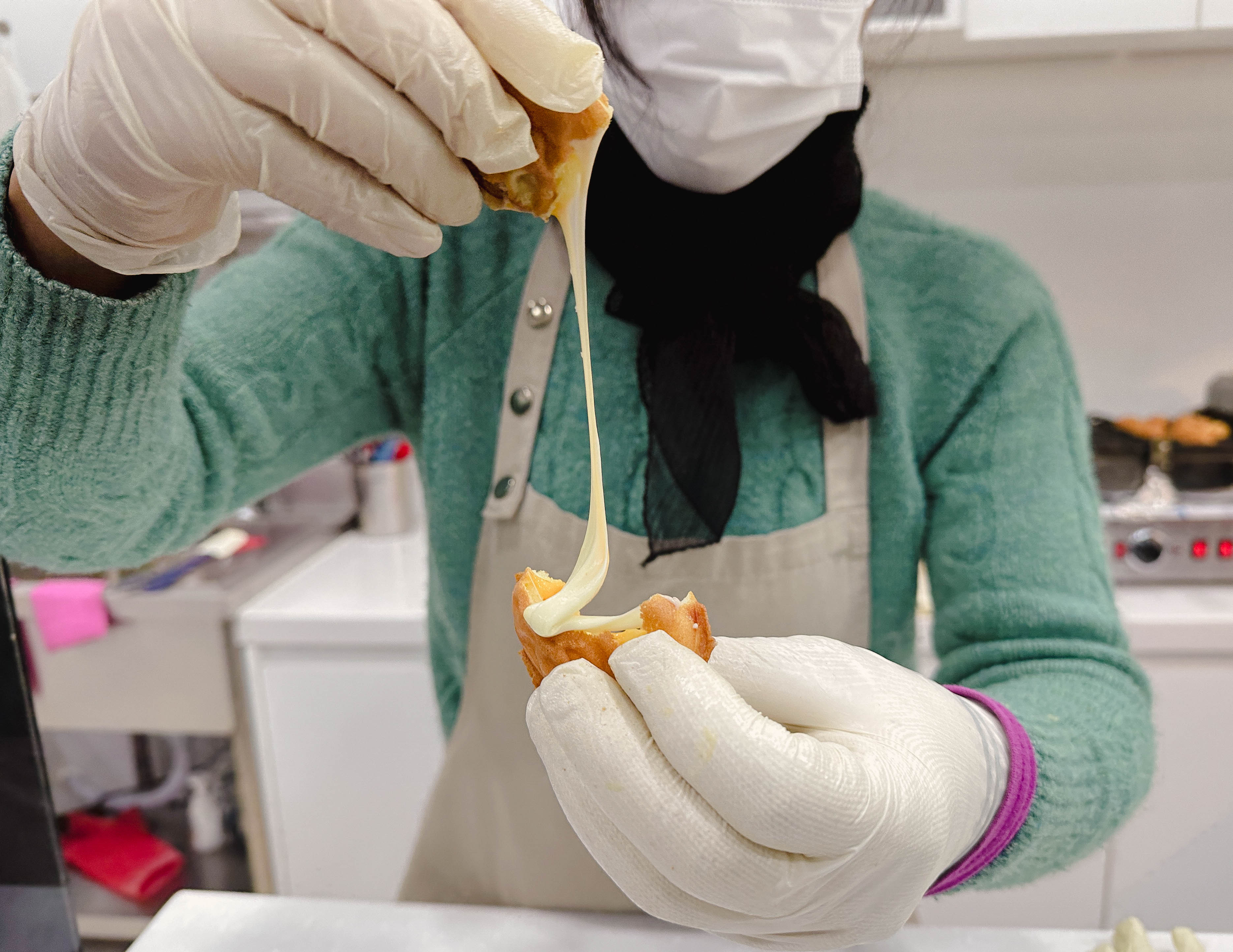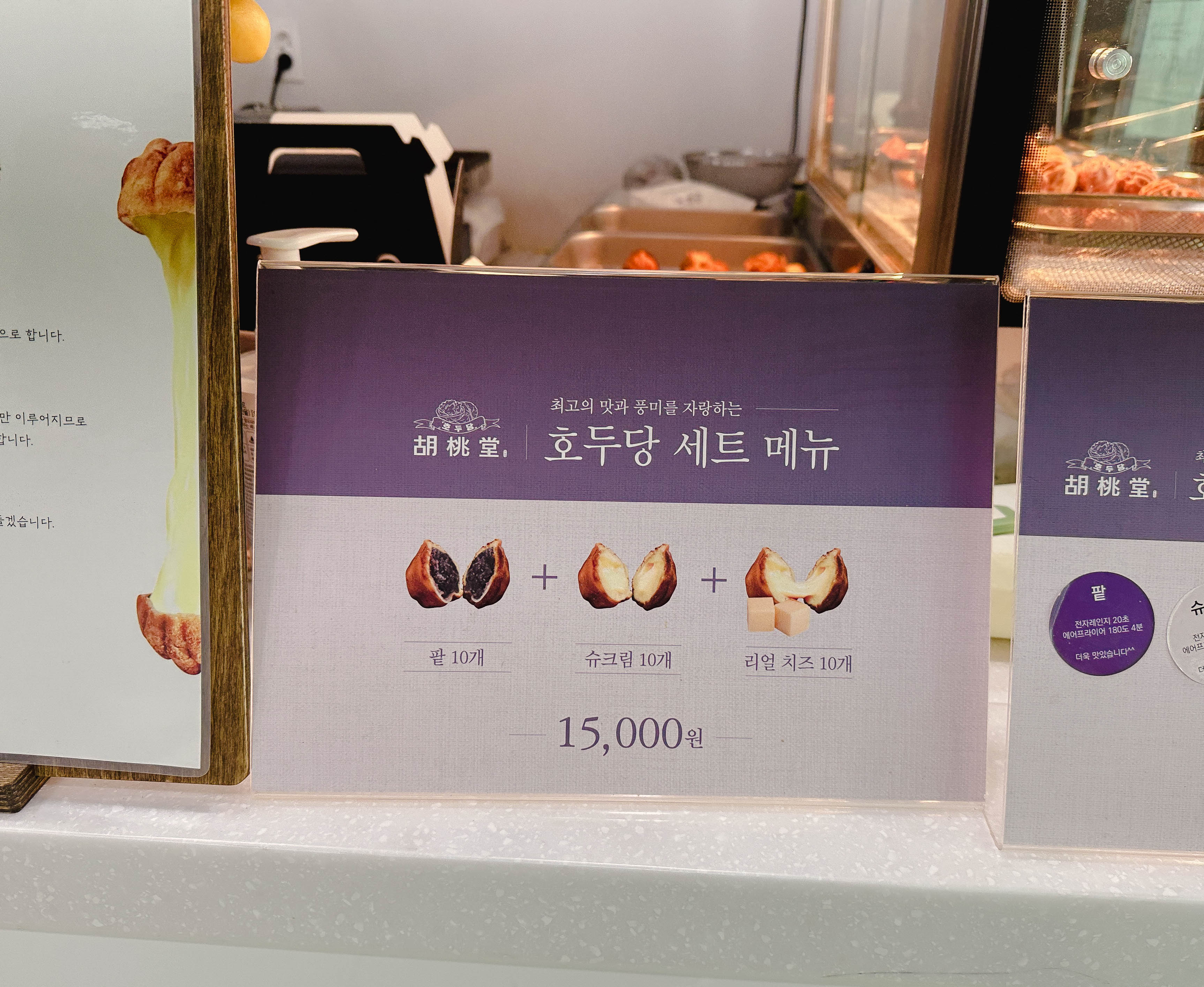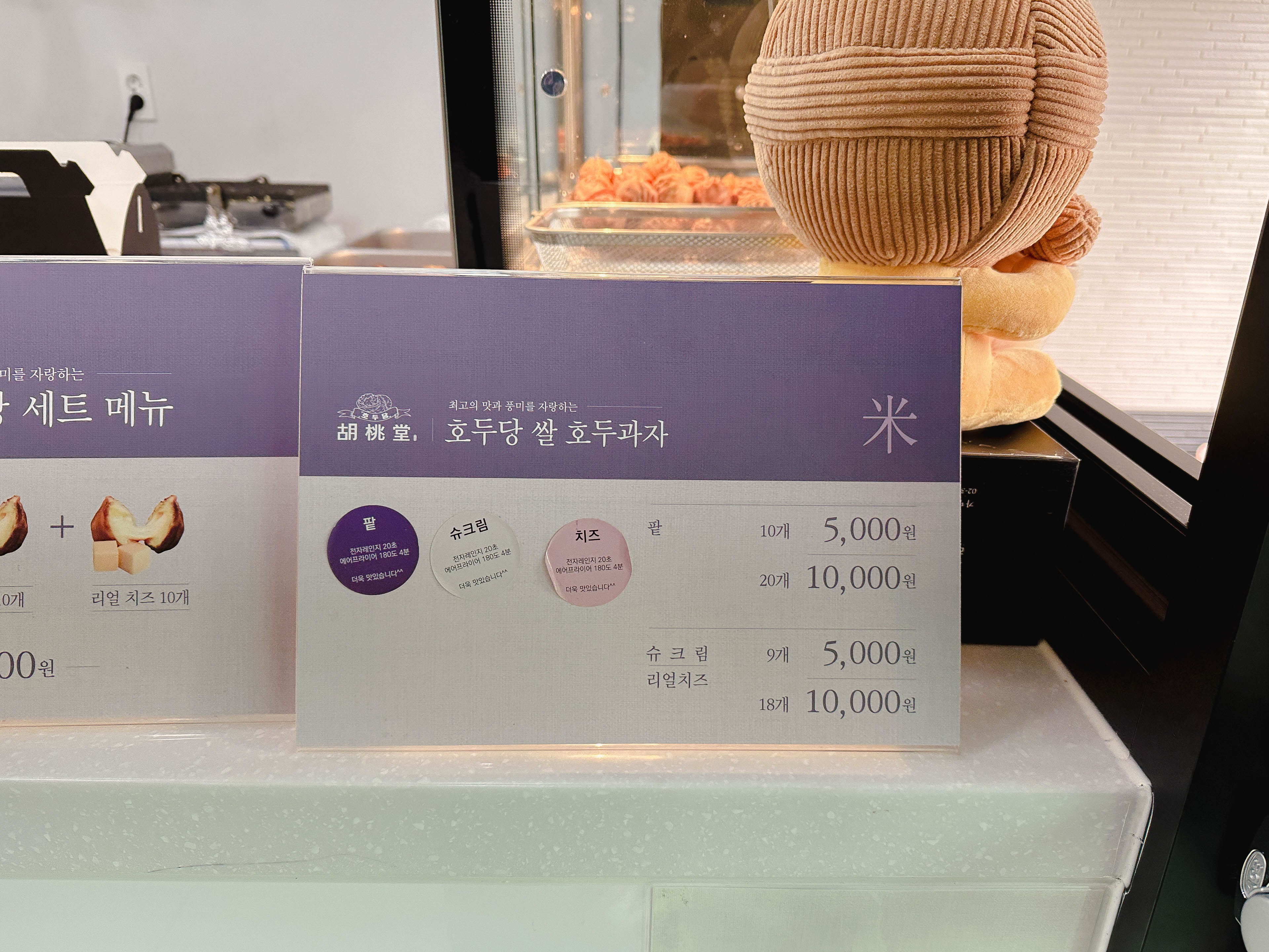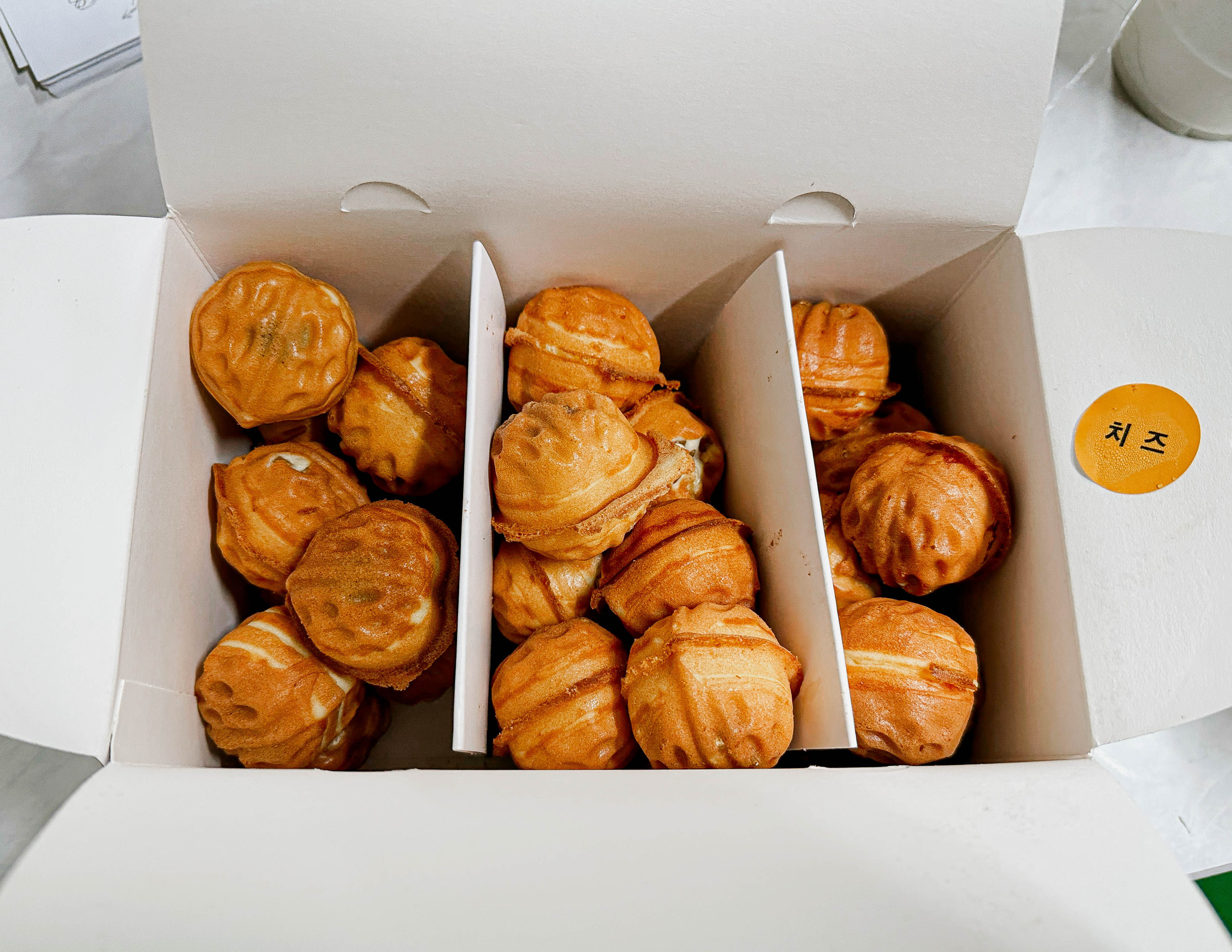 저희는 호두당 세트메뉴를 주문했습니다. 호두당의 세트메뉴는 팥, 슈크림, 리얼치즈가 10개씩 총 30개의 호두과자가 들어있는 세트였습니다. 치즈가 식으면 안 늘어날까 봐 사장님께 갓 구워진 호두과자를 한 번 늘여봐 달라고 했는데, 치즈가 많이 녹아있어서 그런지 생각했던 것보다 사진 찍기가 쉽지는 않더라고요.
