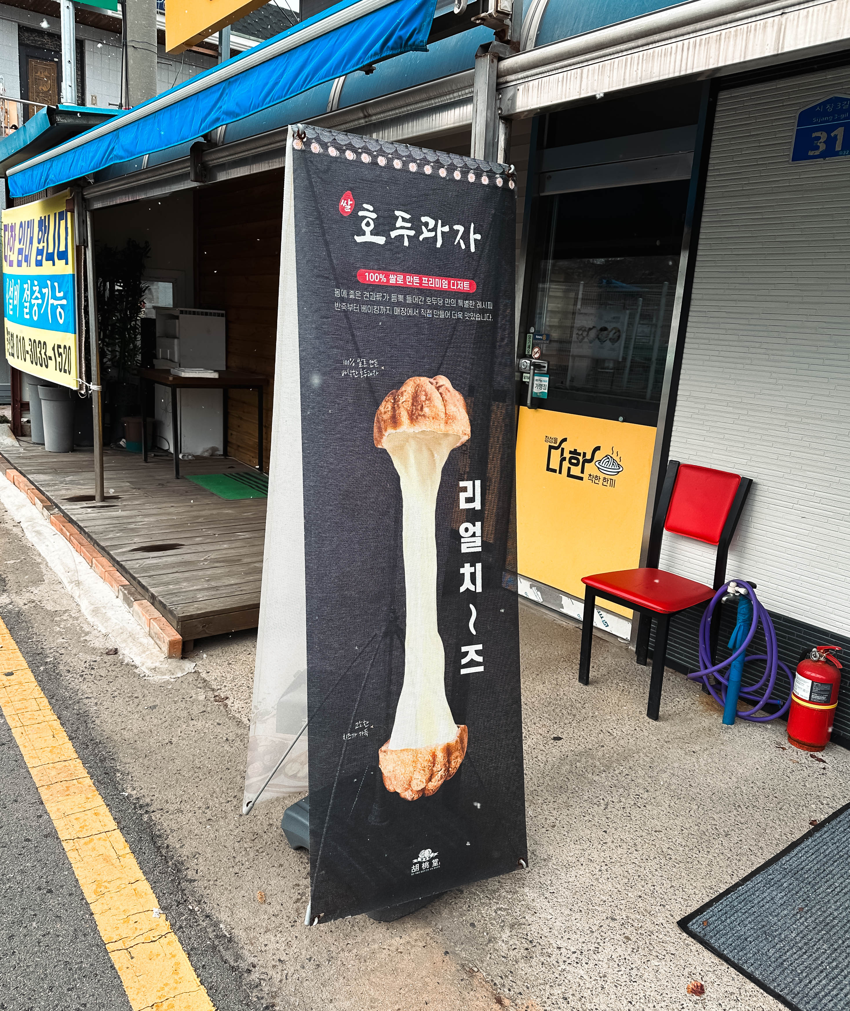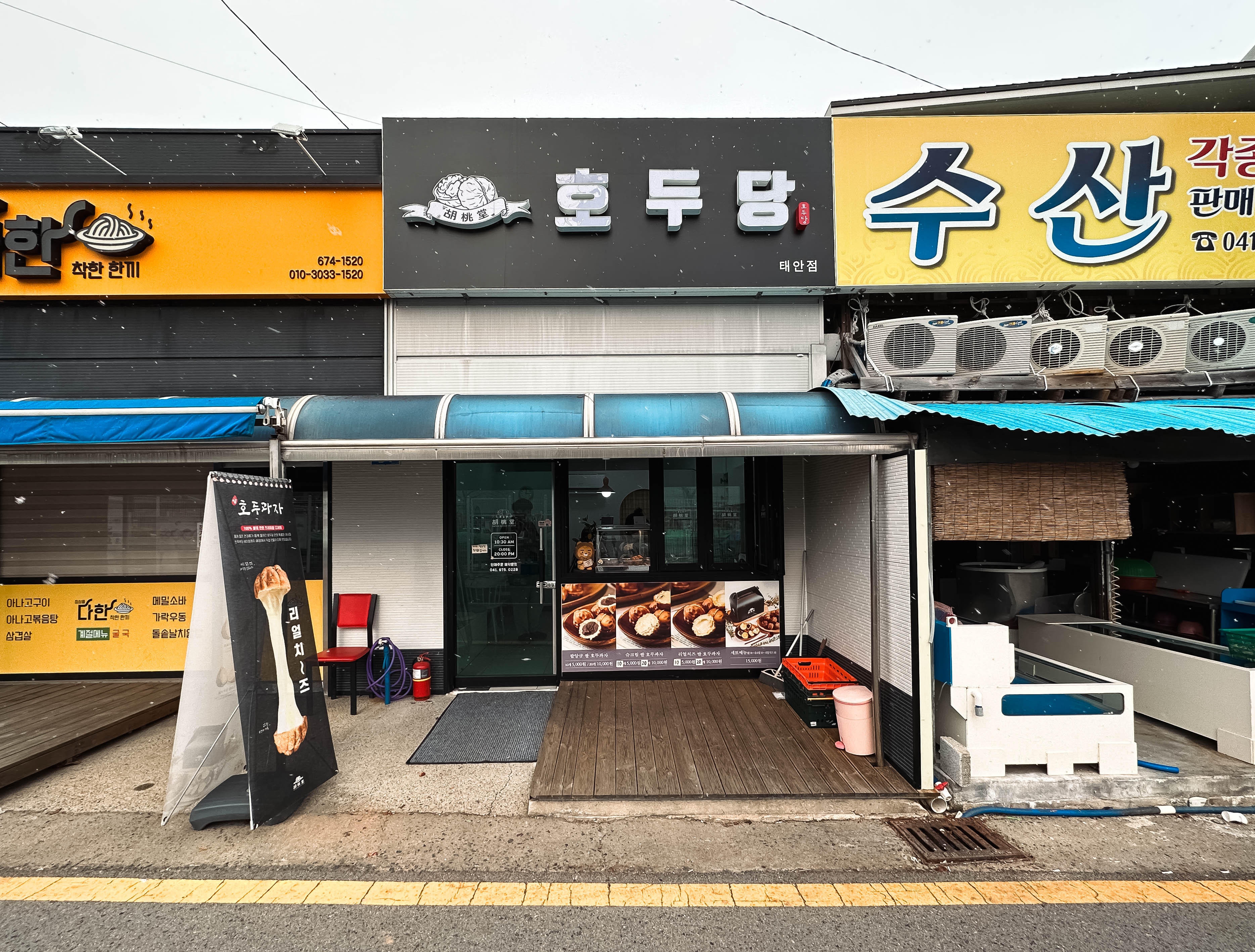 태안 호두과자 전문점 호두당은 충남 태안군 태안읍 남문리 165-2, 1층에 위치한 가게입니다. 가게의 영업시간은 10:30~20:00 까지였습니다. 가게 앞에는 입간판으로 리얼치~즈 호두과자의 모습을 홍보하고 있었습니다.