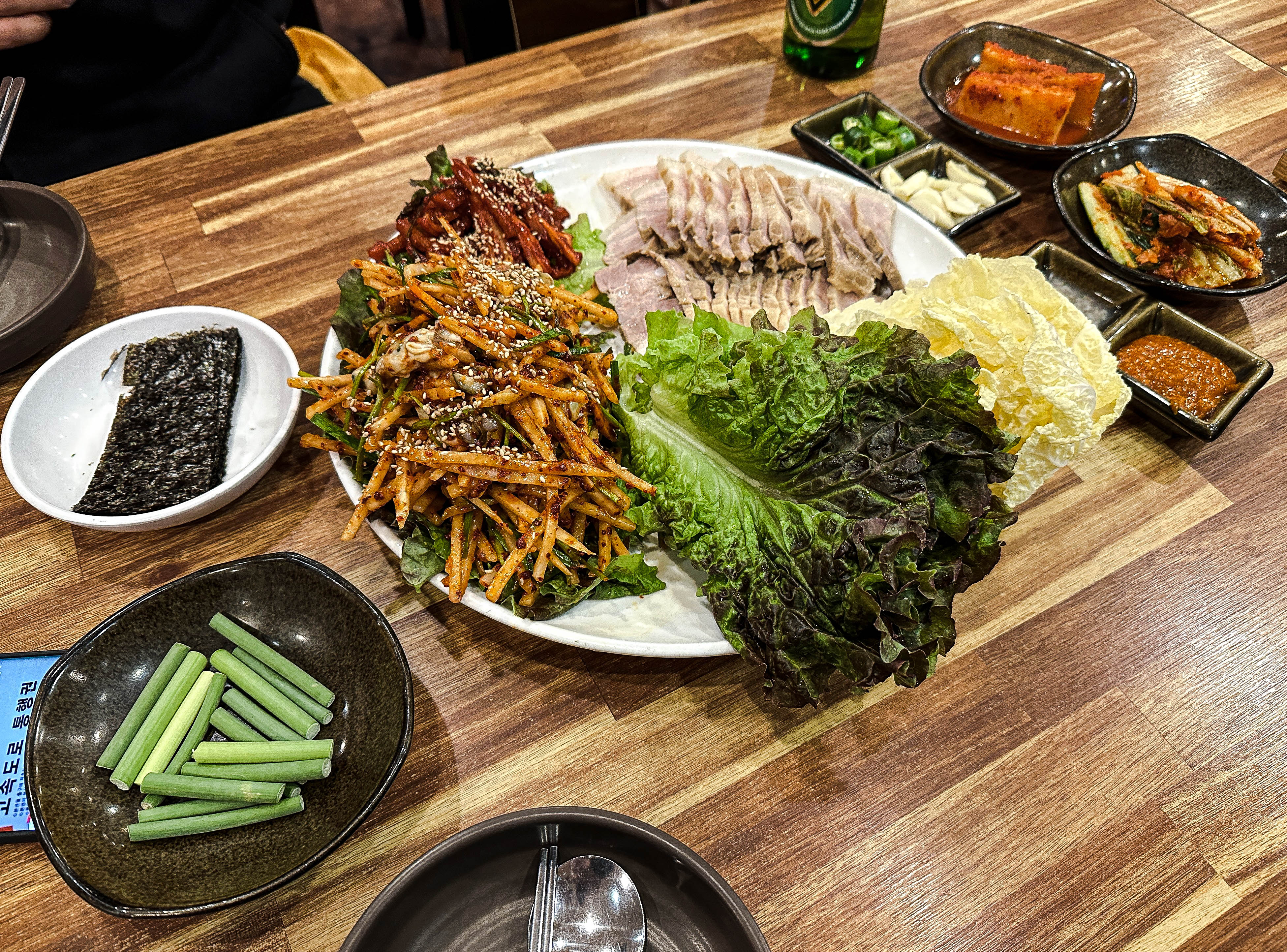 굴보쌈은 김, 마늘종, 무김치 등이 나왔습니다. 보쌈에 곁들이는 무생채, 무말랭이도 함께 나왔습니다. 무생채엔 굴이 같이 무쳐져 나왔는데, 매콤새콤한 것이 입맛을 돋우기에 좋았습니다.
