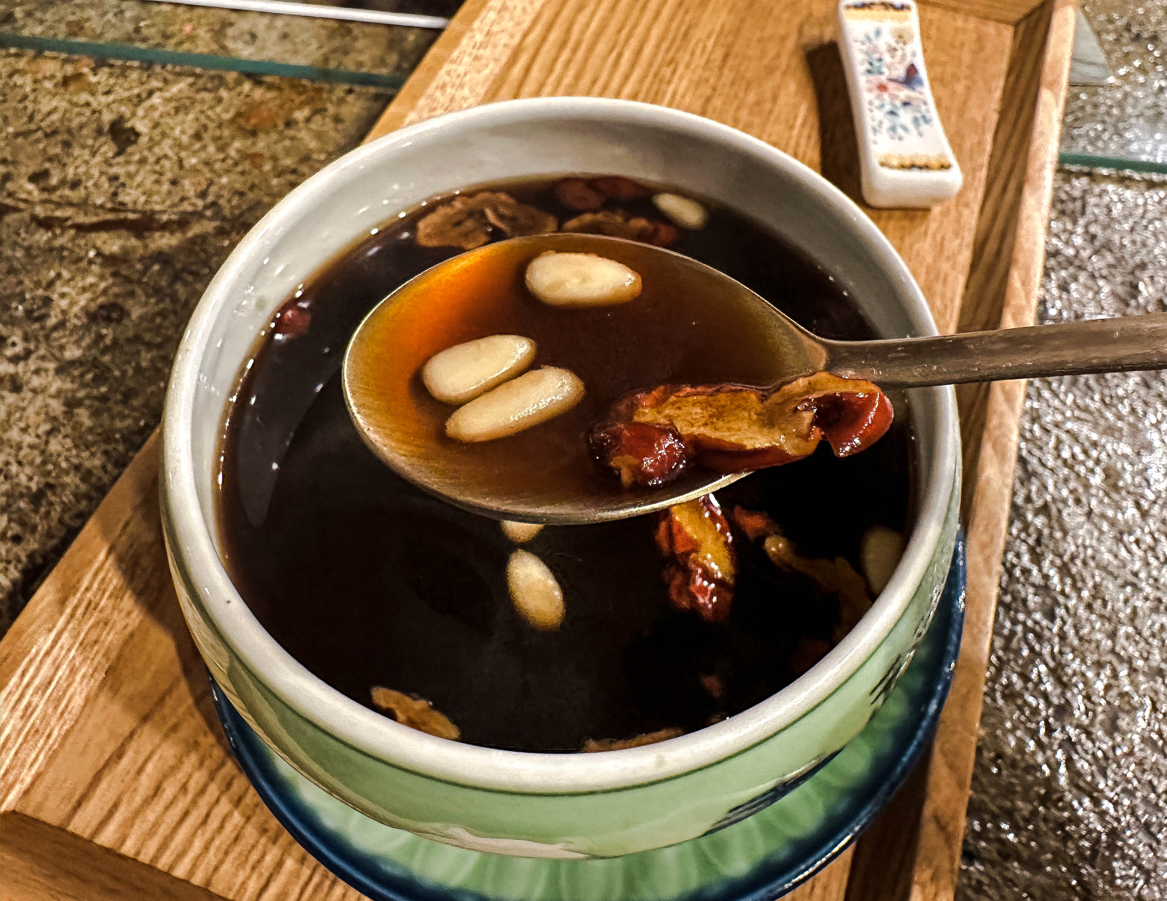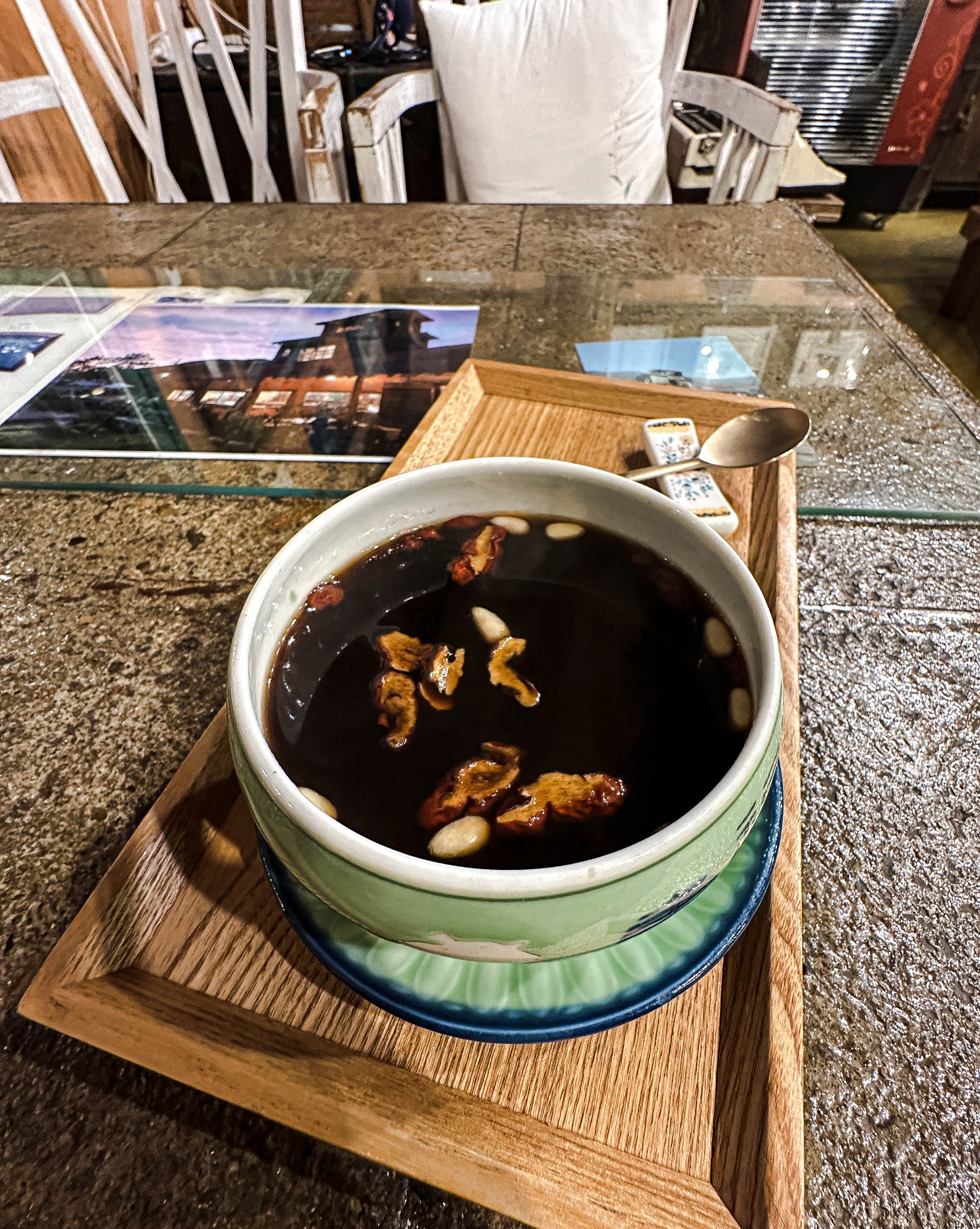 제가 주문한 음료는 이강조차 입니다. 이강조차는 배와 대추, 생강이 들어간 차로 단 맛이 특징인 차였습니다. 겨울철 쌀쌀한 날씨에 어울리는 음료를 찾다가 가게 분위기와도 잘 어울려서 주문했는데, 생각보다 맛도 좋았고 양도 넉넉했습니다.