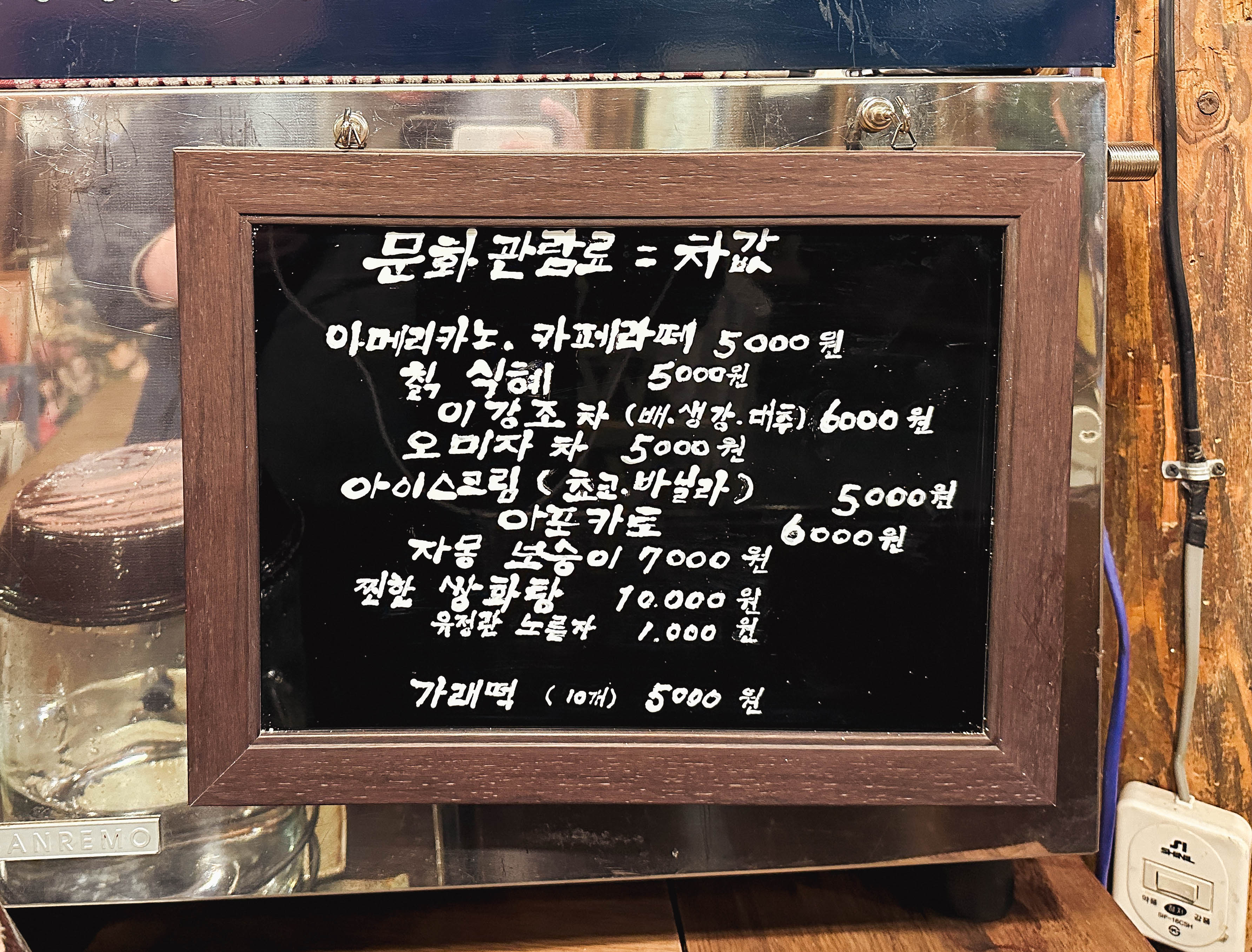 색장정미소는 골동품 가게 겸 카페로 운영 중인 가게였습니다. 물론 가게 이름처럼 정미소로 오랜 기간 운영되었던 장소를 현재는 레트로 카페로 운영하면서, 관람료와 찻값을 함께 받고 있었습니다. 메뉴는 아메리카노, 카페라떼, 칡식혜, 이강조차, 오미자차, 아이스크림, 아포카토, 자몽보숭이, 찐한쌍화탕, 유정란노른자, 가래떡 등이 있었습니다. 가격은 5천원~ 1만 원 대였습니다.