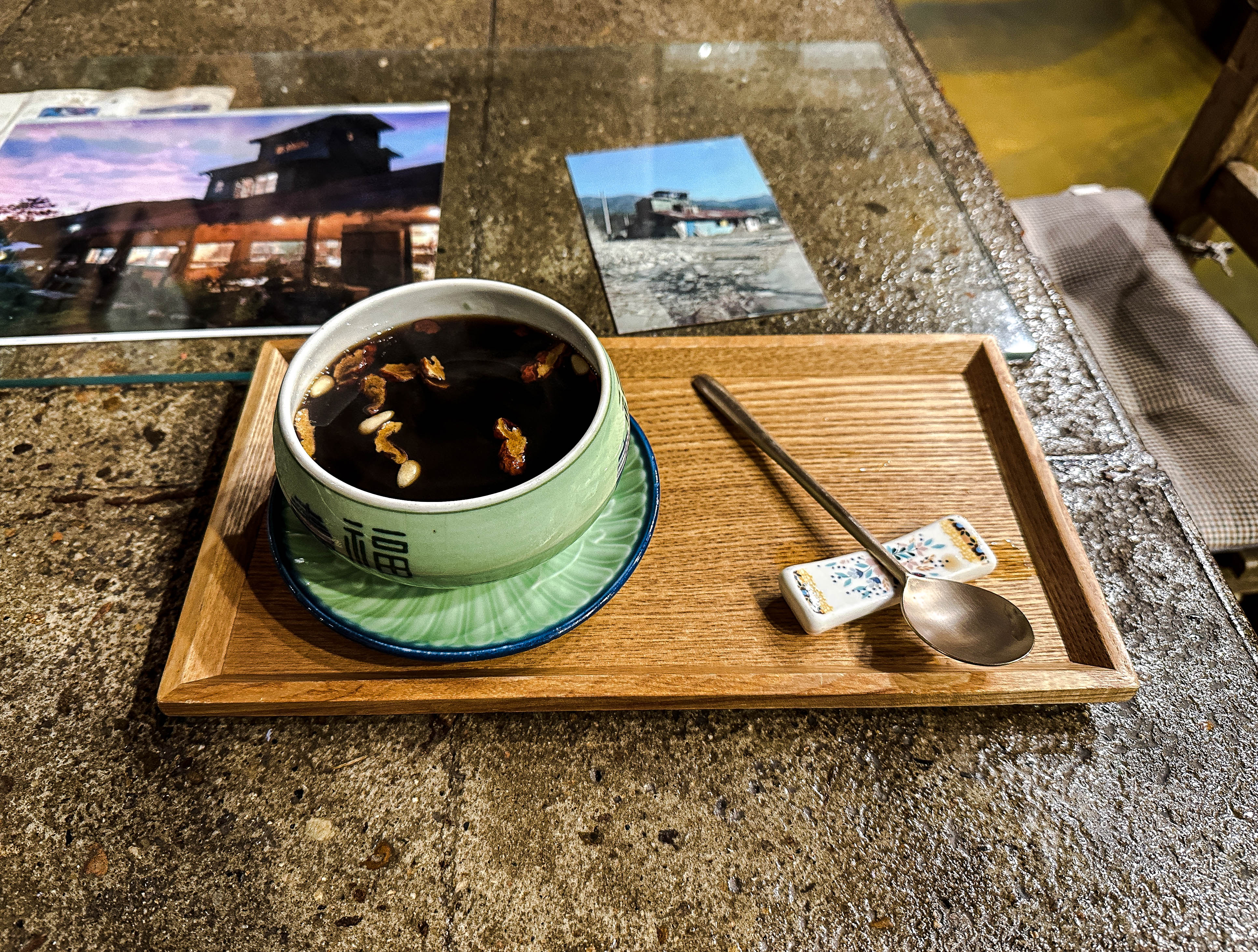 제가 주문한 음료는 이강조차 입니다. 이강조차는 배와 대추, 생강이 들어간 차로 단 맛이 특징인 차였습니다. 겨울철 쌀쌀한 날씨에 어울리는 음료를 찾다가 가게 분위기와도 잘 어울려서 주문했는데, 생각보다 맛도 좋았고 양도 넉넉했습니다.