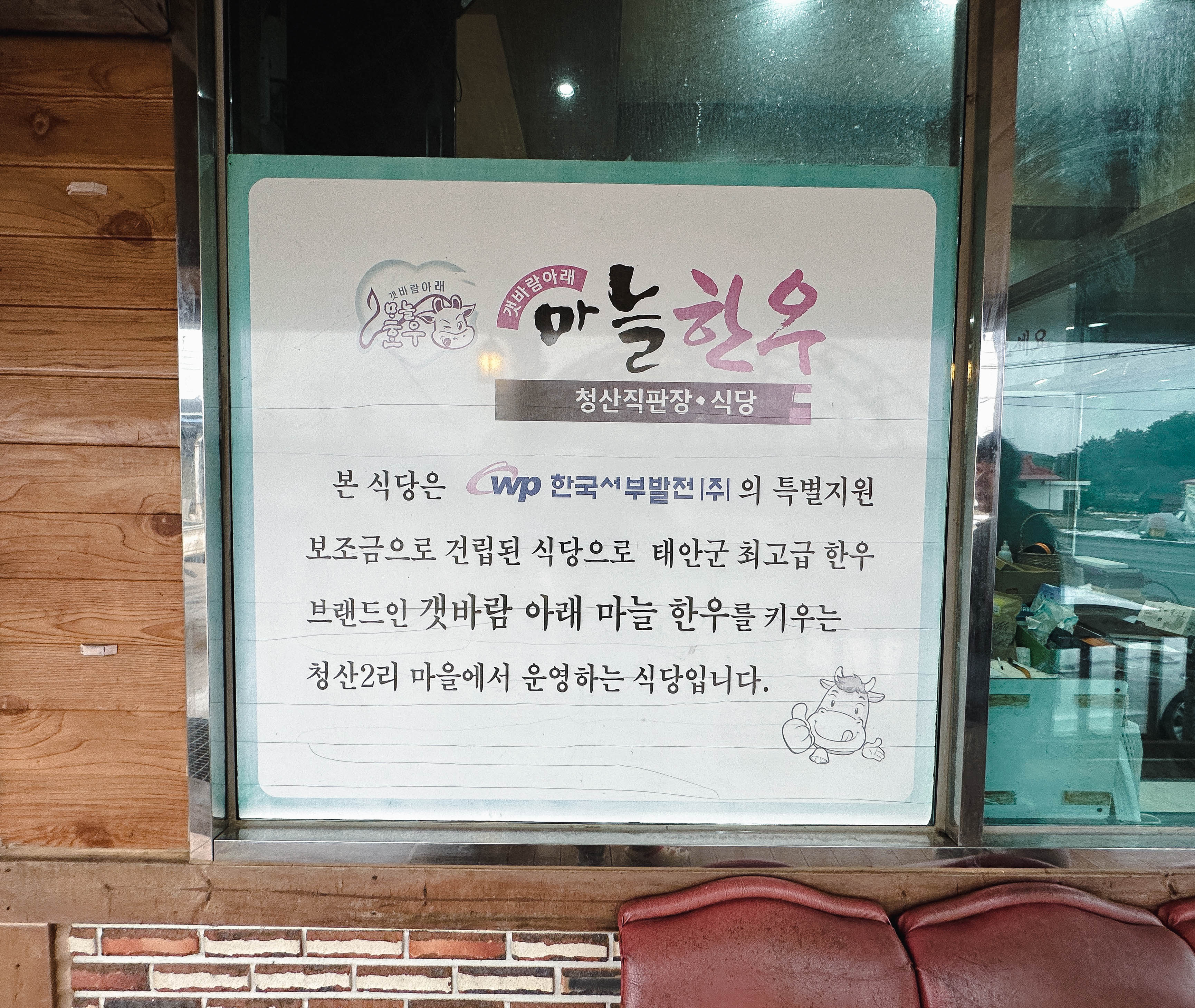 제가 다녀온 곳은 '갯바람아래 마늘한우 청산직판장' 이었는데, 지인과 함께 점심 식사를 먹기 위해 다녀온 가게입니다. 이곳은 한국서부발전의 특별지원 보조금으로 건립된 식당이라고 합니다.