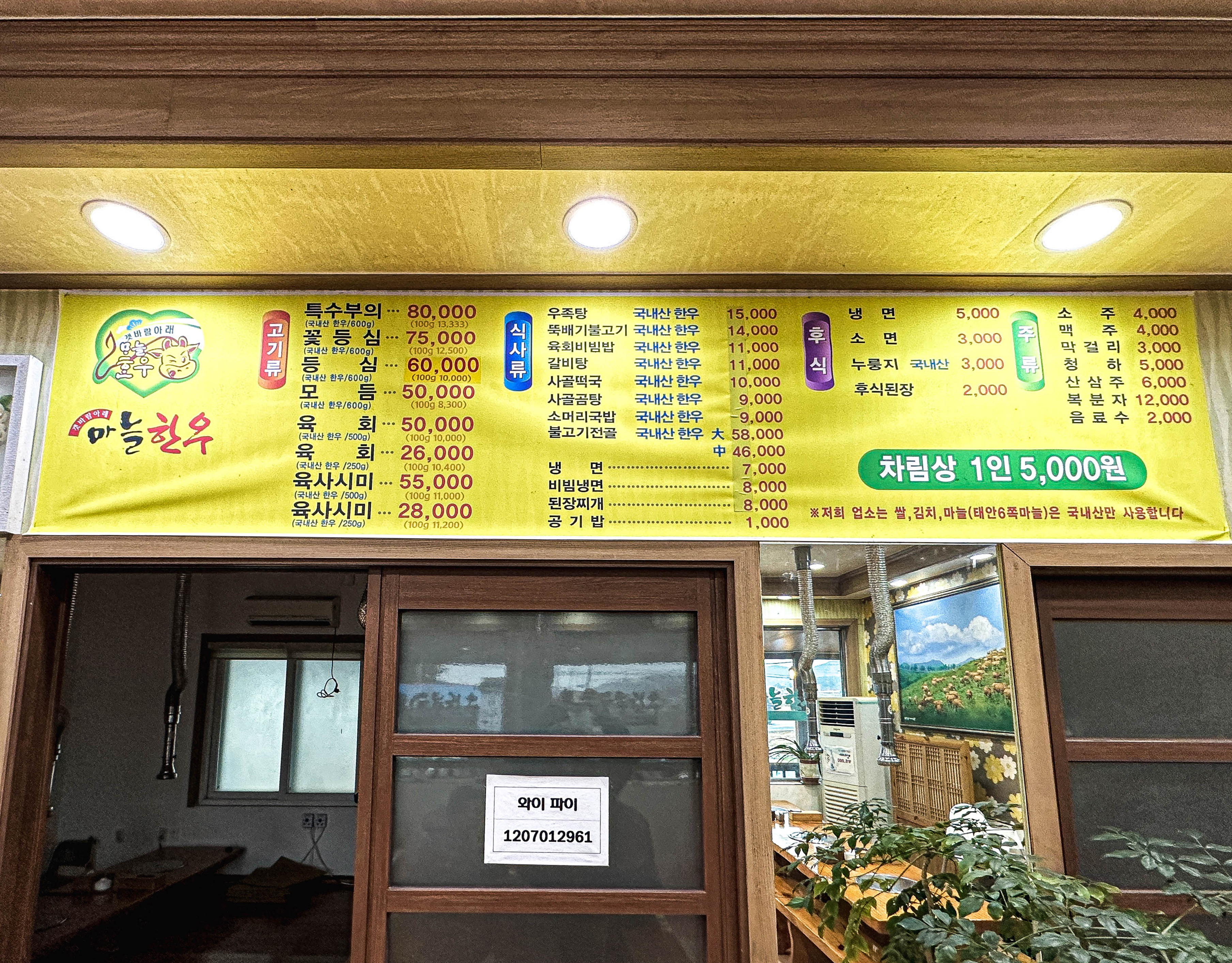태안 마늘한우 가게 뒤편에는 실제 키우고 있는 한우들의 모습을 볼 수 있었고, 식당에 대한 정보가 적혀있는 안내문구를 볼 수 있었습니다. 메뉴는 특수부위, 꽃등심, 등심, 모듬, 육회, 육사시미, 우족탕, 뚝배기불고기, 육회비빔밥, 갈비탕, 사골떡국, 사골곰탕, 소머리국밥, 불고기전골, 냉면, 비빔냉면, 된장찌개 등을 판매하고 있었습니다.