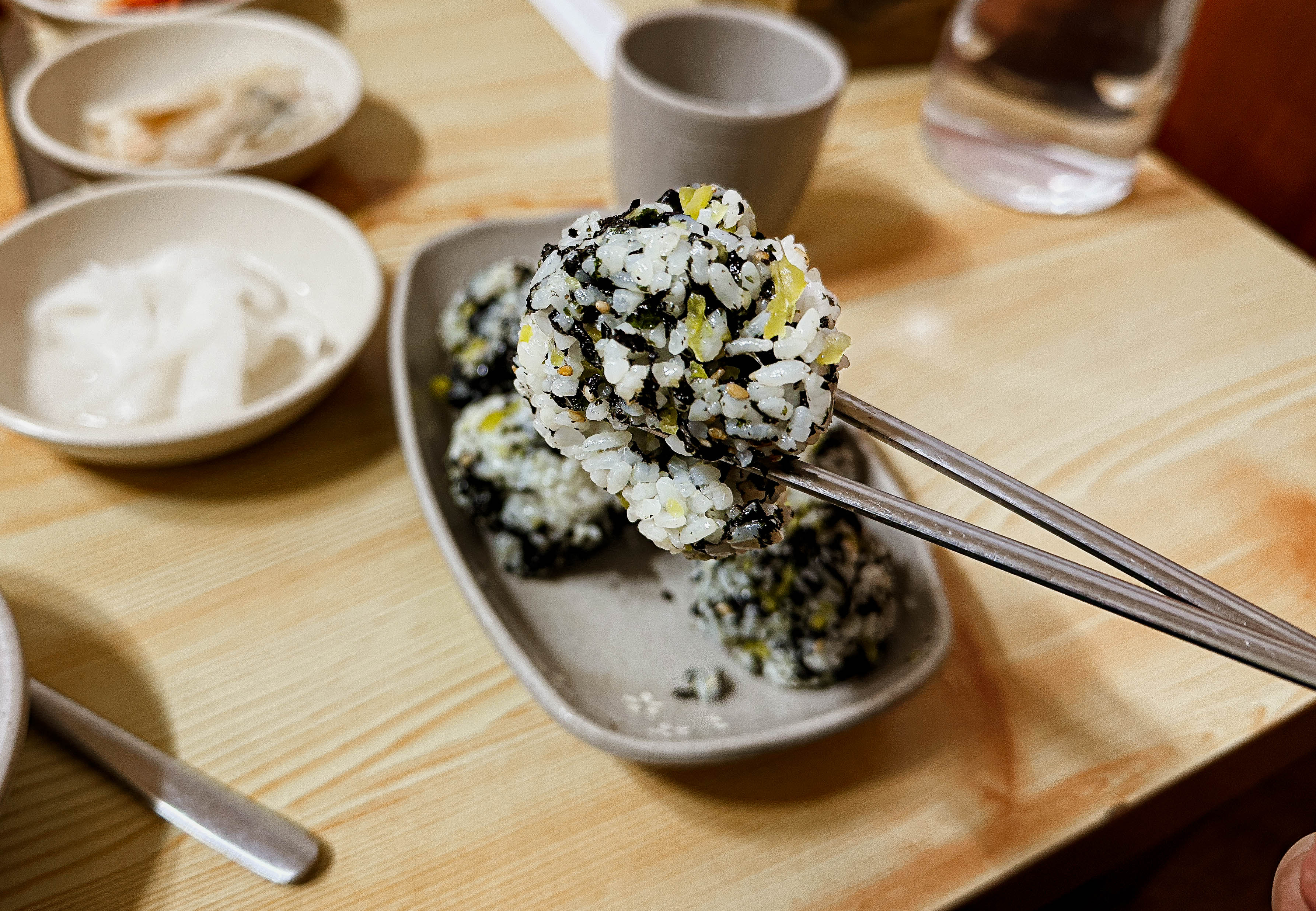 족발을 먹고 있을 때 쟁반국수가 함께 나왔습니다. 매콤한 양념에 양배추, 대파, 깻잎, 면 등을 넣어 버무려 먹는 메뉴였는데, 4인 세트인데 양은 솔직히 1인분도 안되어 보이더라고요. 그냥 이 메뉴는 쟁반국수라고 하기보단 채소무침이라는 느낌이 들었습니다. 추가로 주먹밥을 주문했는데, 주먹밥은 우리가 흔히 알고 있는 김가루, 참깨, 단무지 등을 참기름 넣고 버무려 고소한 맛이 났습니다.