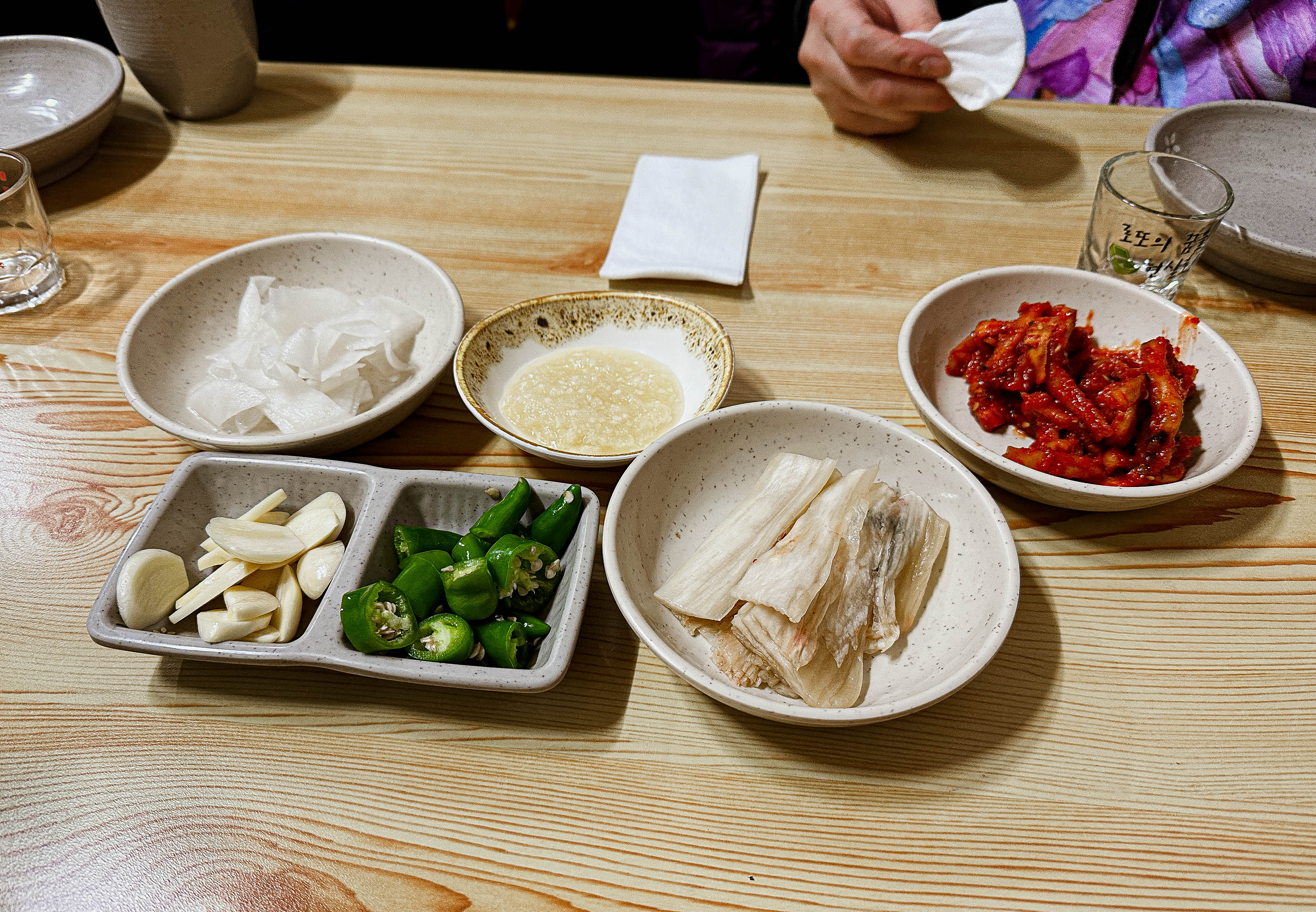 이 날 일이 많아서 저녁이 다 되어서 끝나서 그런지 따뜻한 방으로 들어가니 저절로 몸이 노곤해지는 느낌이더라고요. 족발은 꽤 두툼하게 썰어내어 주셨고, 밑반찬으로 무생채, 백김치, 콩나물국, 마늘소스 등이 나왔습니다. 함께 나온 소주도 같이 곁들였는데, 이 날 일도 고됐지만, 연말이라 잦은 술자리 때문에 그런지 몸이 피곤해서 금세 취기가 올라오더라고요.