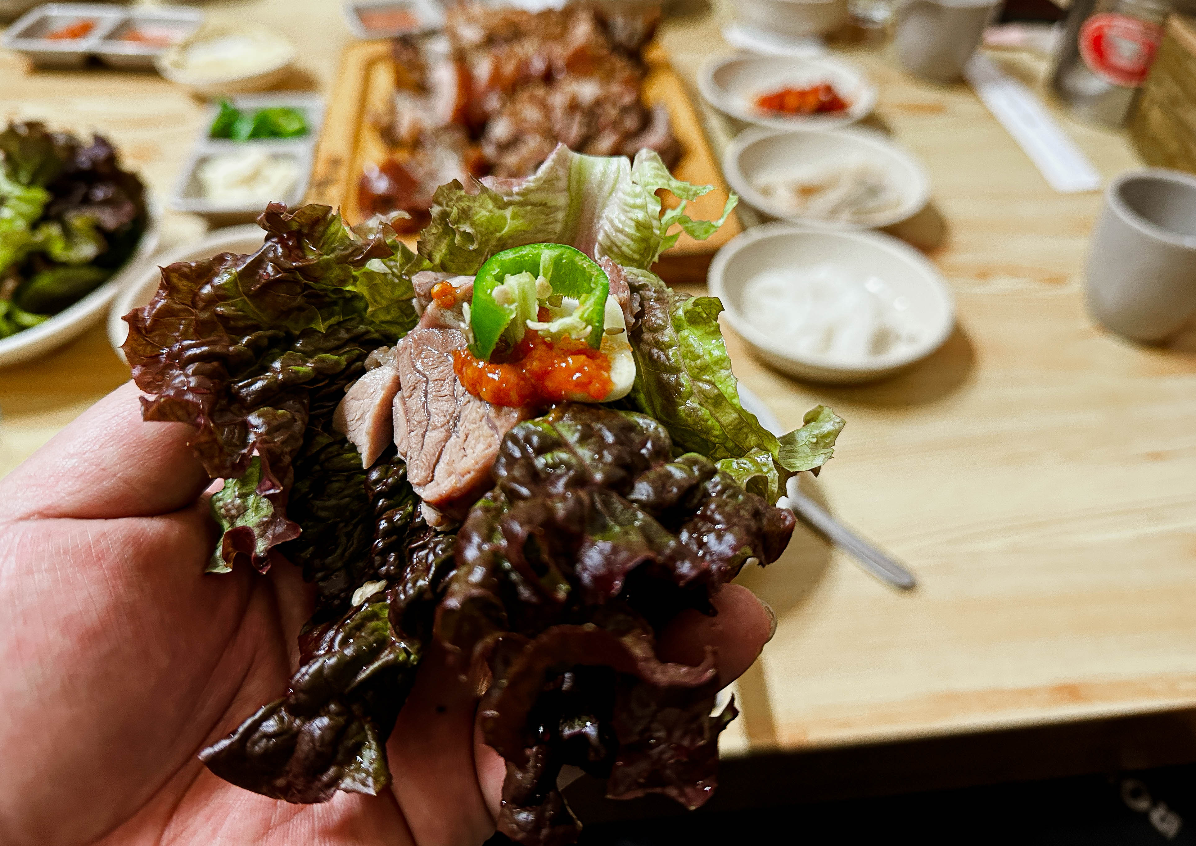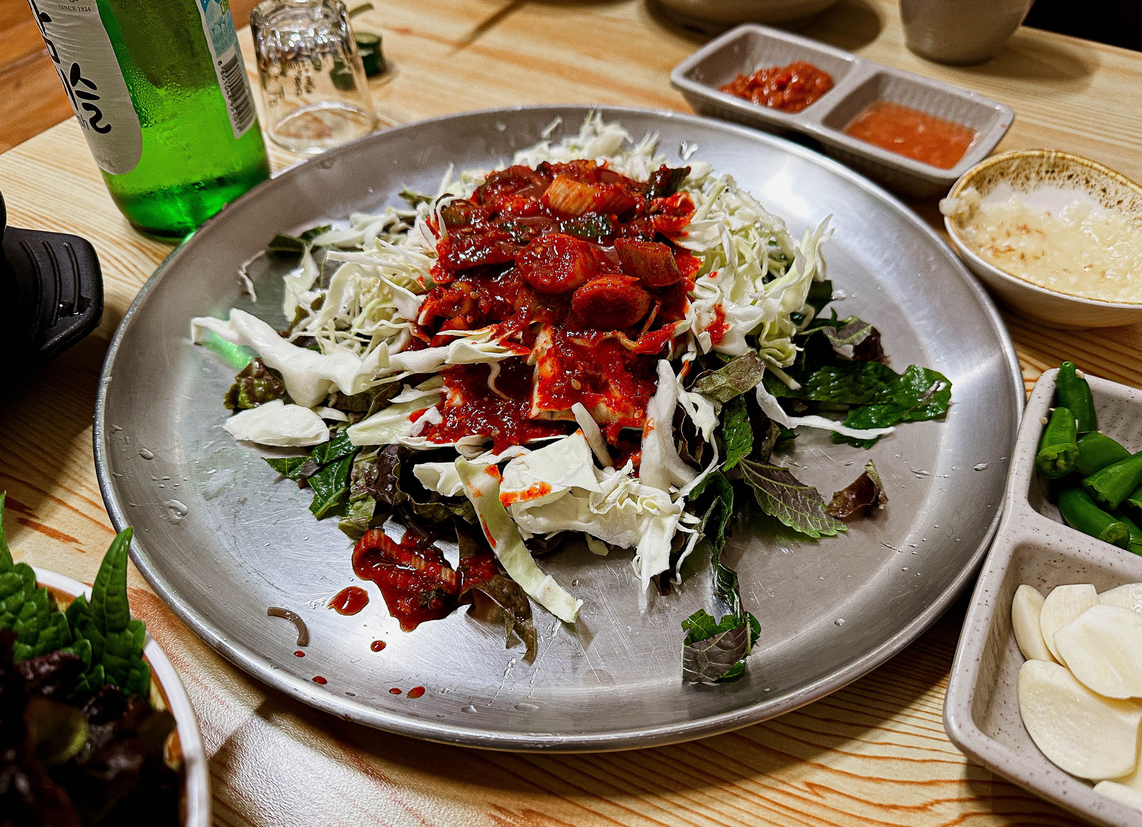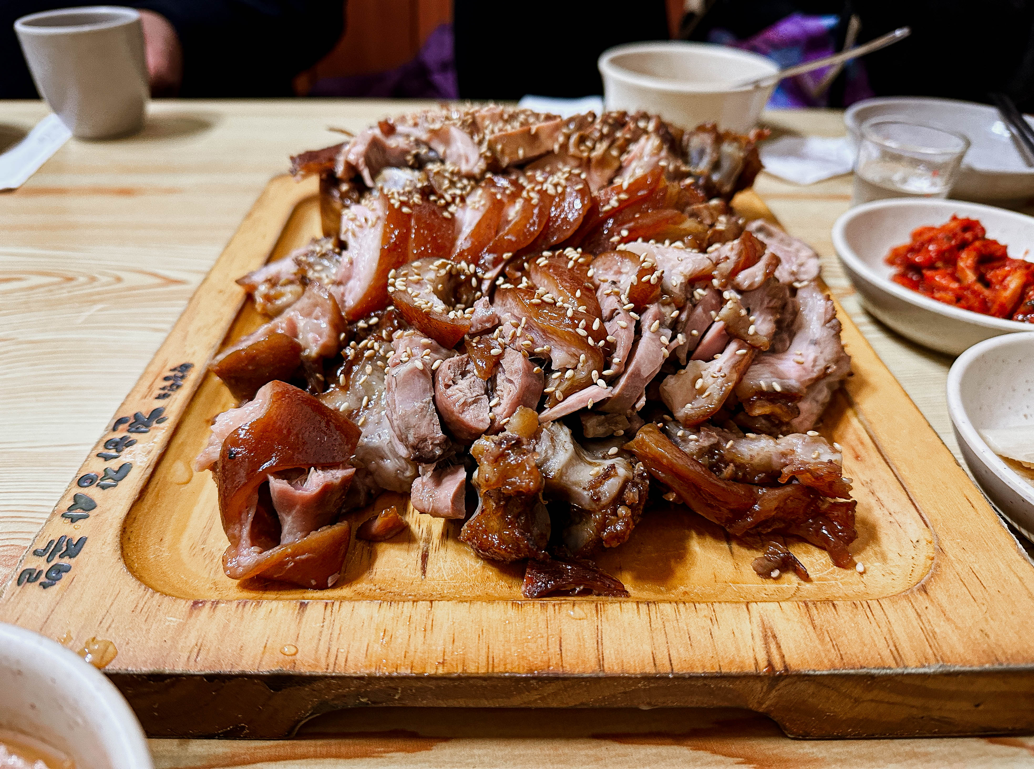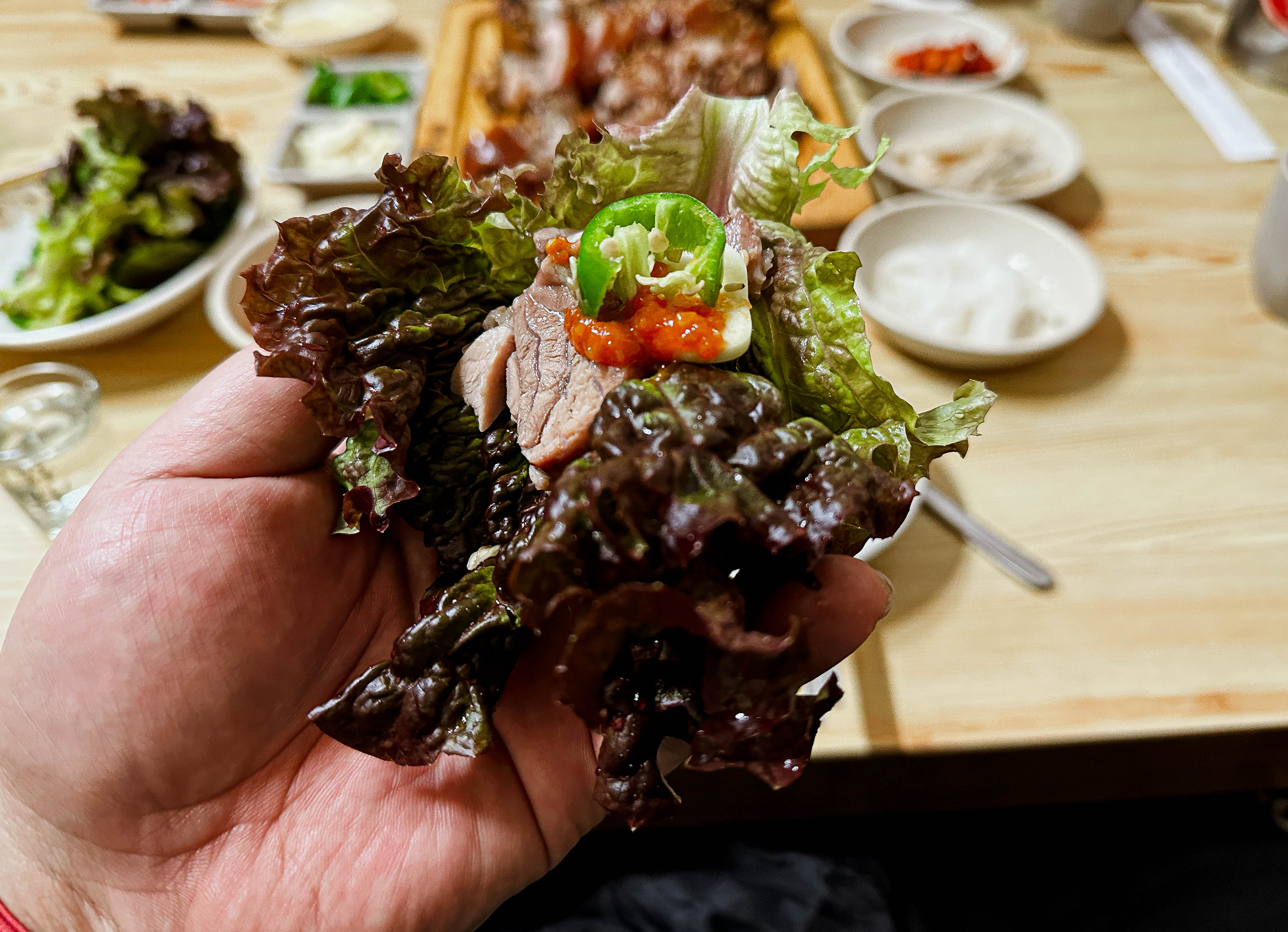 야들야들 부드러운 식감의 족발은 잡내도 없이 맛있었고, 특히 함께 내어주신 마늘소스랑도 잘 어울렸습니다. 저도 나이를 먹었는지 족발을 마늘이랑 고추랑 같이 곁들여 쌈을 싸서 먹어야 덜 느끼하더라고요. 또 상추가 졸음을 유발한다고(?) 하니, 다음날 일정을 위해 많이 먹어두었죠.