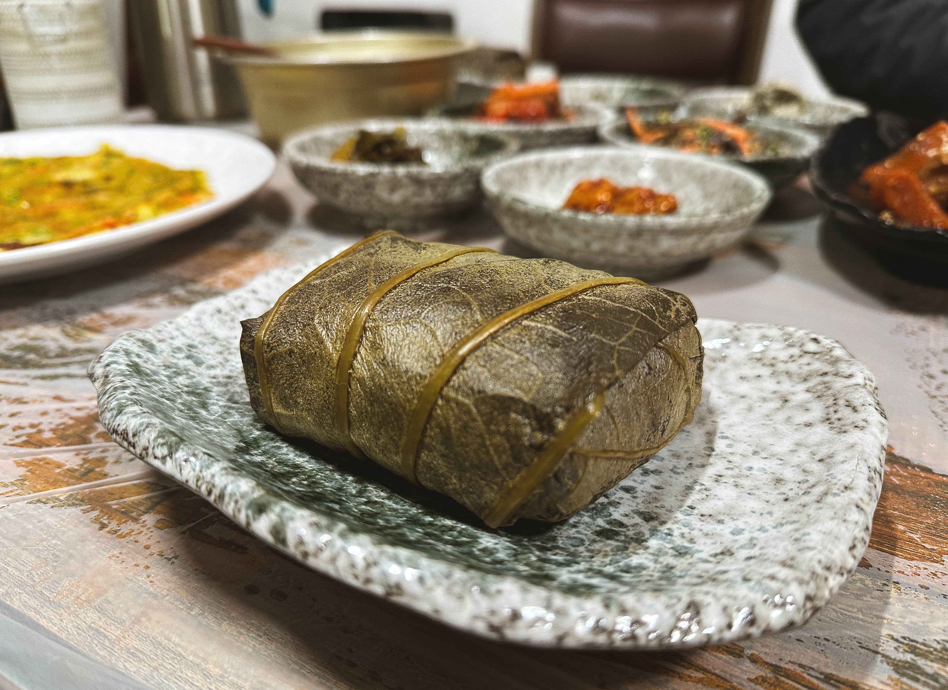 산장가든의 메뉴는 연잎밥을 포함한 12가지 정도의 국과 반찬들이 나왔습니다. 밥은 연잎에 쌓여 나오는데, 찰기가 있는 잡곡밥이 들어있었습니다. 연잎밥을 원치 않는 분은 일반 공기밥으로도 받을 수 있는 것 같았습니다.