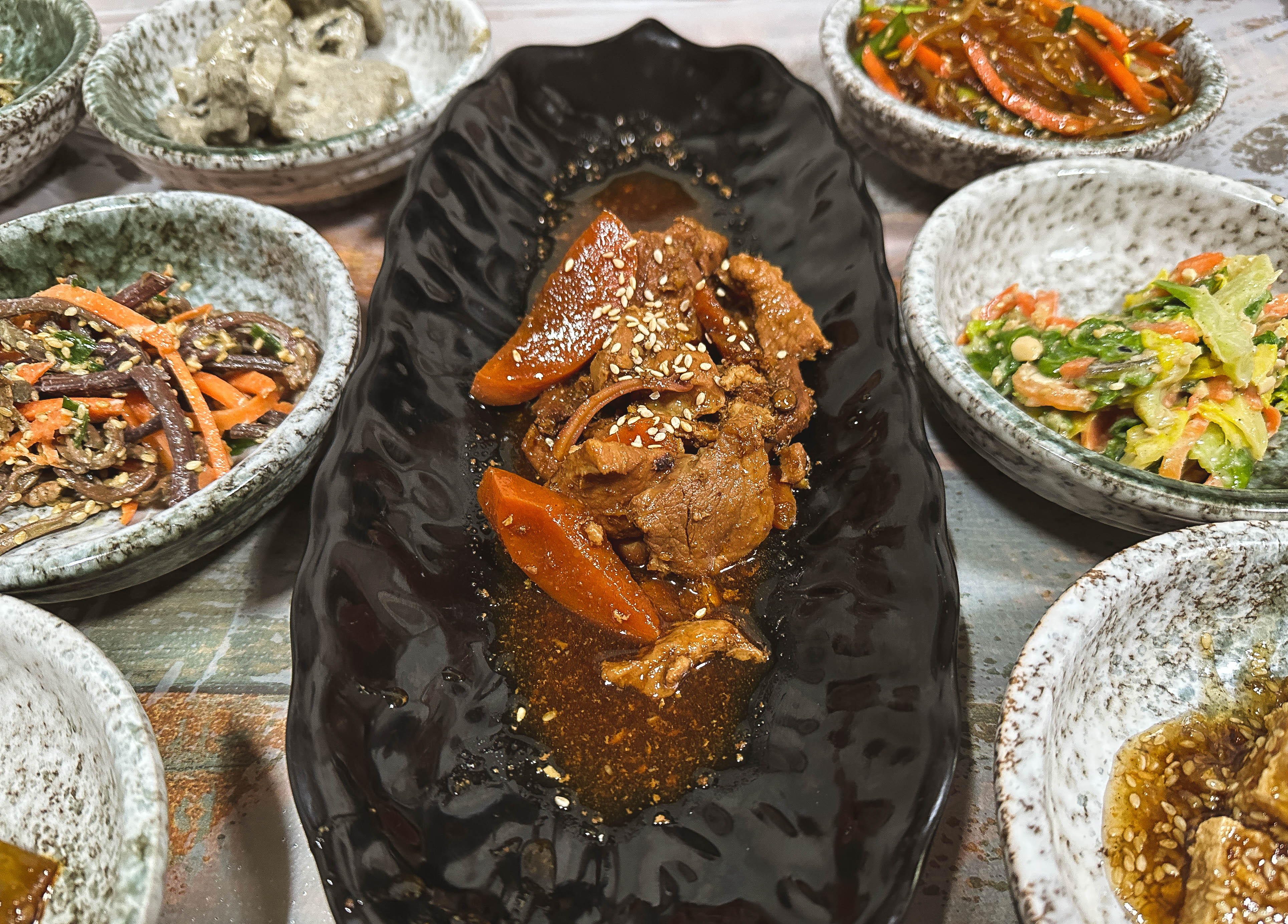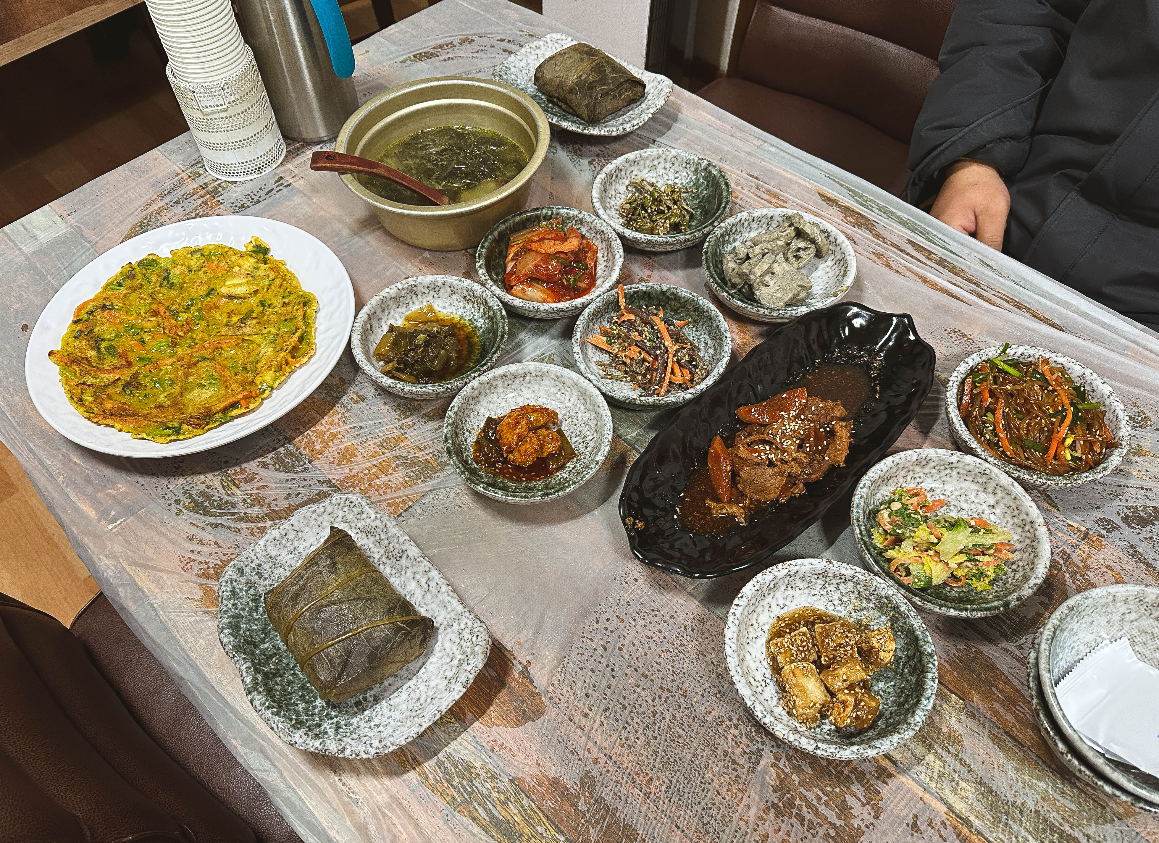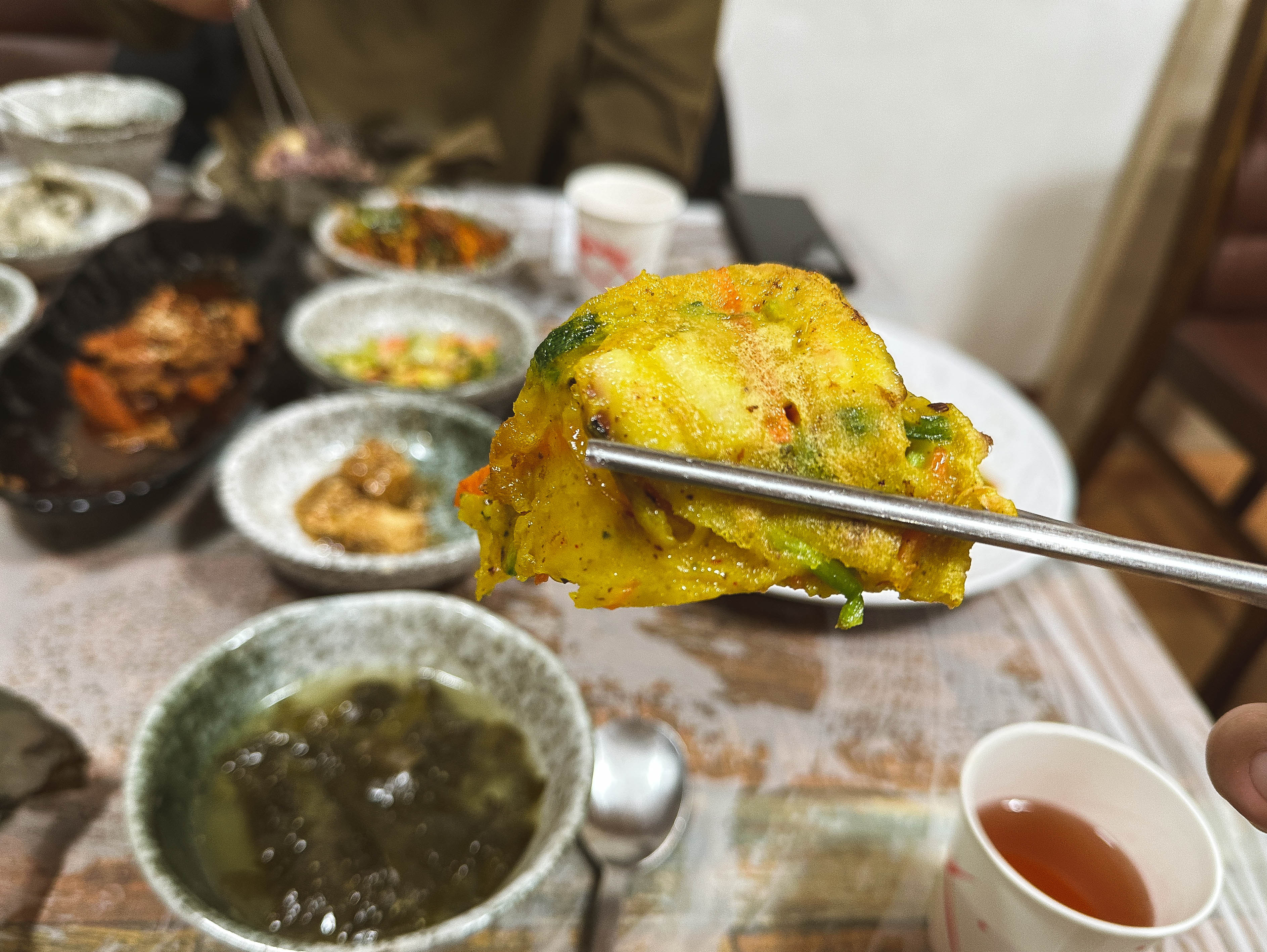 반찬은 오징어제육볶음, 멸치볶음, 갓장아찌, 두부강정, 어묵볶음, 미역국, 잡채, 해물파전 등이 있었습니다. 반찬들의 간은 전체적으로 심심한 편이었는데, 저는 음식을 짜게 먹는 편은 아니어서 입맛에 잘 맞았습니다.