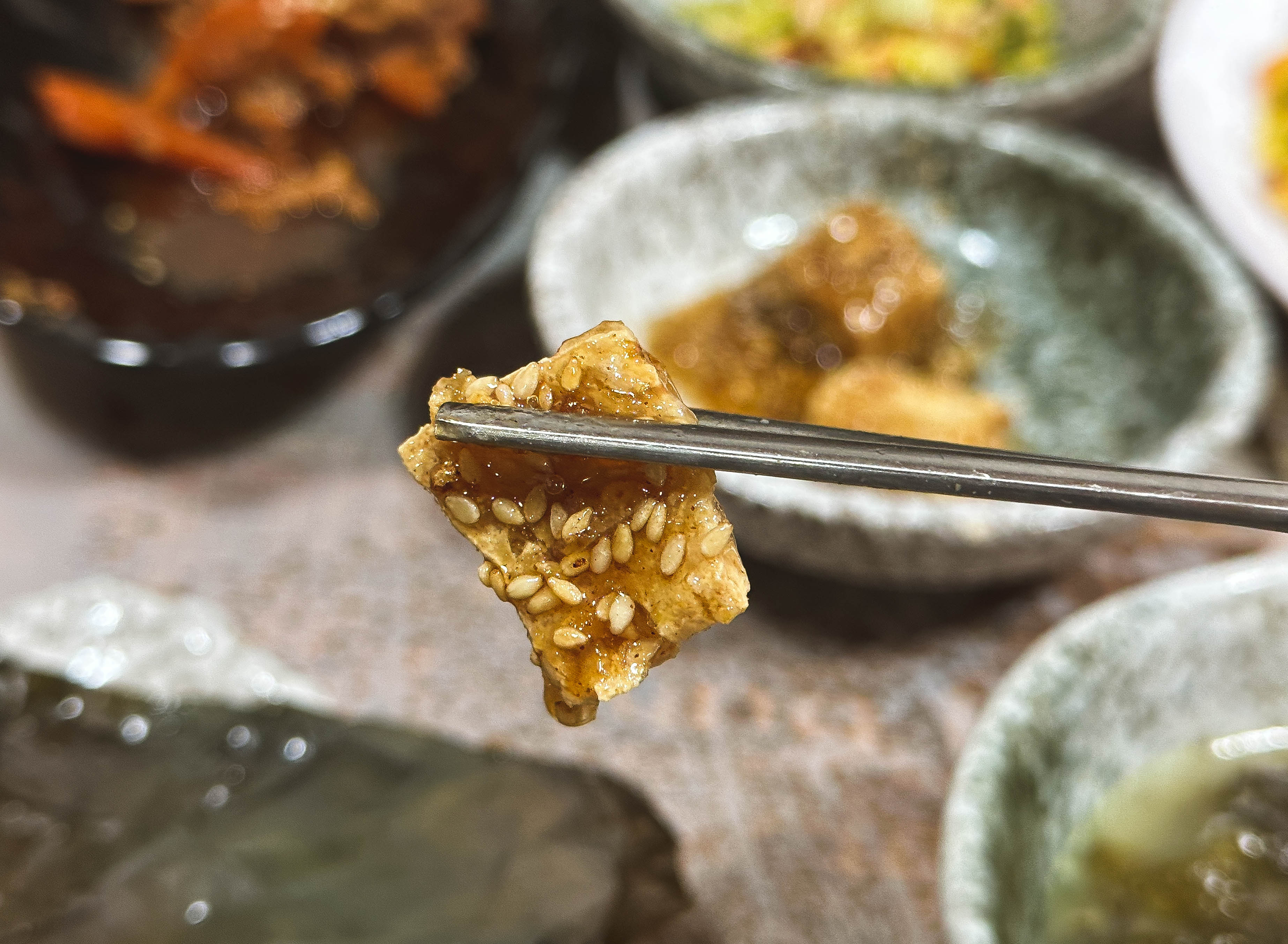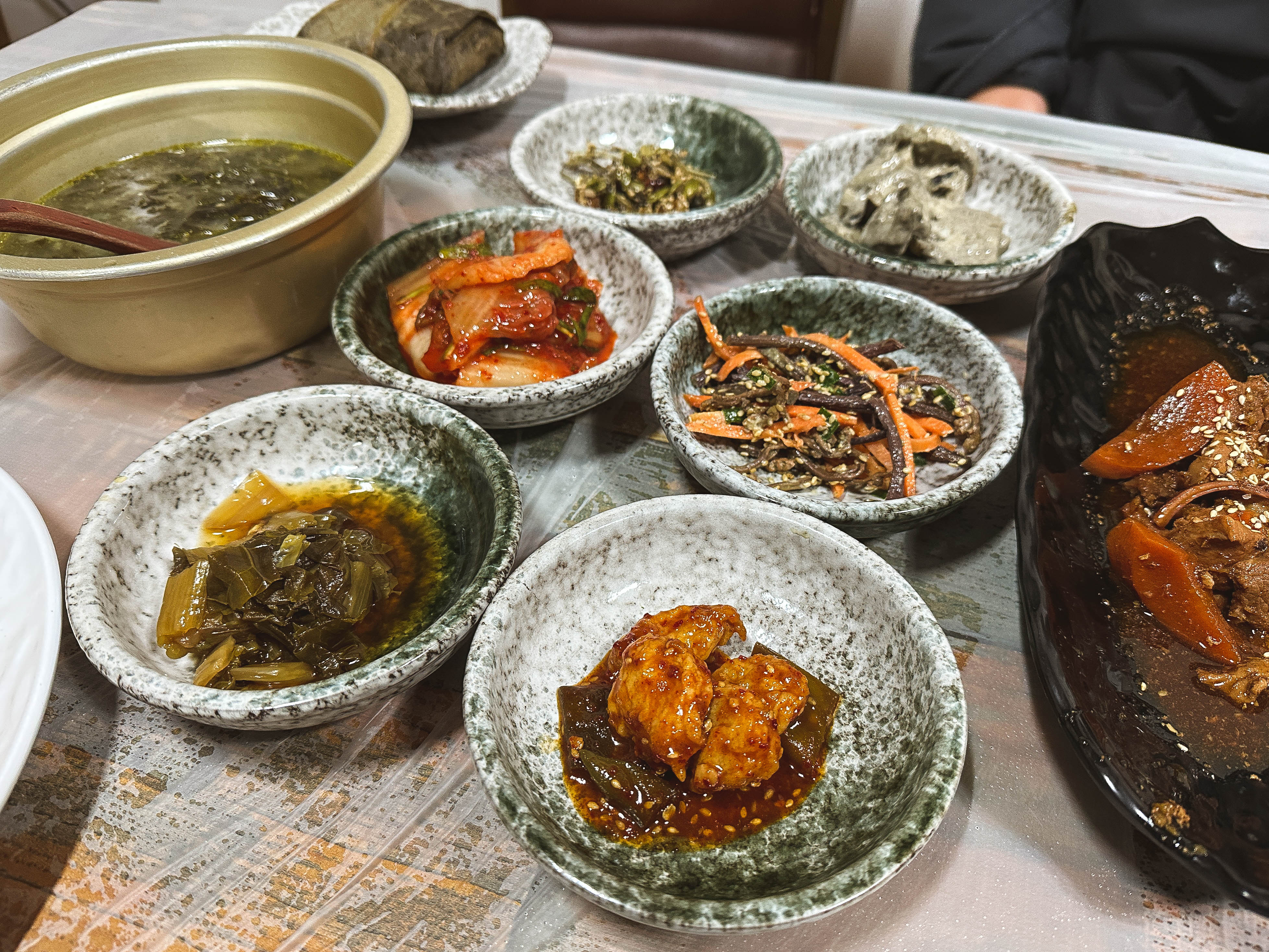 반찬은 오징어제육볶음, 멸치볶음, 갓장아찌, 두부강정, 어묵볶음, 미역국, 잡채, 해물파전 등이 있었습니다. 반찬들의 간은 전체적으로 심심한 편이었는데, 저는 음식을 짜게 먹는 편은 아니어서 입맛에 잘 맞았습니다.